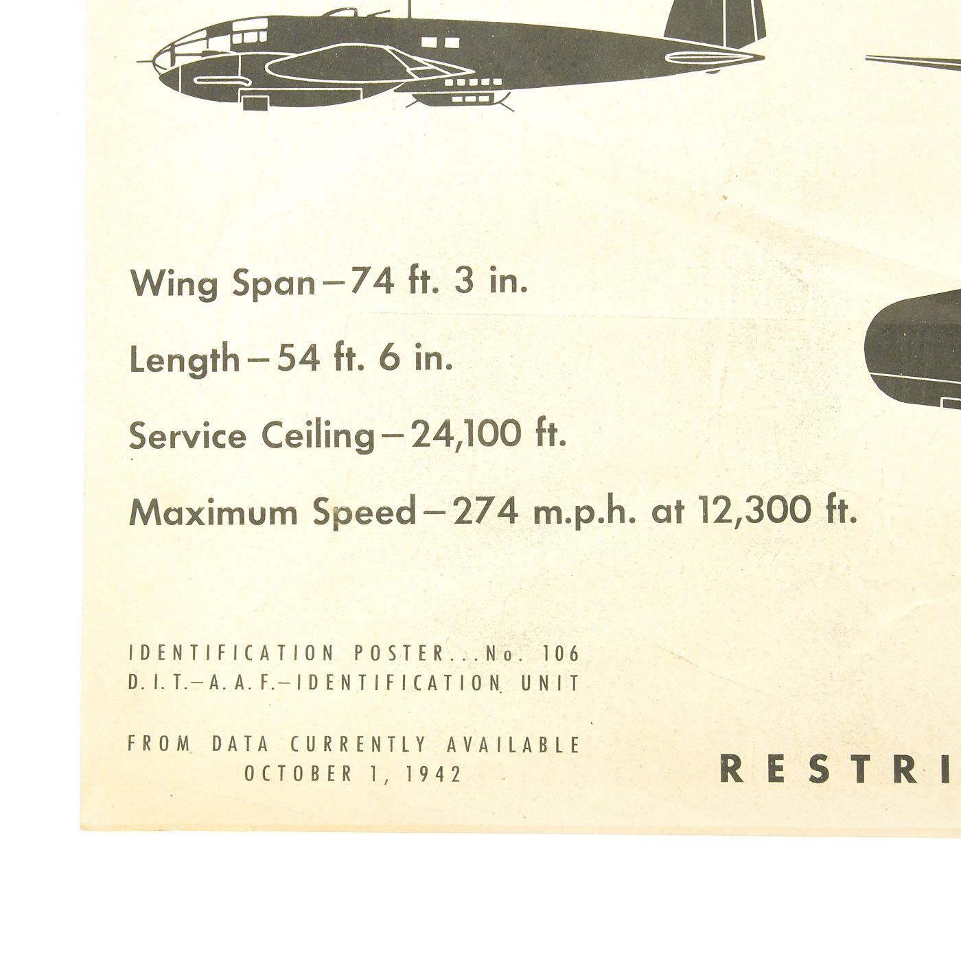 For this reason, the Identification unit of the Army Air forces put out a series of identification posters, each measuring 14"W x 20"H. These would include multiple views of the aircraft, and highlighted specific features that could be used to aid in identification. The three we have here all indicate they were developed in 1942, and all three are deemed RESTRICTED.