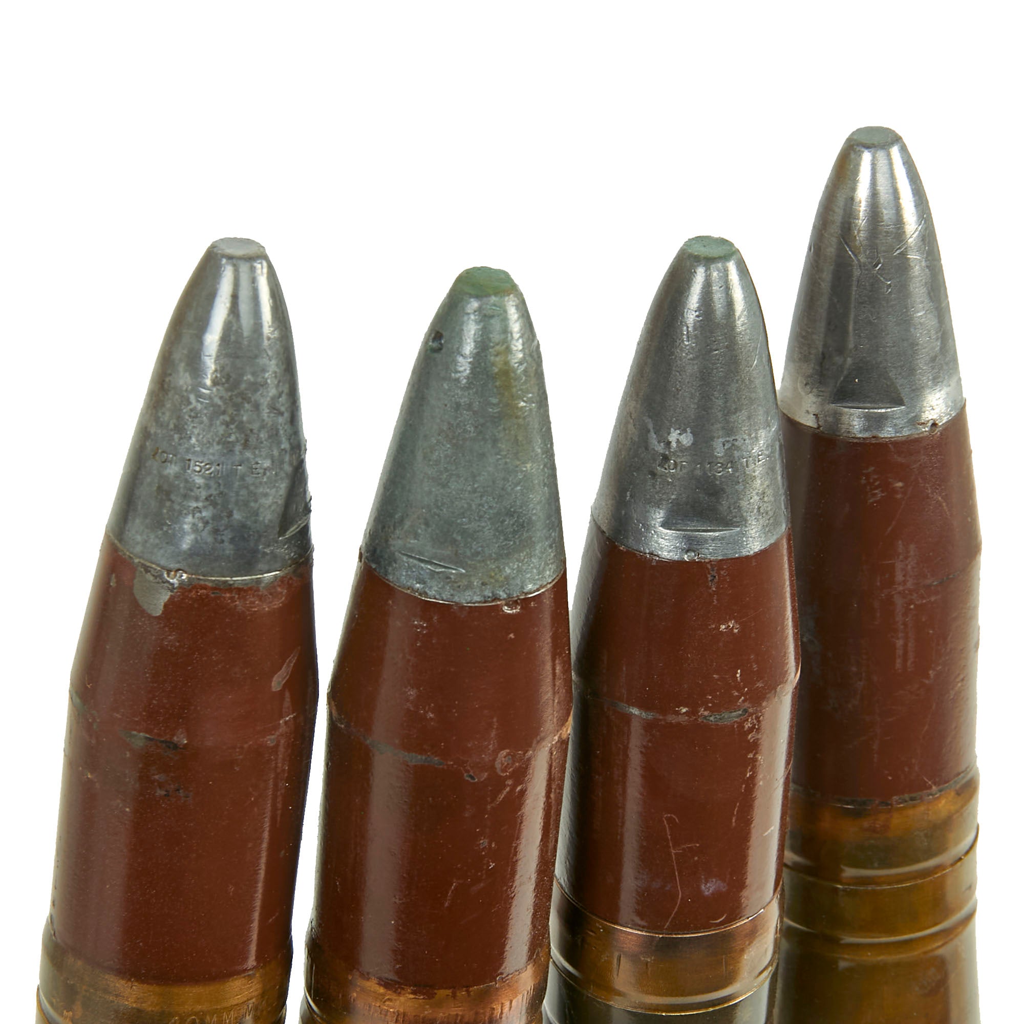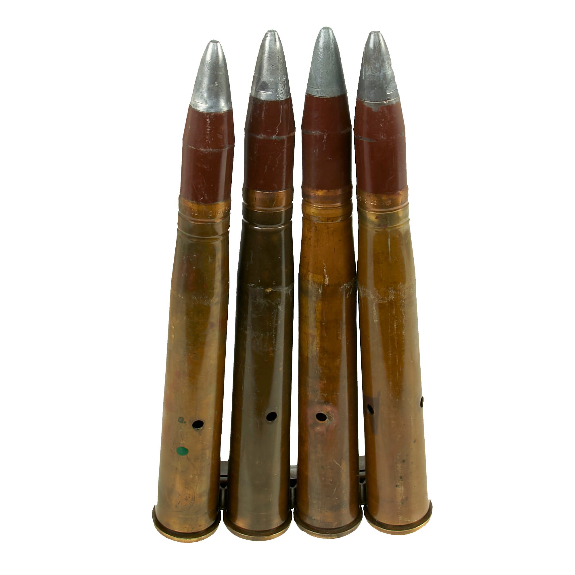 These are genuine World War Two dated 40mm Bofors gun rounds in a clip. Each round bears either a 1942 or 1943 date on the piece that connects the shell and projectile, with those same dates being found on the bottom of the shells. The rounds are all similar-looking and make for a fantastic display. Each projectile measures approximately 17 3/4" long. The clip the rounds are in is a U.S. NAVY BU. ORD. marked example which is also marked with NOs. 97263 / DR. NO. 328801. All four rounds have holes drilled into the sides of the shells as part of the demilling process.
