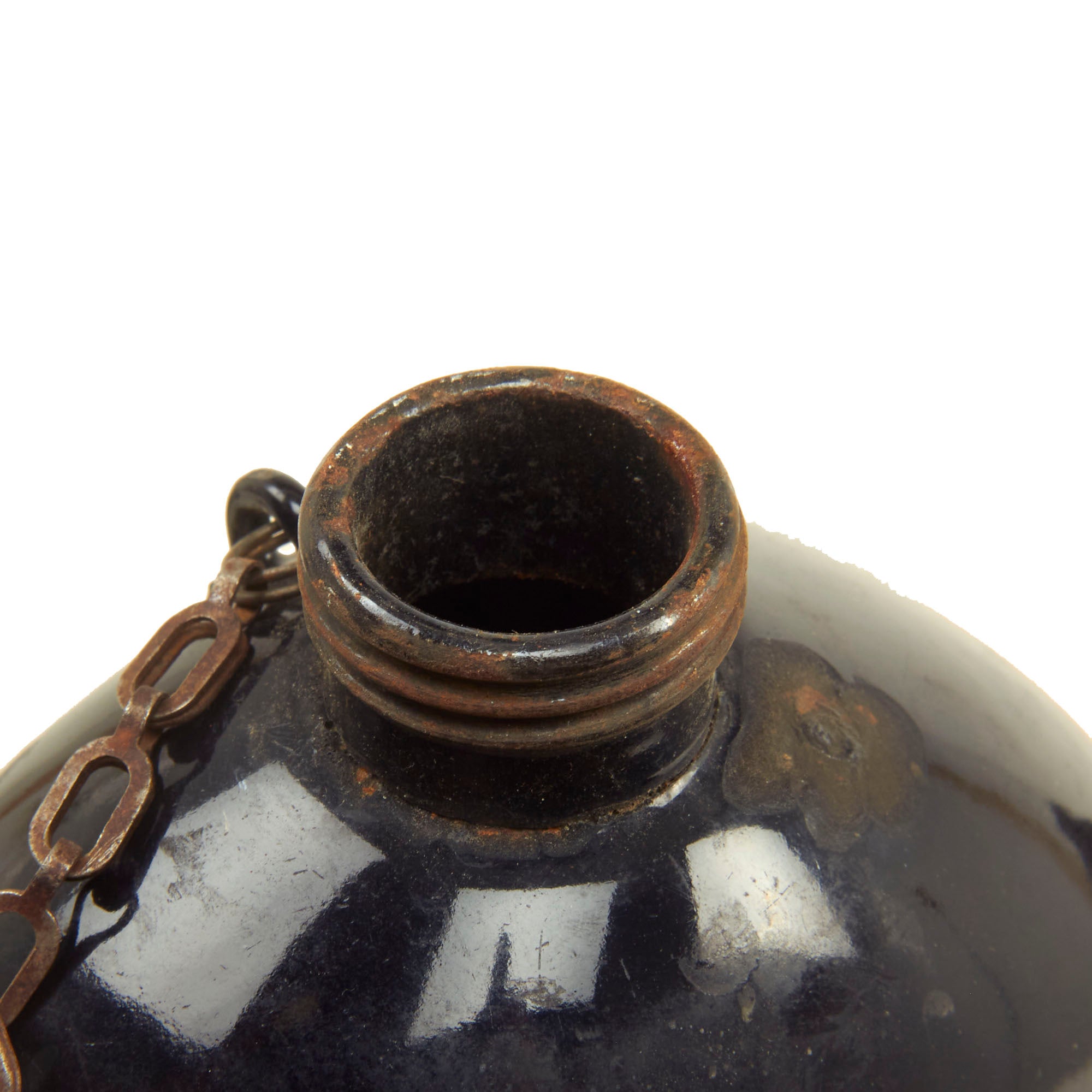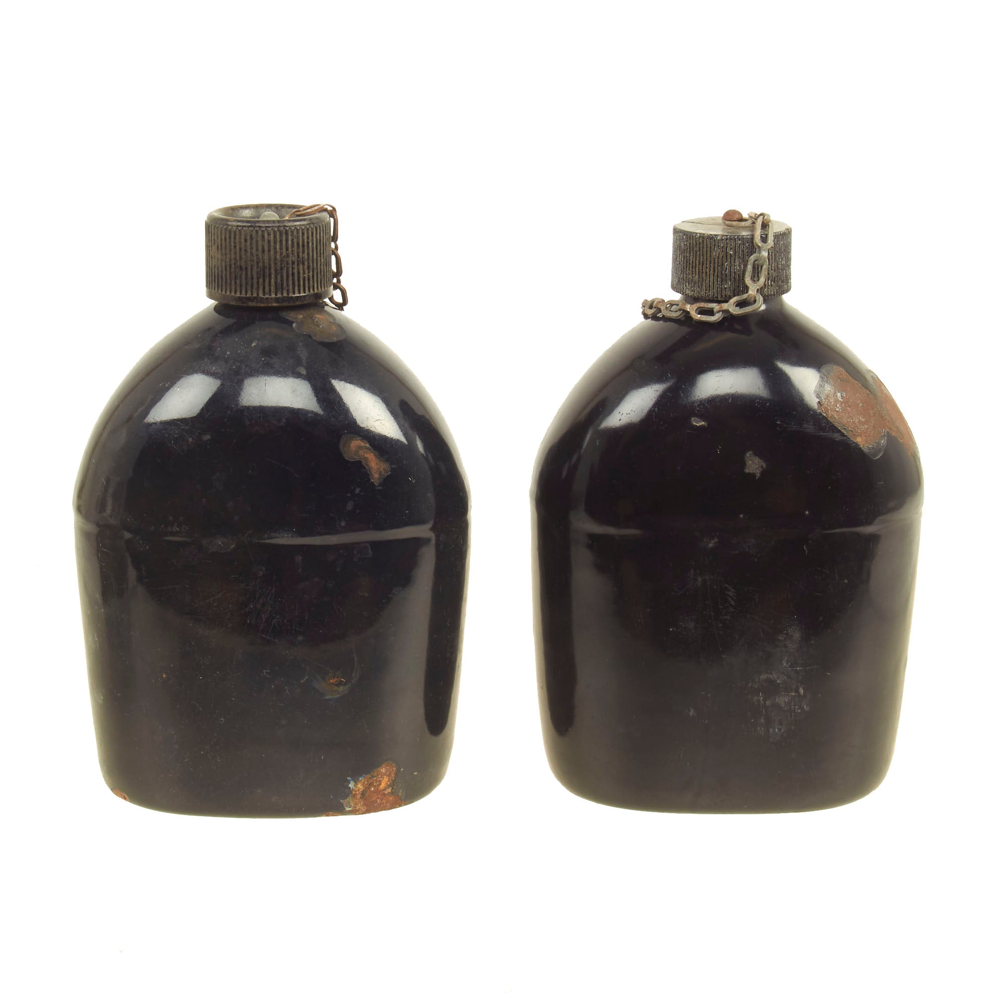 This is a very nice set of two very good condition M1942 black porcelain canteen bottles, both of which are dated 1942 on the bottom. Both show some denting on the exterior, which has resulted in loss of the porcelain and subsequent oxidation. Both have their original caps and chains, but are missing the washers.