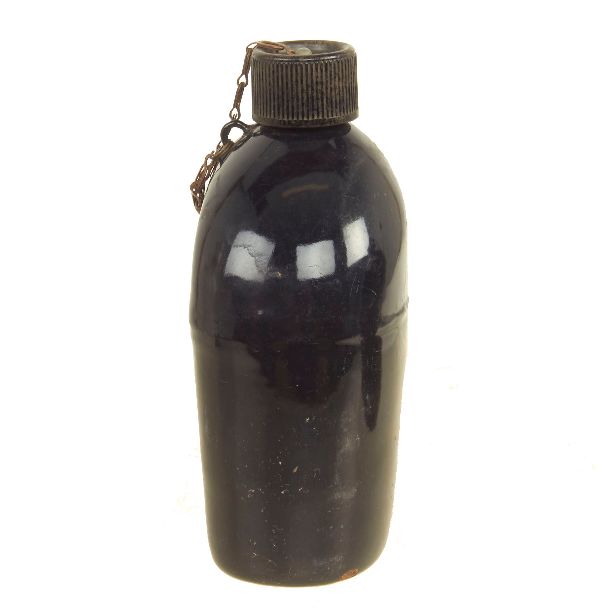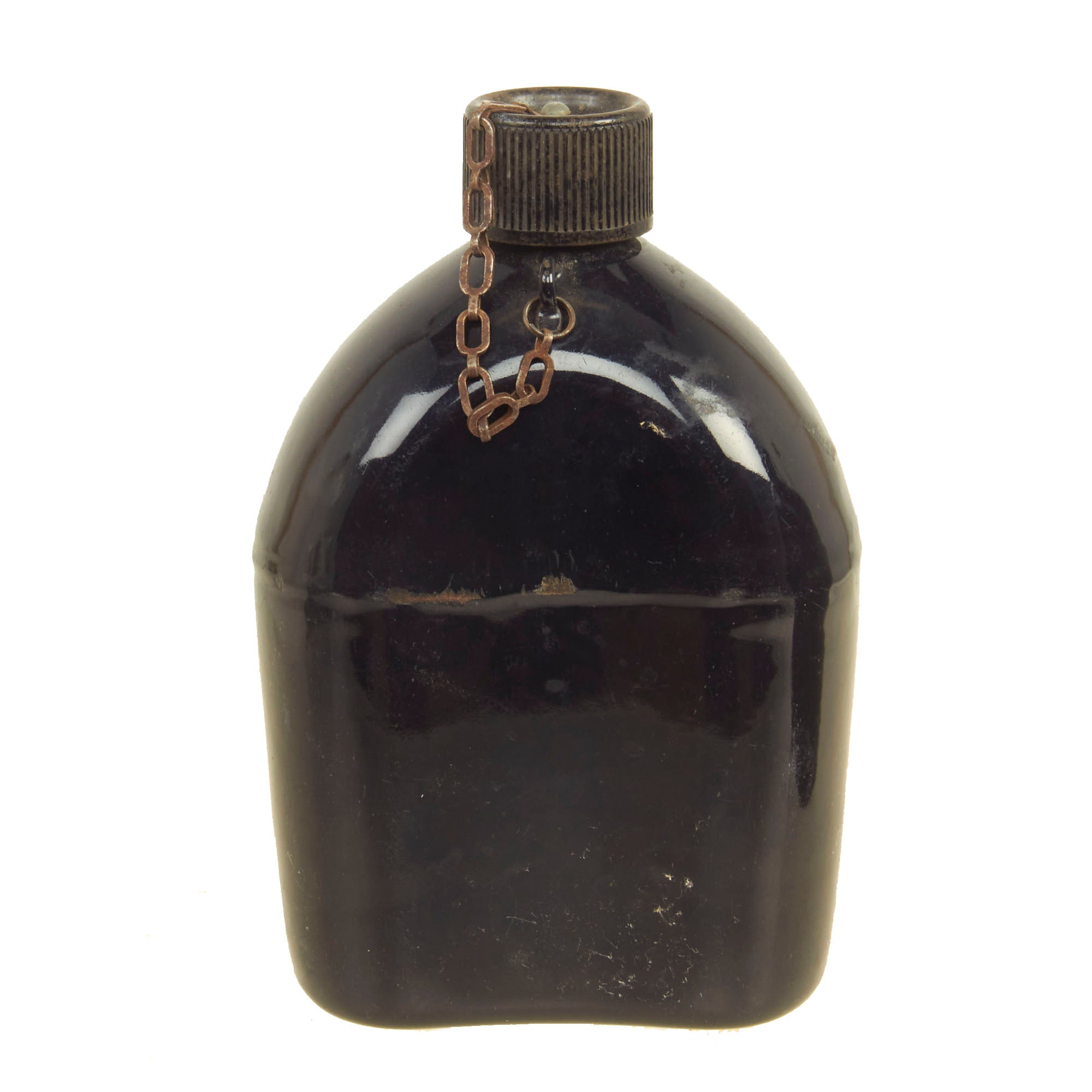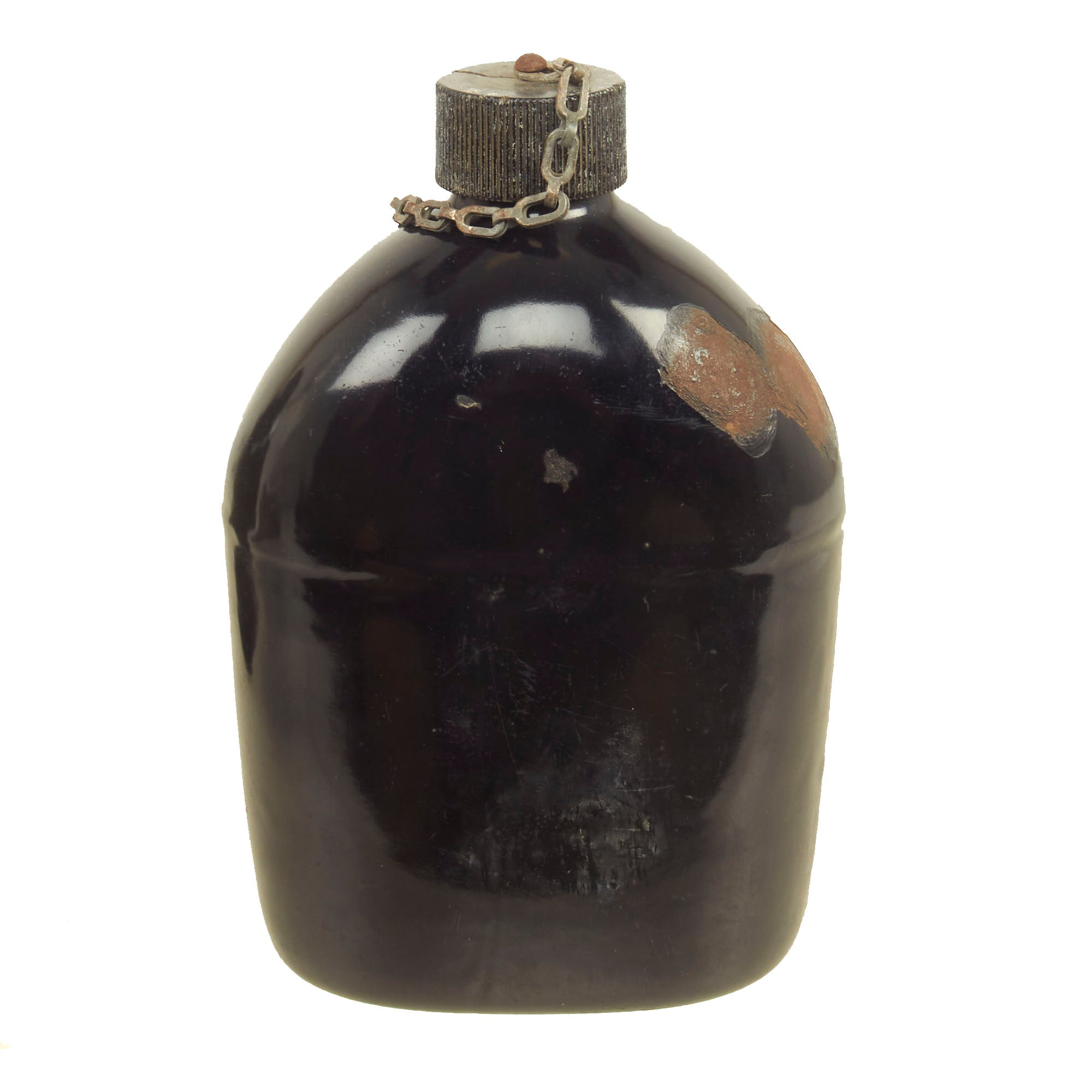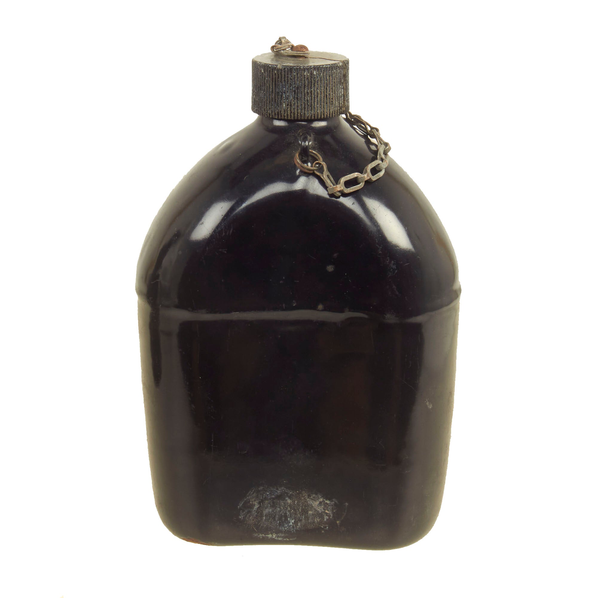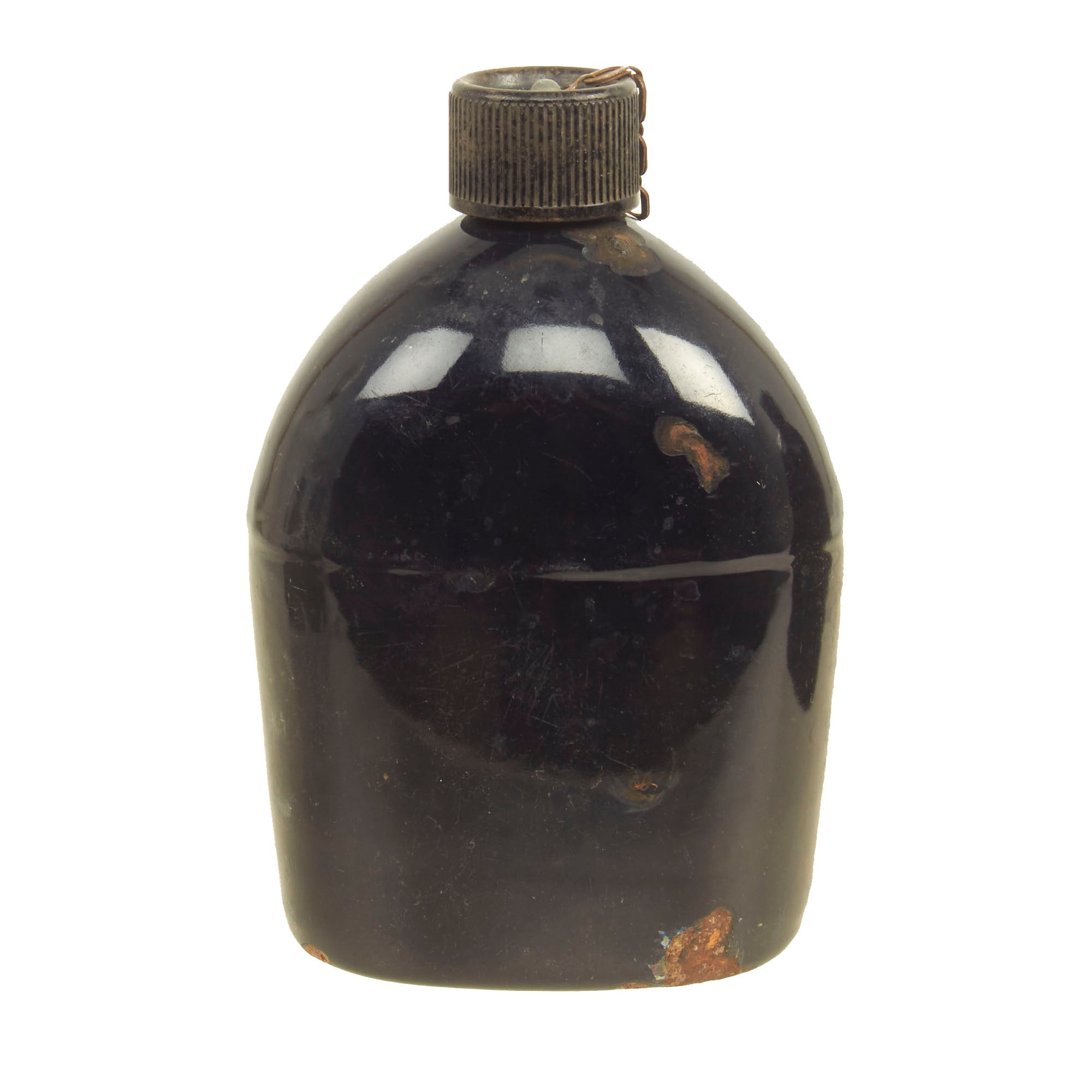 The result was this, the M1942 Black Porcelain Enamel Canteen. Unfortunately, this "experiment" was not successful at all, and there were numerous complaints from the field, as the chipped enamel inside from a dent would result in water contamination, and overall the canteens were just not very resilient. They were quickly removed from service, and replaced by the standard aluminum canteens that everyone is familiar with today. They are very scarce on the market for this reason.