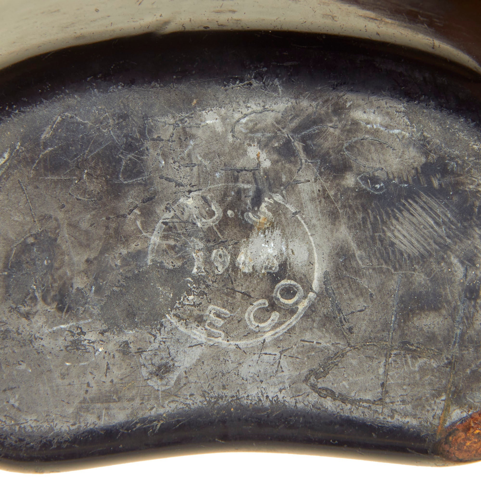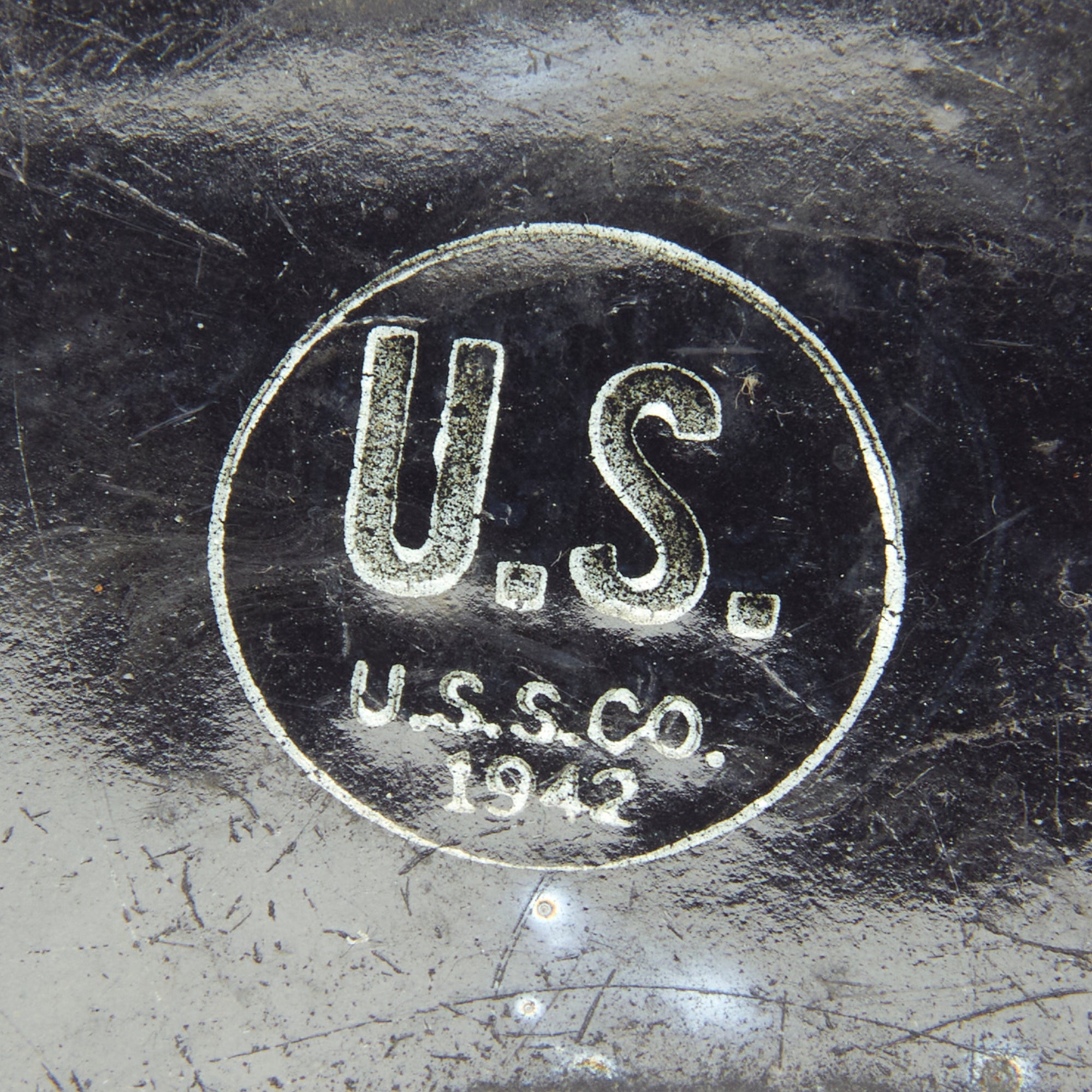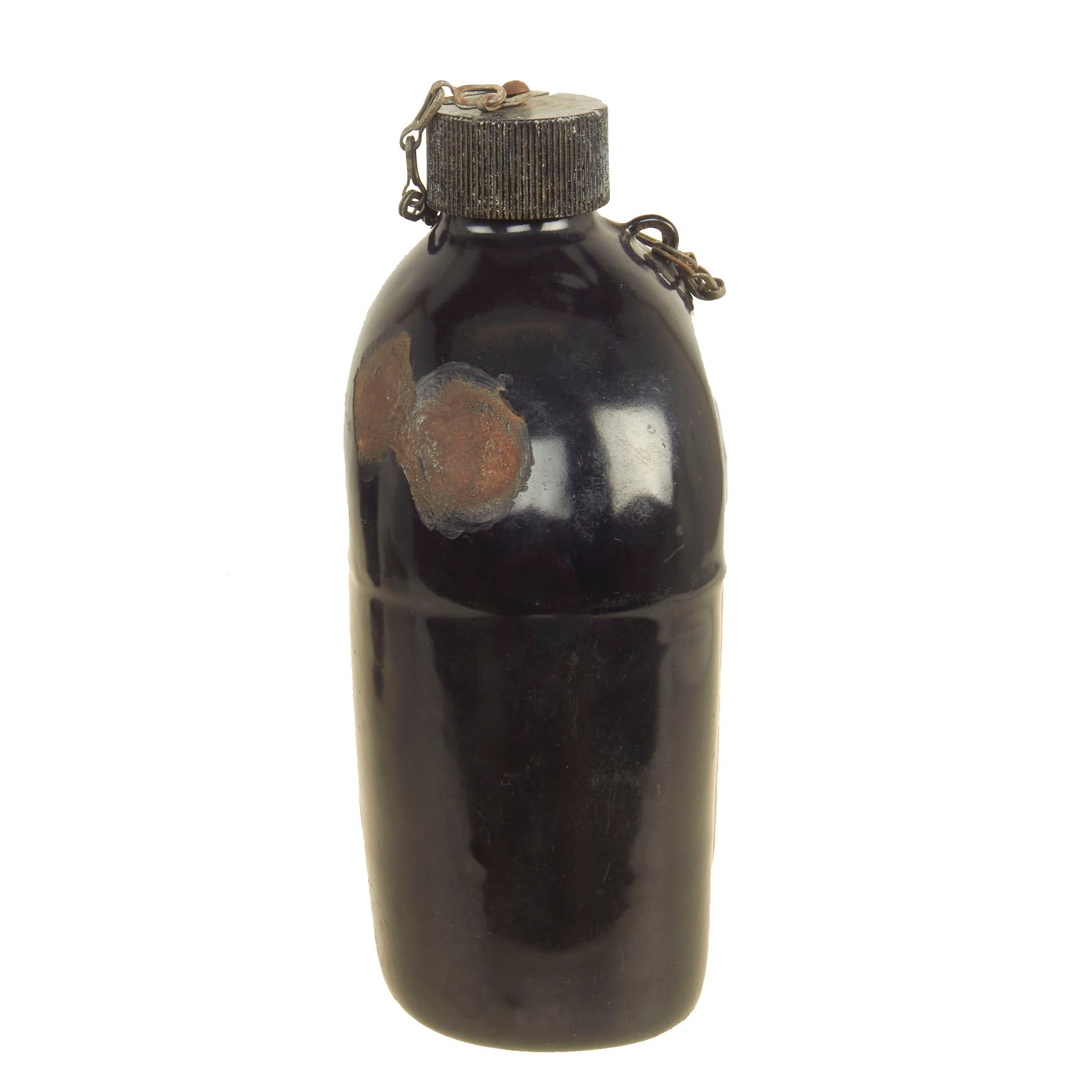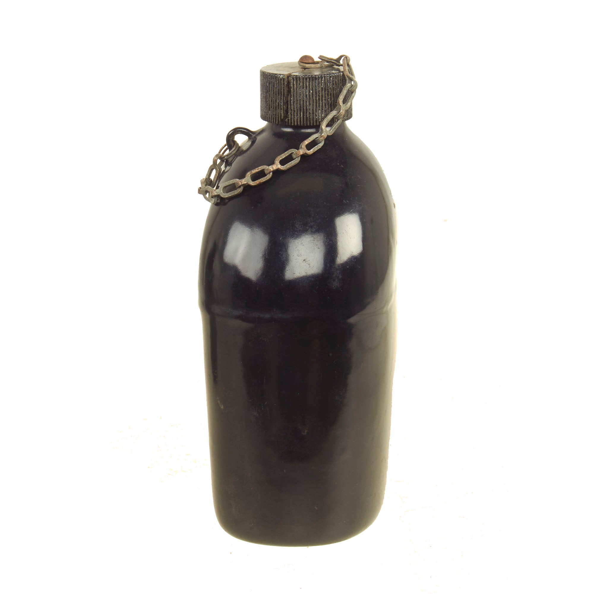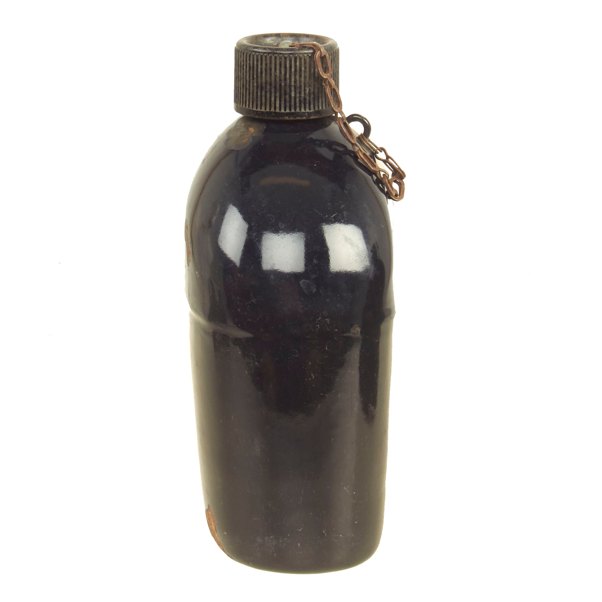 The result was this, the M1942 Black Porcelain Enamel Canteen. Unfortunately, this "experiment" was not successful at all, and there were numerous complaints from the field, as the chipped enamel inside from a dent would result in water contamination, and overall the canteens were just not very resilient. They were quickly removed from service, and replaced by the standard aluminum canteens that everyone is familiar with today. They are very scarce on the market for this reason.