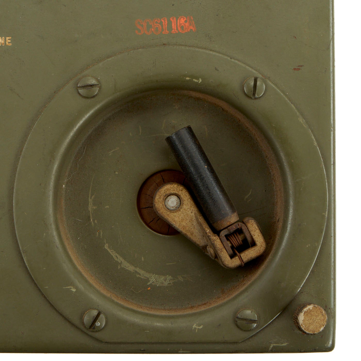 The unit does not appear to have any significant damage to it, however there are some superficial scratches and rub marks that removed a little paint. The switch still works as well as the hand crank. As far as if this thing is still operational in the sense it was during WWII, we do not know nor are we capable of testing it here at IMA.
