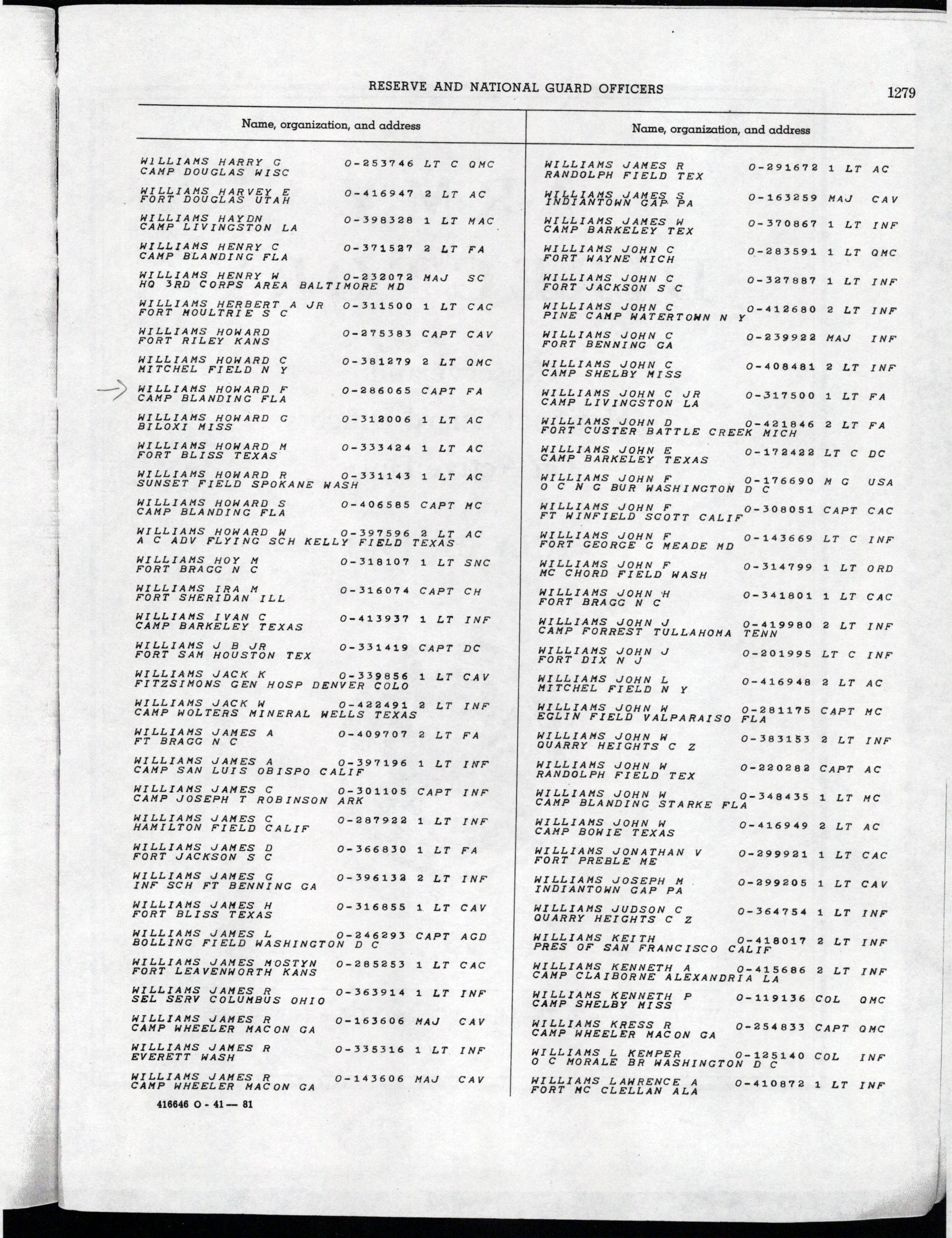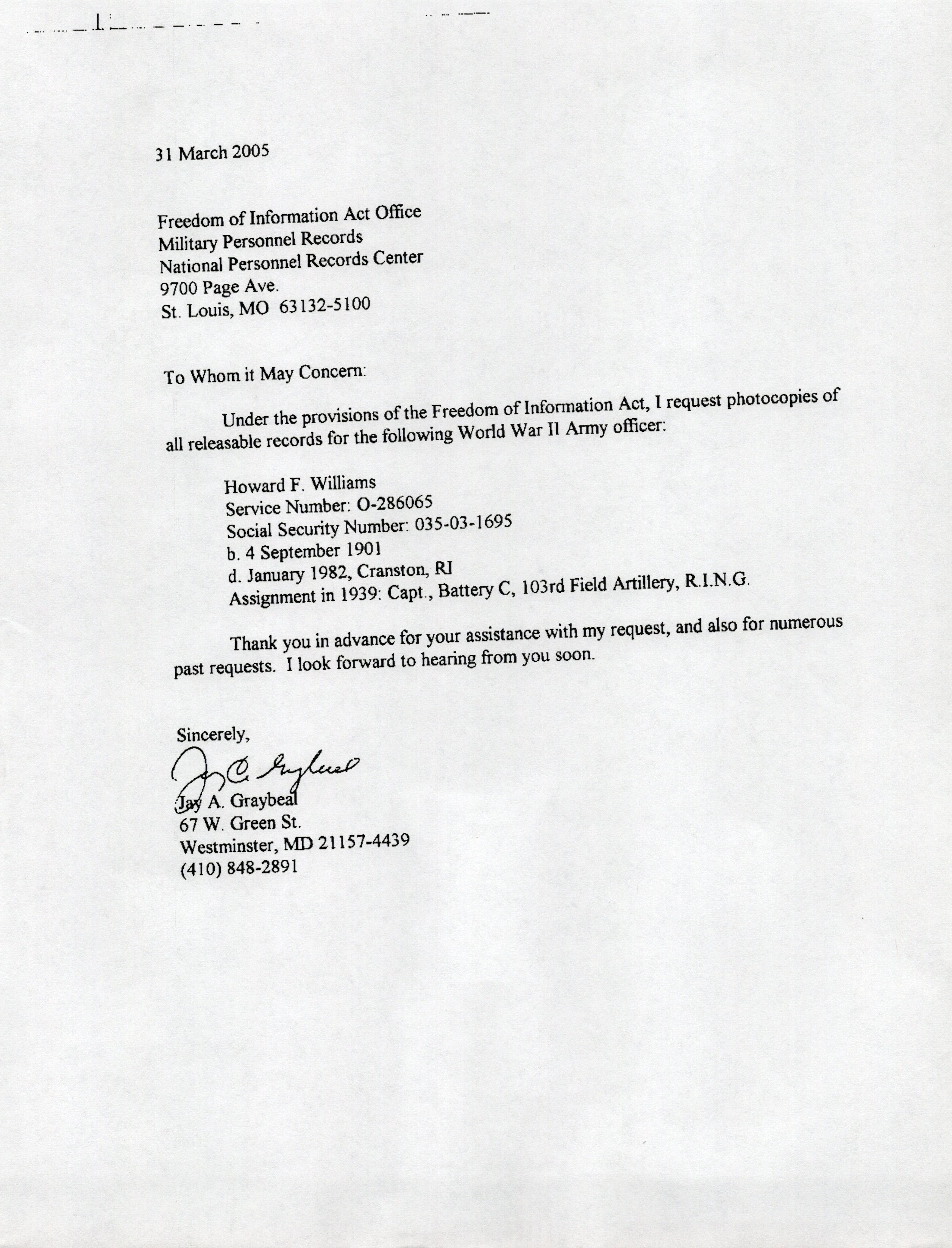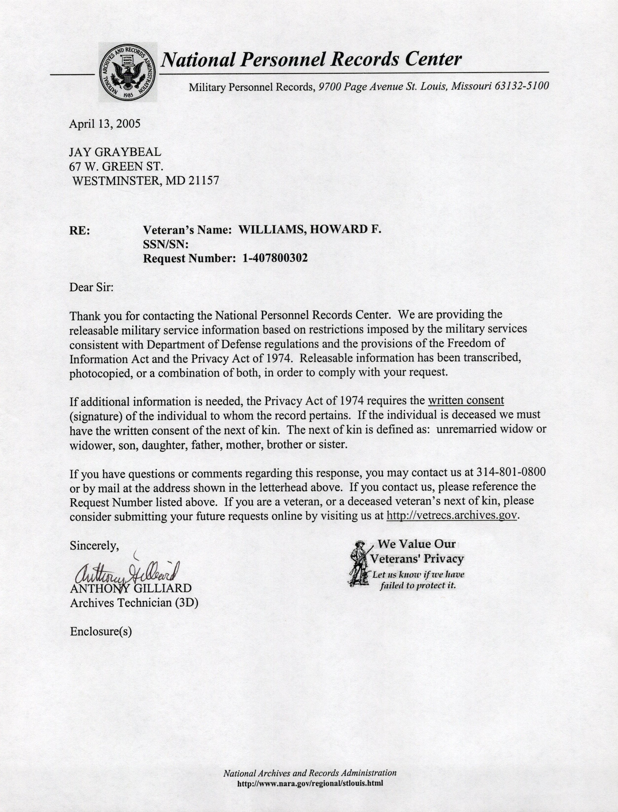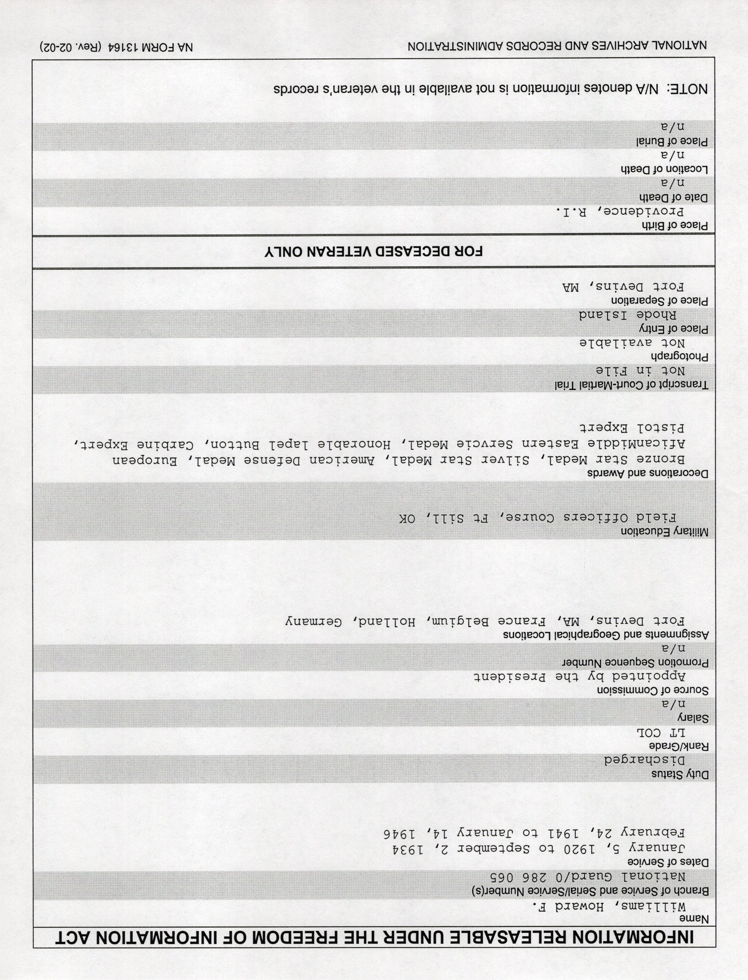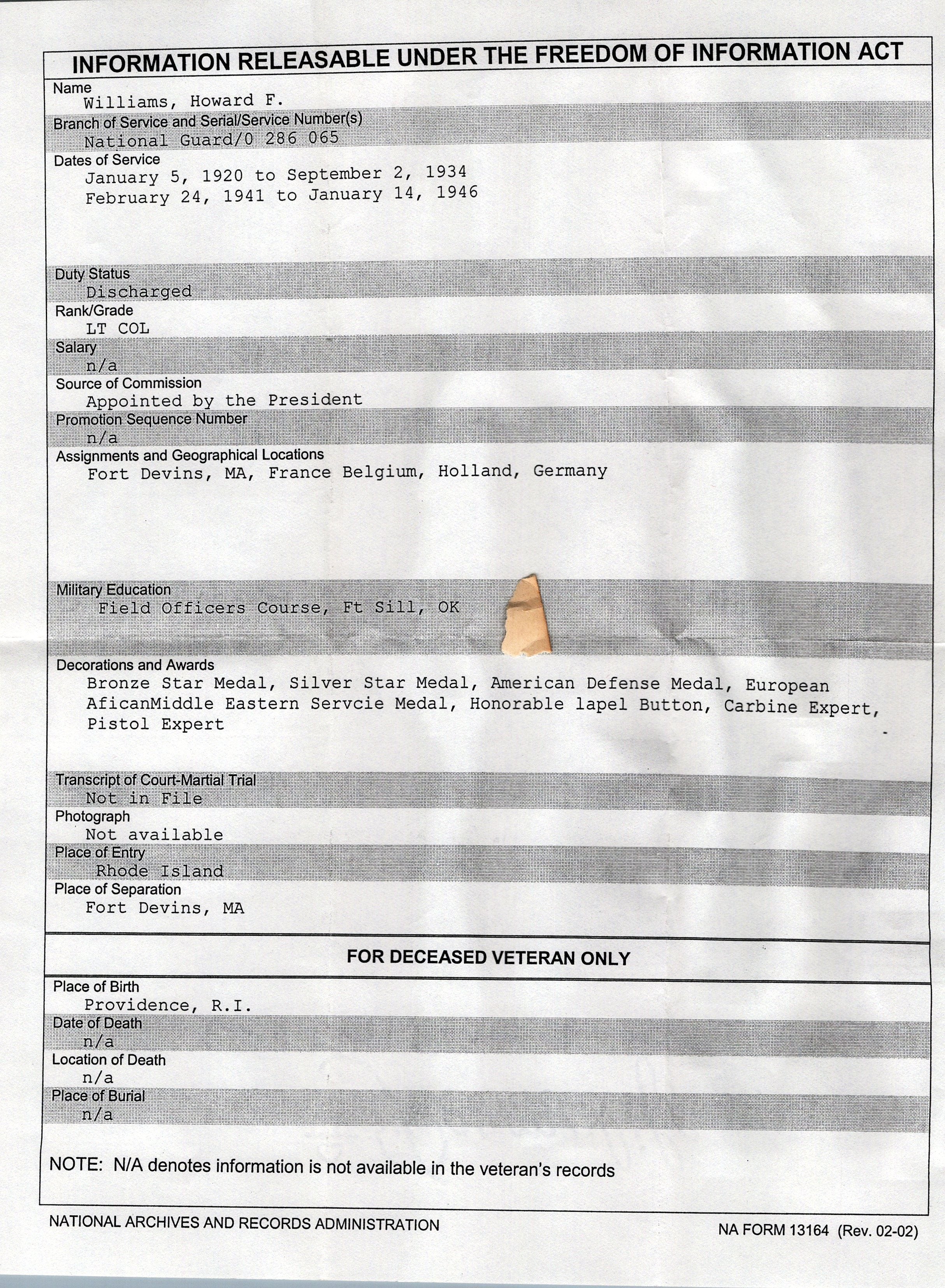 Howard F. Williams served in the Army from January 5th, 1920 to September 2nd, 1934, and again from February 24th, 1941 to January 14th, 1946. He was commissioned as a 2nd Lieutenant of Field Artillery on March 9th, 1931, a 1st Lieutenant on September 2nd, 1934, and a Captain on March 1st, 1939. While overseas during WWII he served in France, Belgium, Holland, and Germany. He was discharged as a Lieutenant Colonel, and was awarded the Bronze Star and Silver Star during World War II. He was born in Providence, Rhode Island.