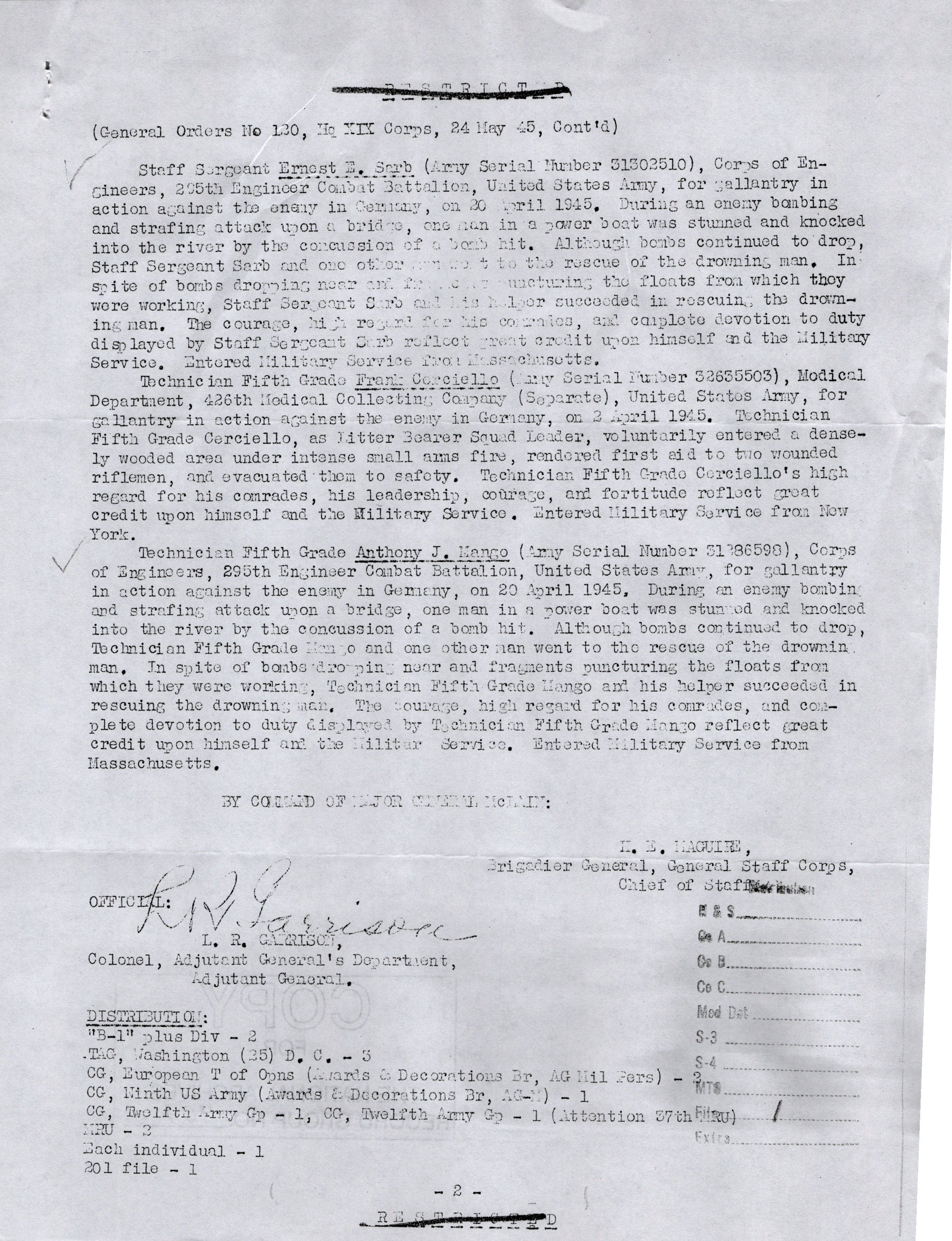 Major Howard F. Wiliams Army SN# 0286065, Field Artillery, 963rd FA Battalion, US Army, for gallantry in action against the enemy in Germany on March 1st, 1945. When a large number of enemy artillery rounds fell in the area of his battalion, setting fire to a loaded ammunition truck and causing casualties, Major Williams, with complete disregard for personal safety, left a building in which he had taken shelter and carried an injured man to safety. Despite continued shelling, Williams returned to the burning truck and assisted in removing the vehicle to a position where the exploding load of his explosive ammunition would not cause further damage. The courage, high regard for his men, and coolness under fire displayed by Major Williams reflect great credit upon himself and the Military Service. Entered military service from Rhode Island.