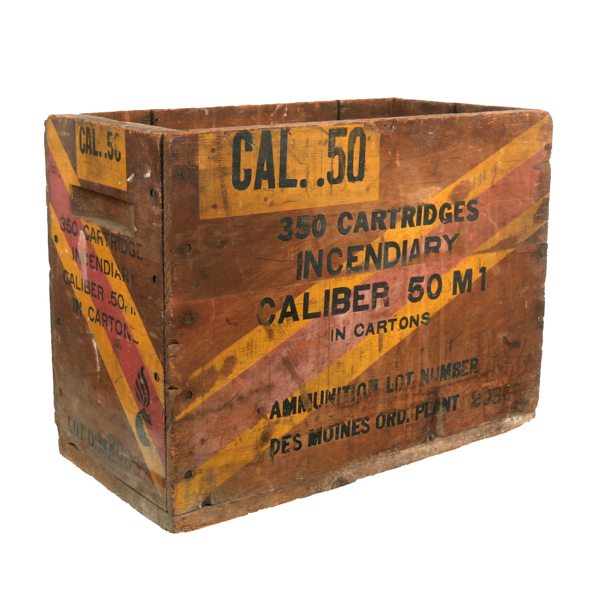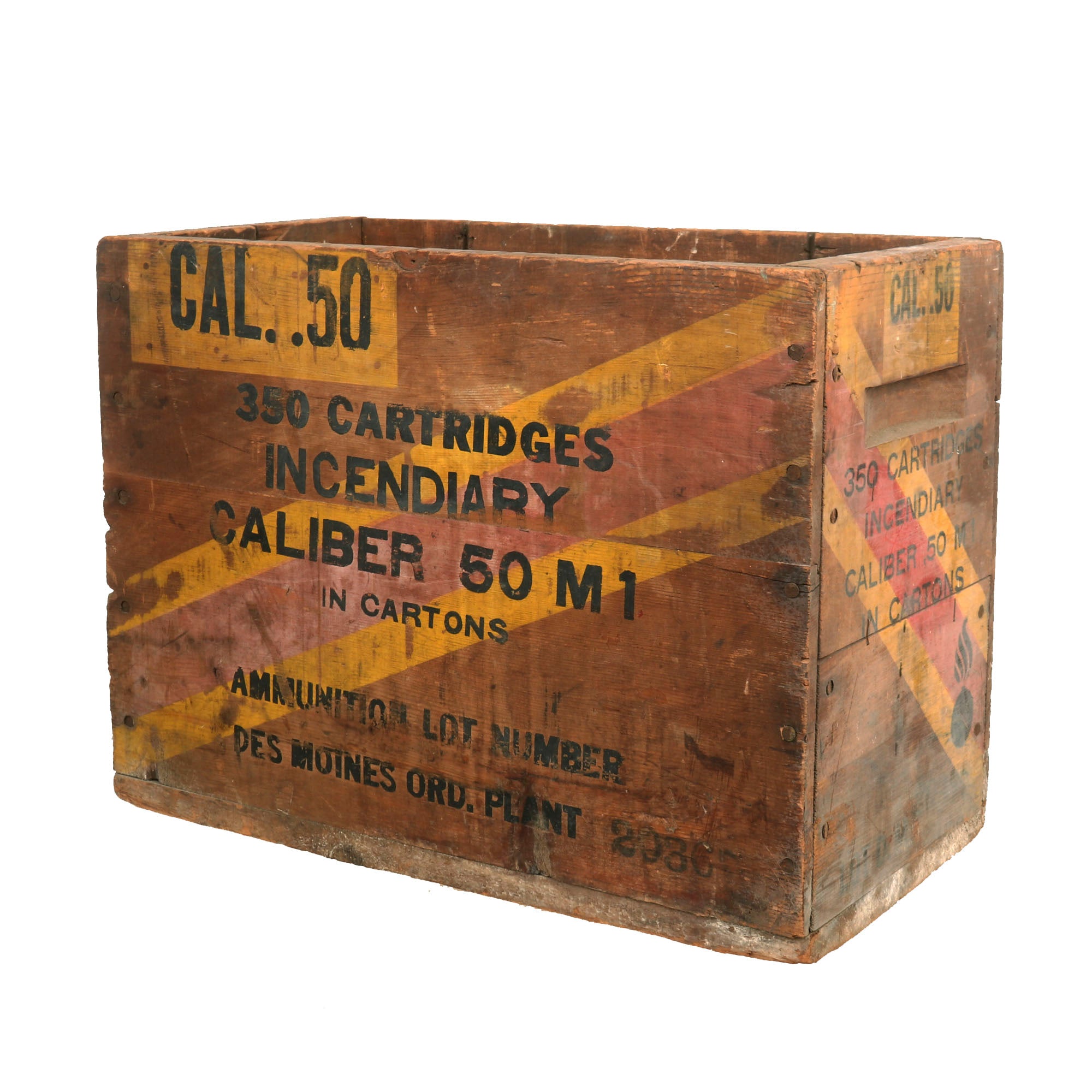 Original Item: Only One Available. This is a very nice WWII Issue "Packing box M1917" ammunition crate for 350 .50cal M1 Ball Incendiary Cartridges, as used by the legendary Browning M2 "Ma Deuce" heavy machine gun. The front of the crate still bears the original packing information on the front: