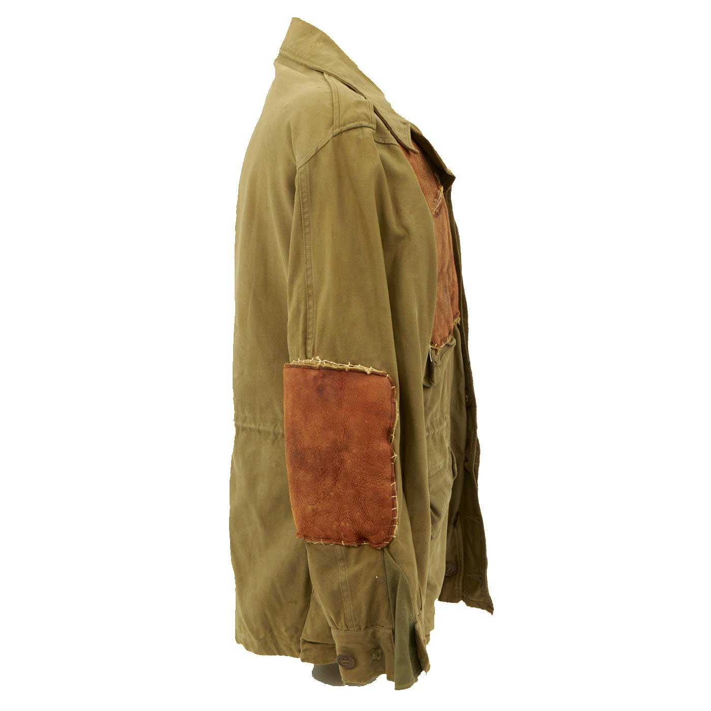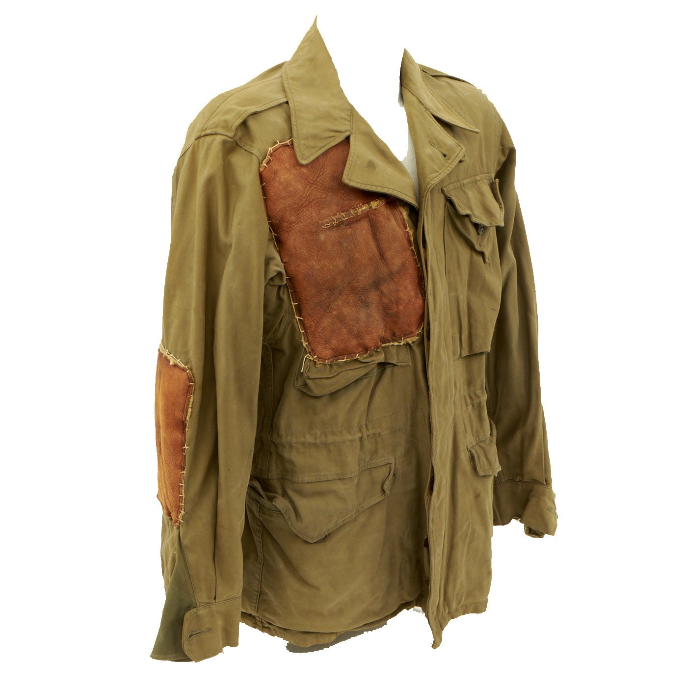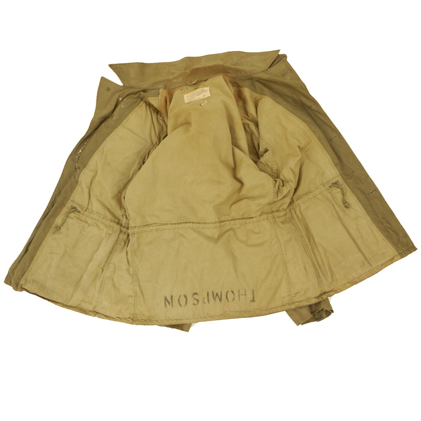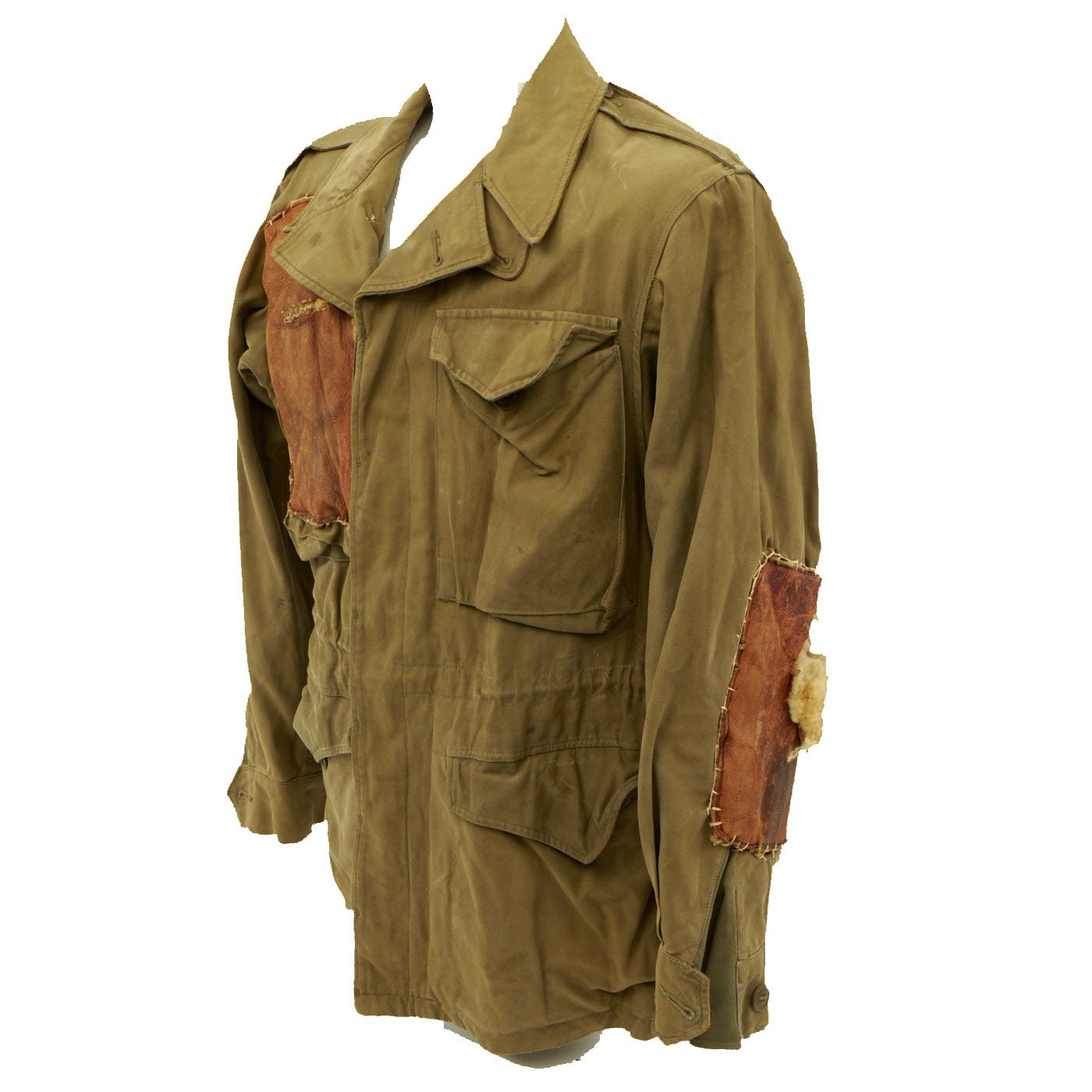 - Original Item: One-of-a-kind. This is a genuine M43 Field Jacket in size 34R which was customized to a sniper or marksman configuration by adding shearling leather elbow and shoulder pads. All buttons are present and the internal drawstring is complete. It is stenciled in black paint THOMPSON above the inside lower seam. This is a very interesting and unique customized jacket from World War Two.