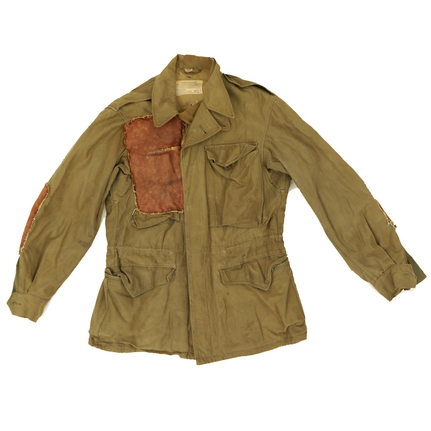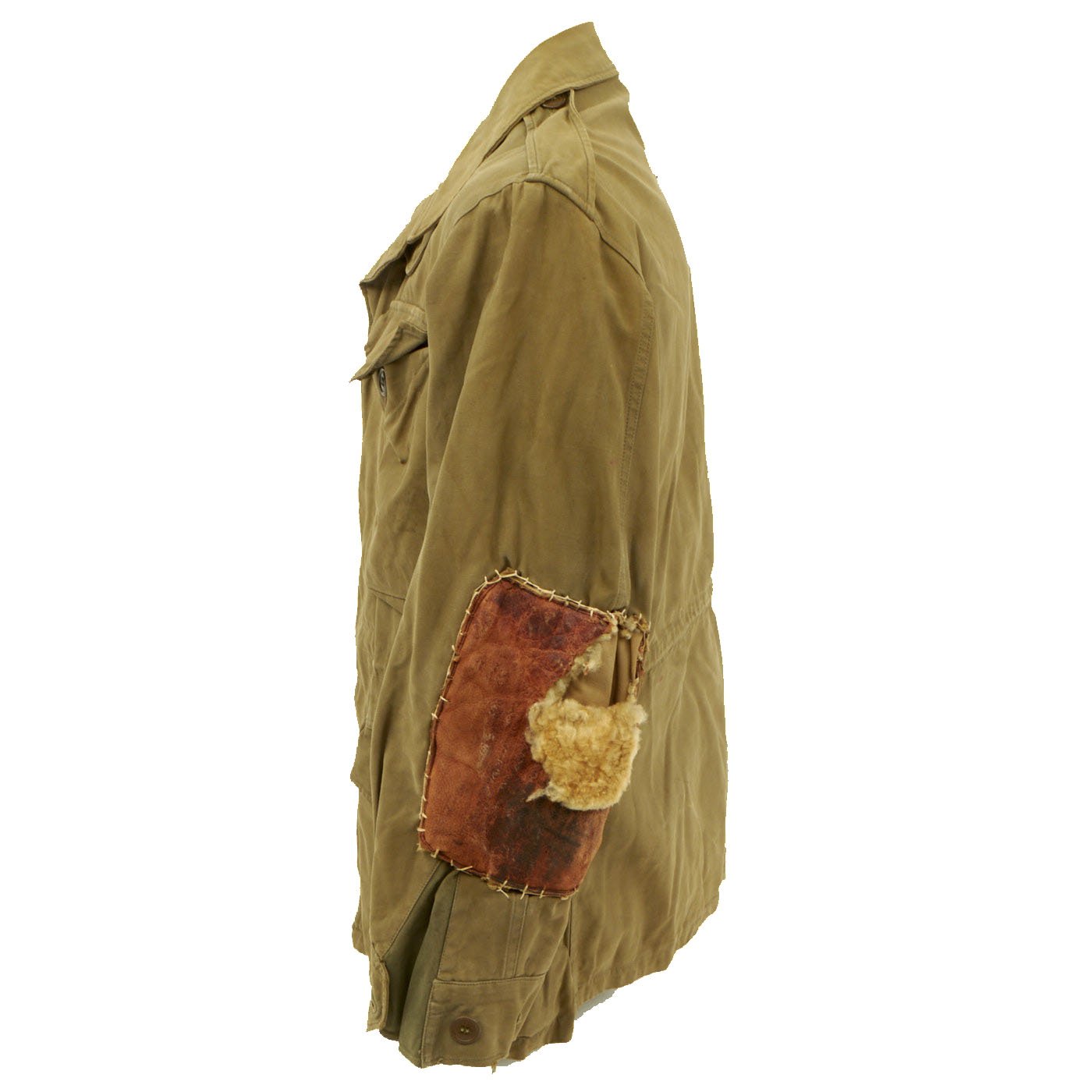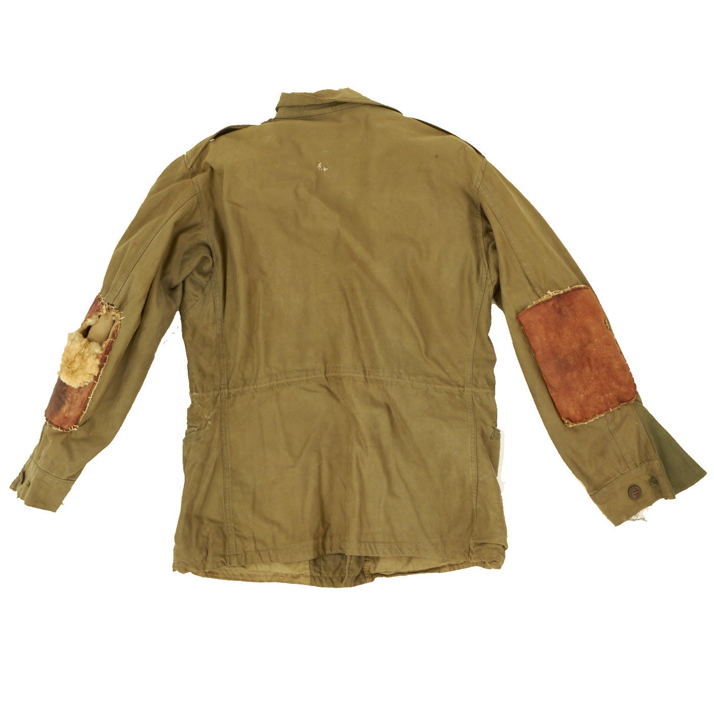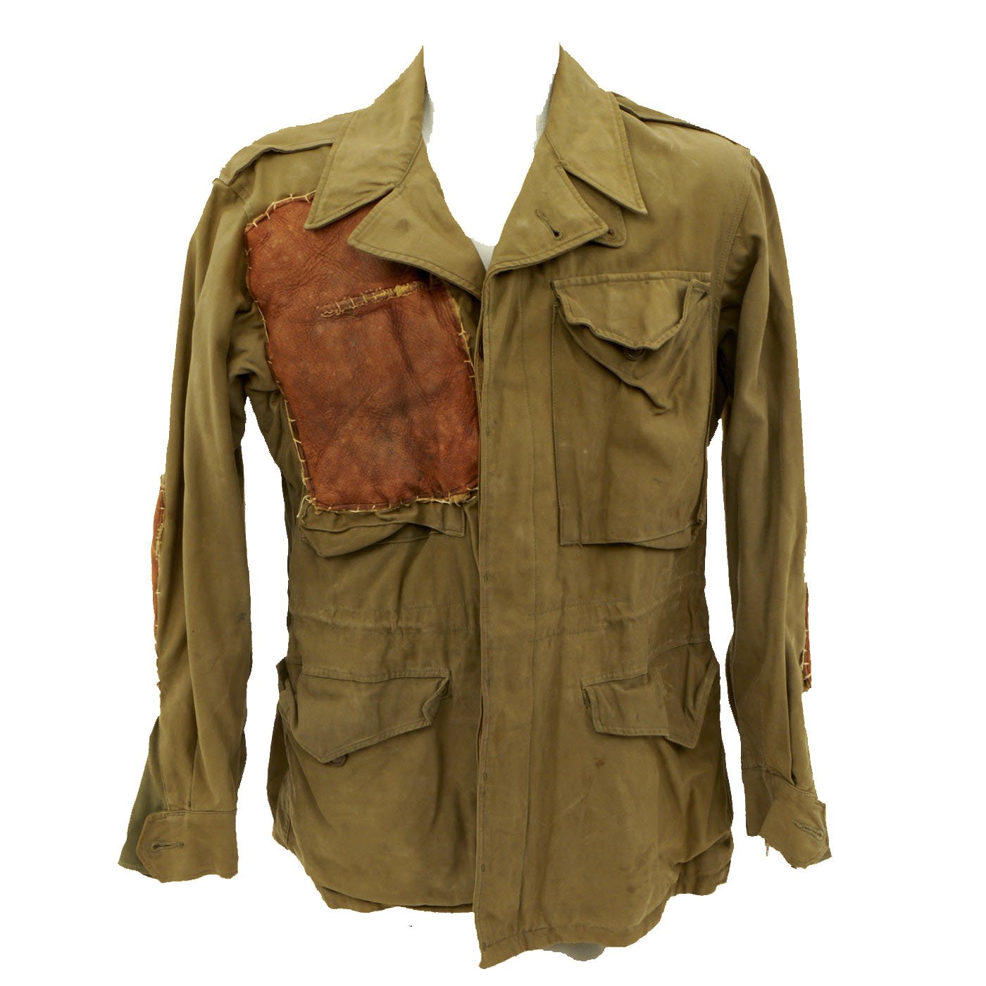 - Original Item: One-of-a-kind. This is a genuine M43 Field Jacket in size 34R which was customized to a sniper or marksman configuration by adding shearling leather elbow and shoulder pads. All buttons are present and the internal drawstring is complete. It is stenciled in black paint THOMPSON above the inside lower seam. This is a very interesting and unique customized jacket from World War Two.