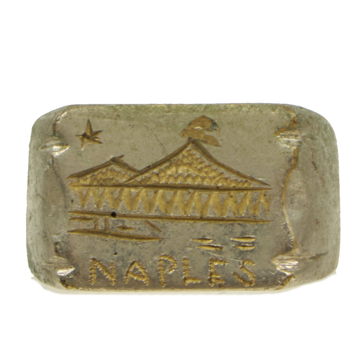 - Silver-plated brass ring with with NAPLES engraved on the central face under a drawing of Mt. Vesuvius. Approximately 19mm in diameter.