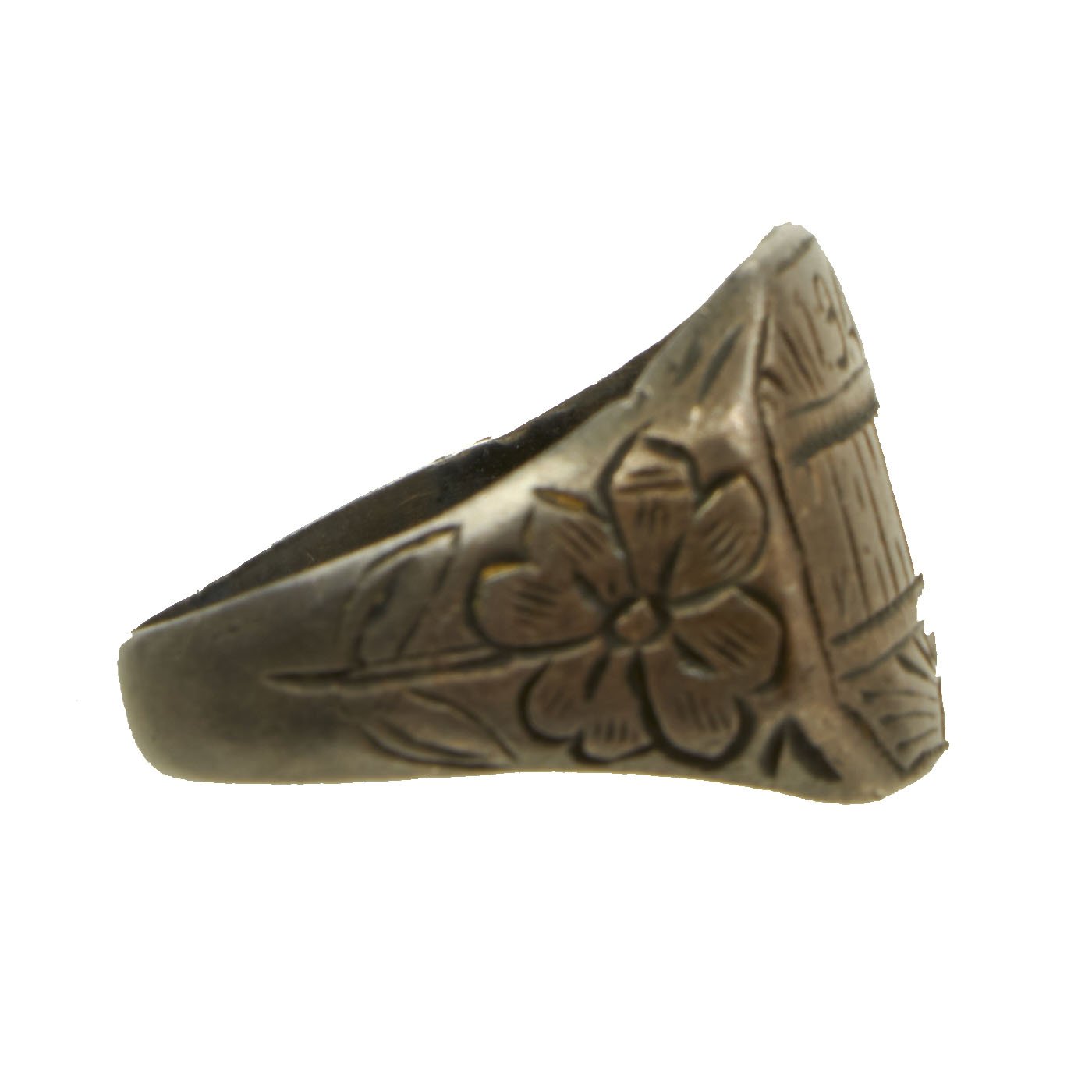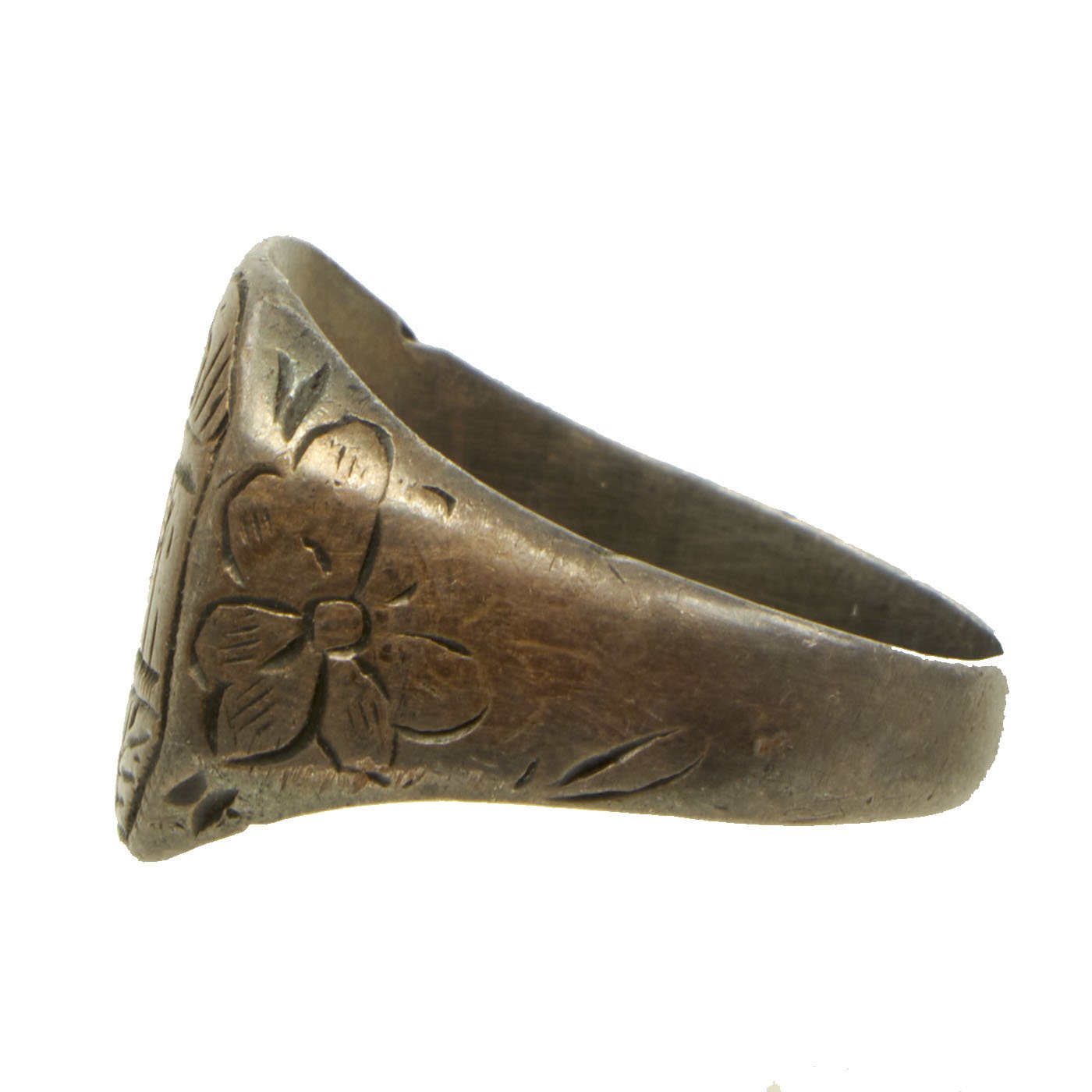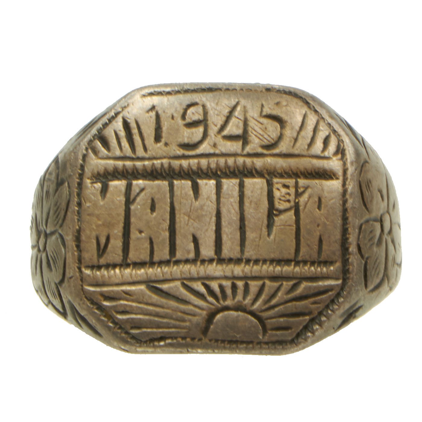 - Silver ring with 1945 / MANILLA engraved across the main face of the ring over a rising sun. On the band next to the main face there are some floral engravings. Approximately 20mm in diameter.