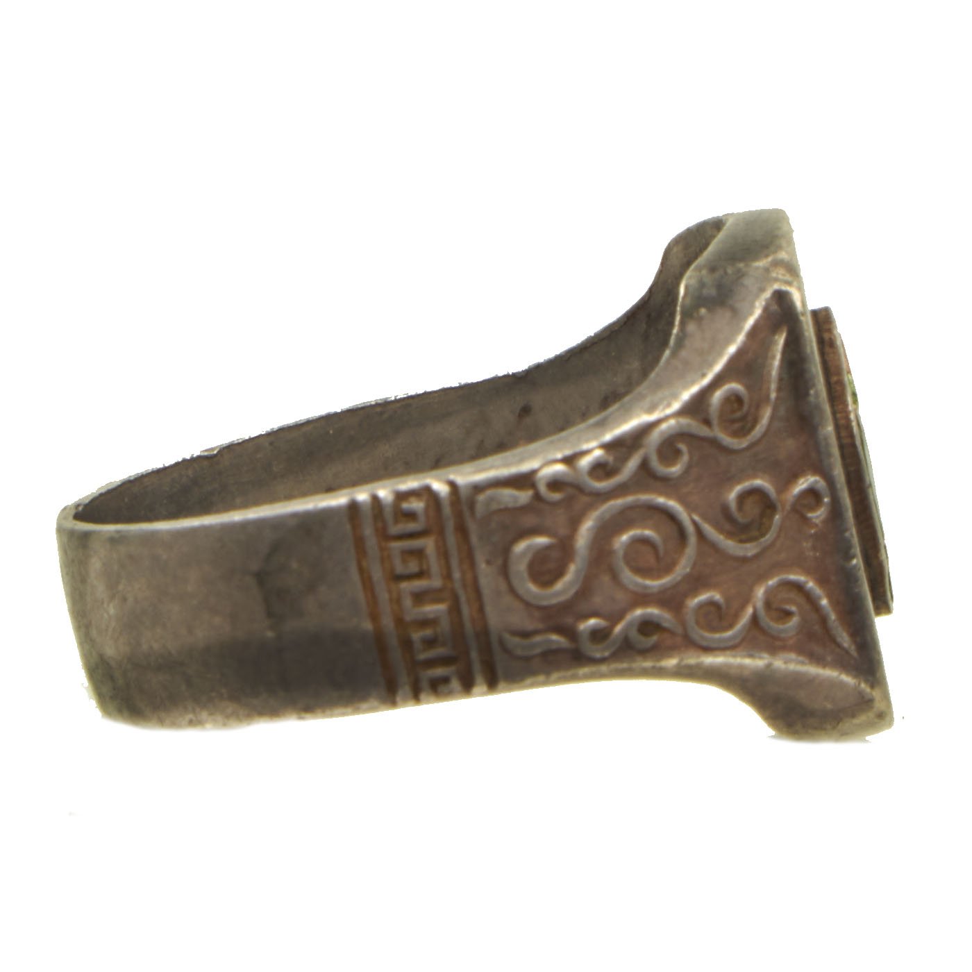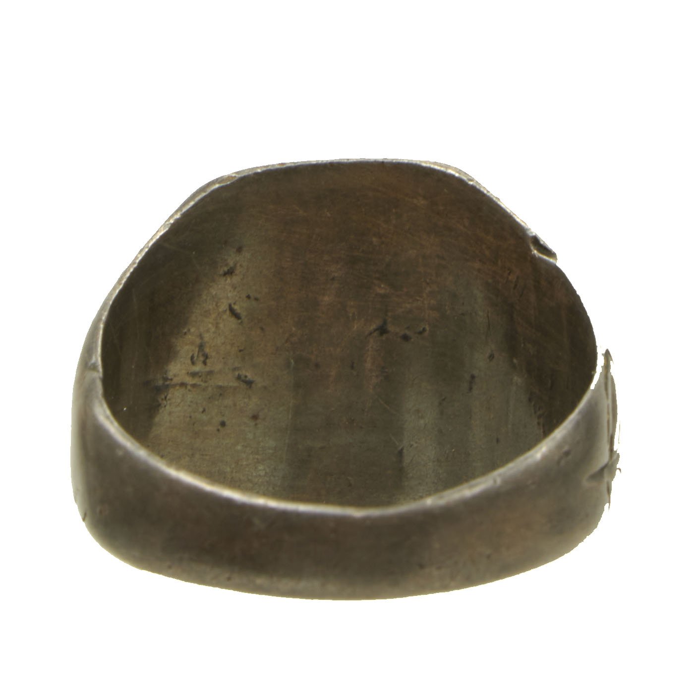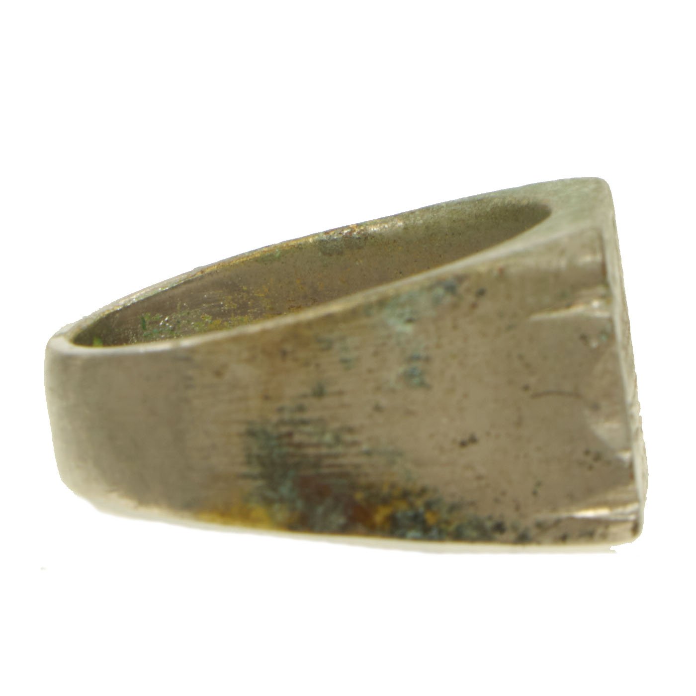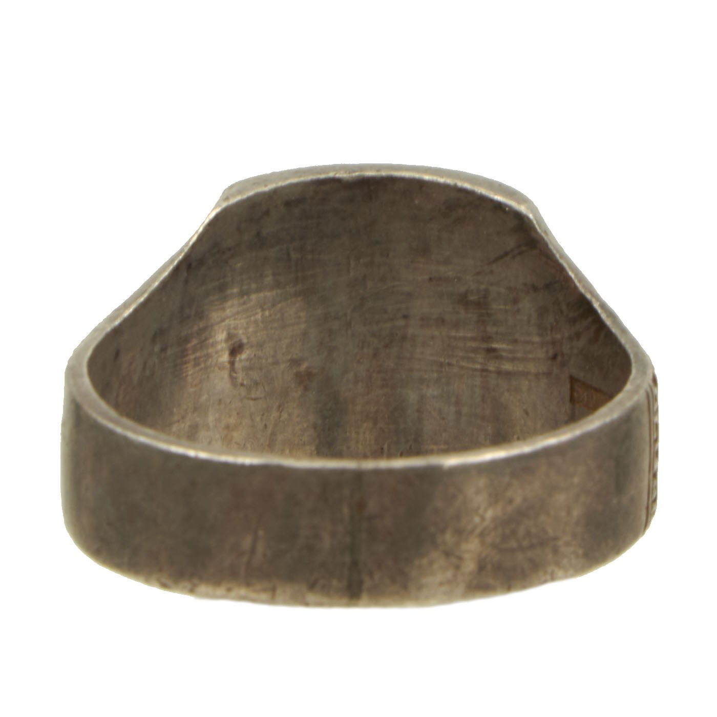 - Silver ring with 1945 / MANILLA engraved across the main face of the ring over a rising sun. On the band next to the main face there are some floral engravings. Approximately 20mm in diameter.