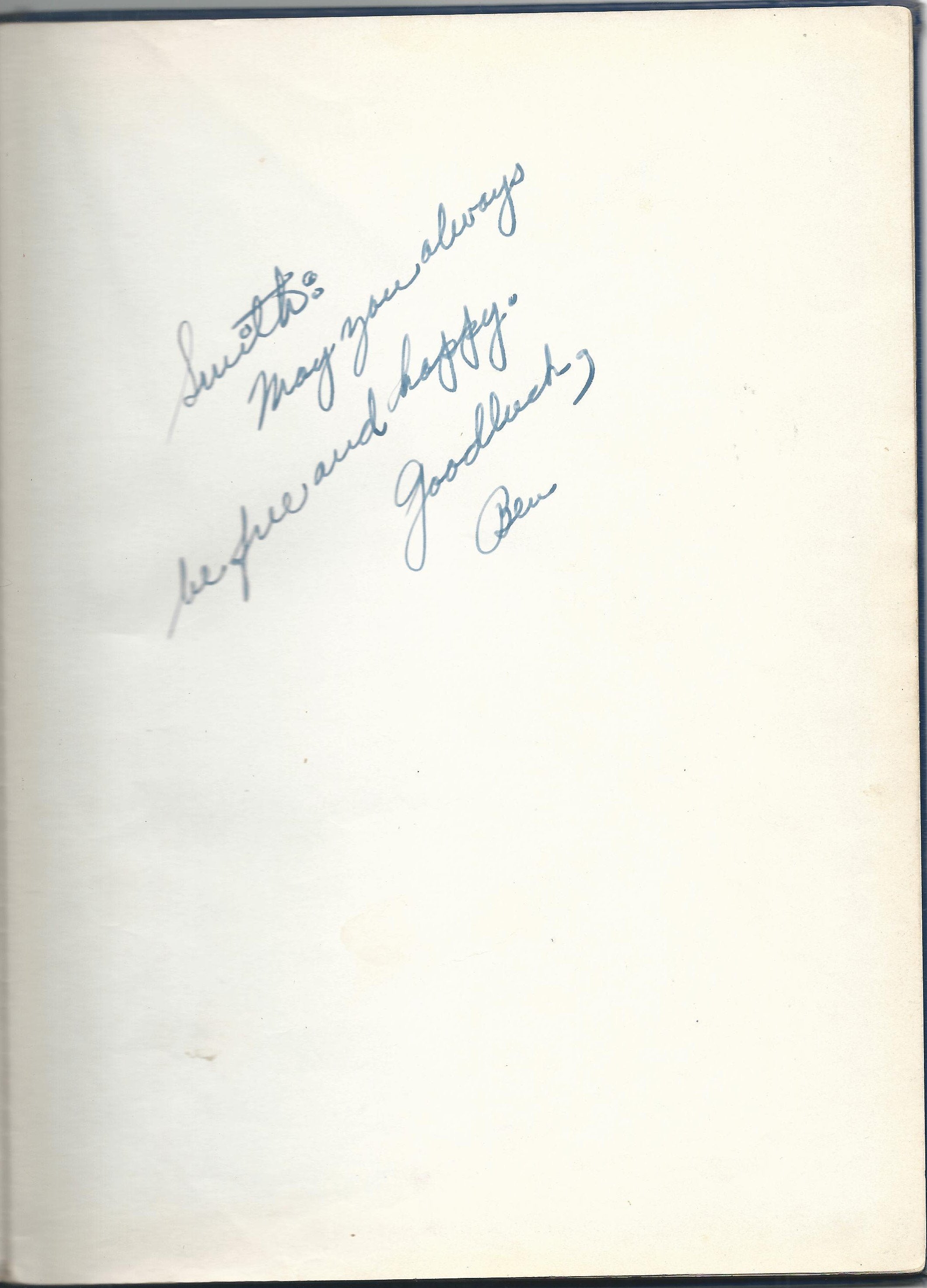 Presented to "Smith, may you always be free and happy” on the second page and signed by "Ben". Printed in small numbers as a keepsake for friends, family, and fellow soldiers, one might expect that all copies were signed. A remarkable memento from the Second World War, dedicated to “all our buddies killed in action, by civilians or in the prison camps.”