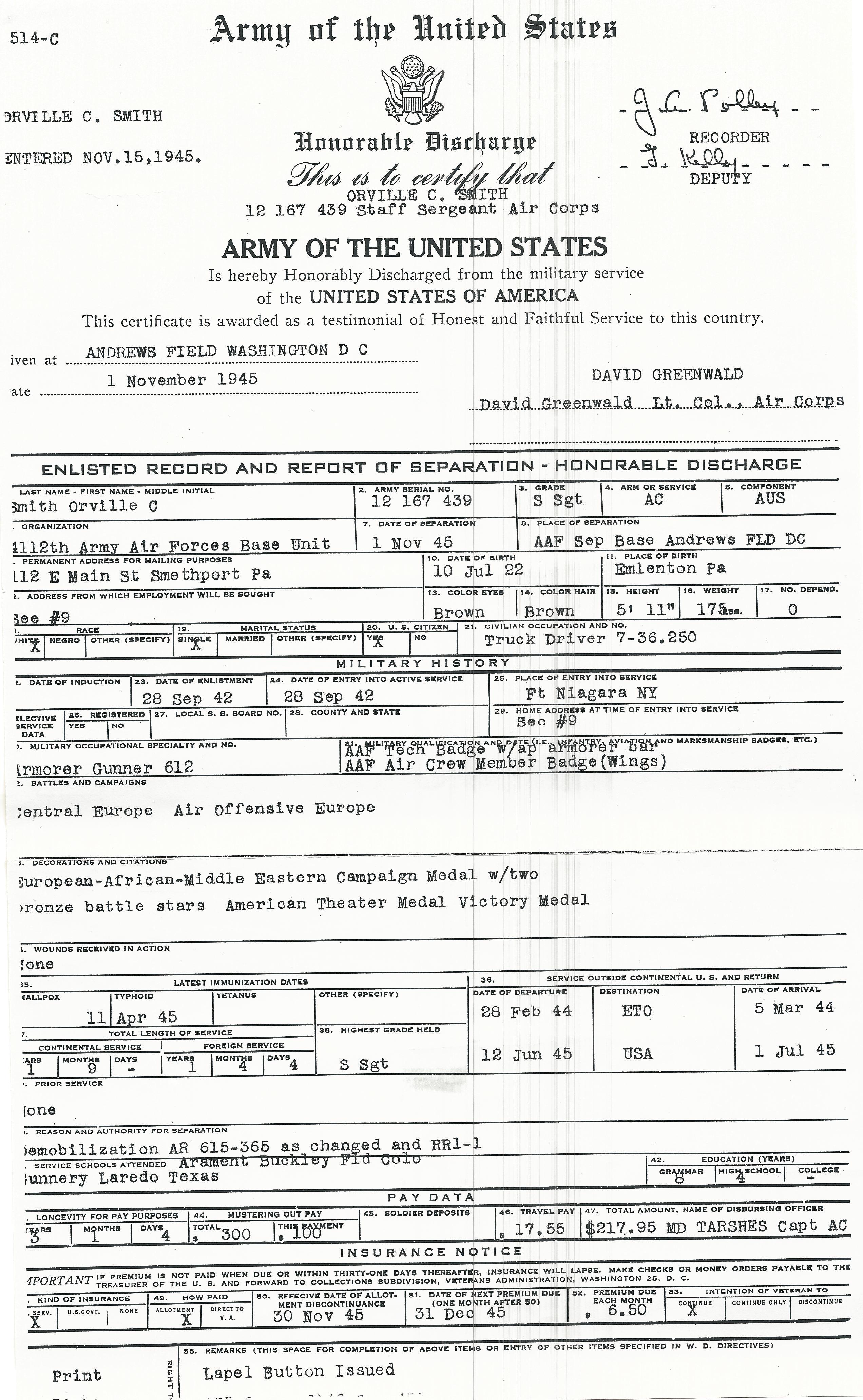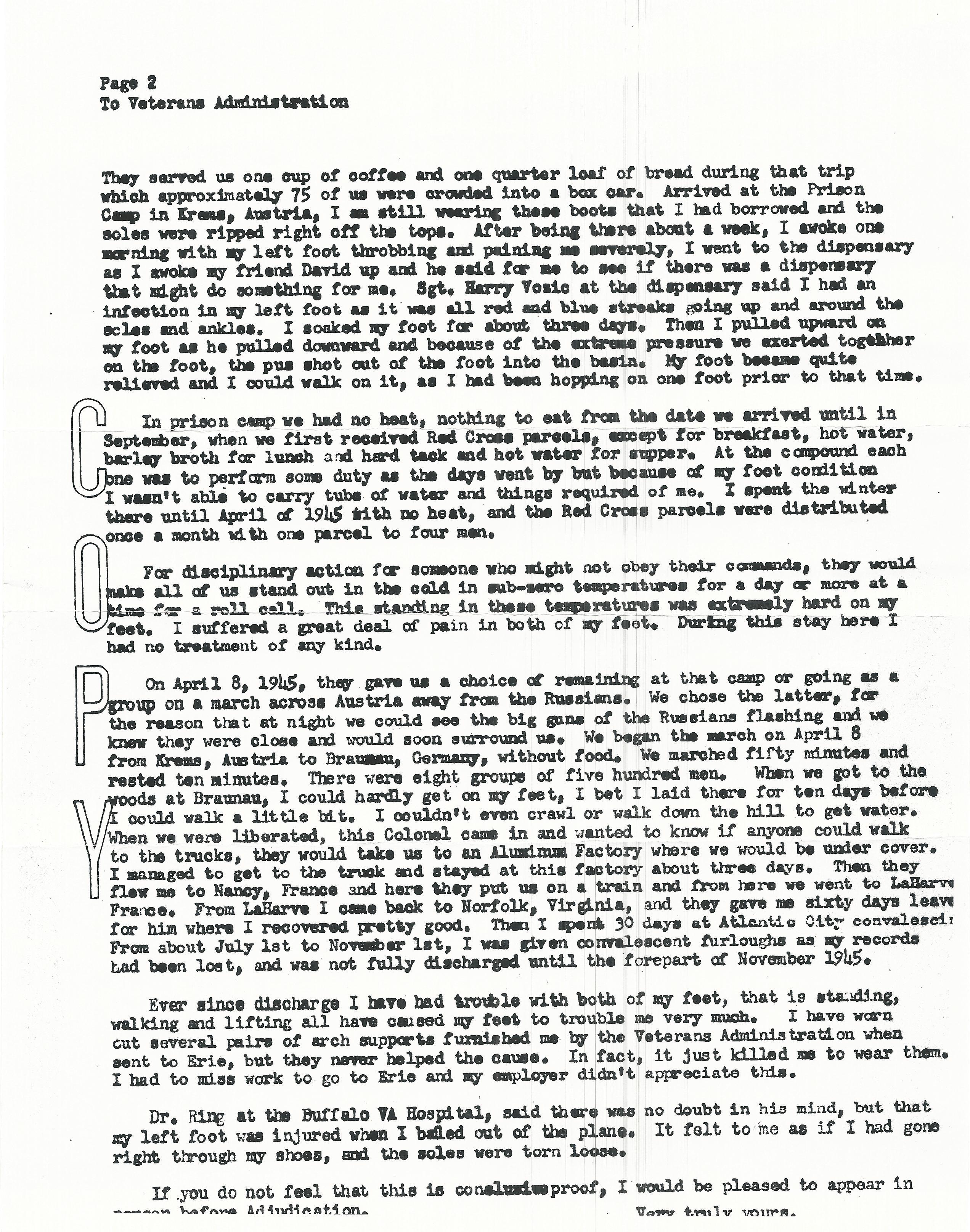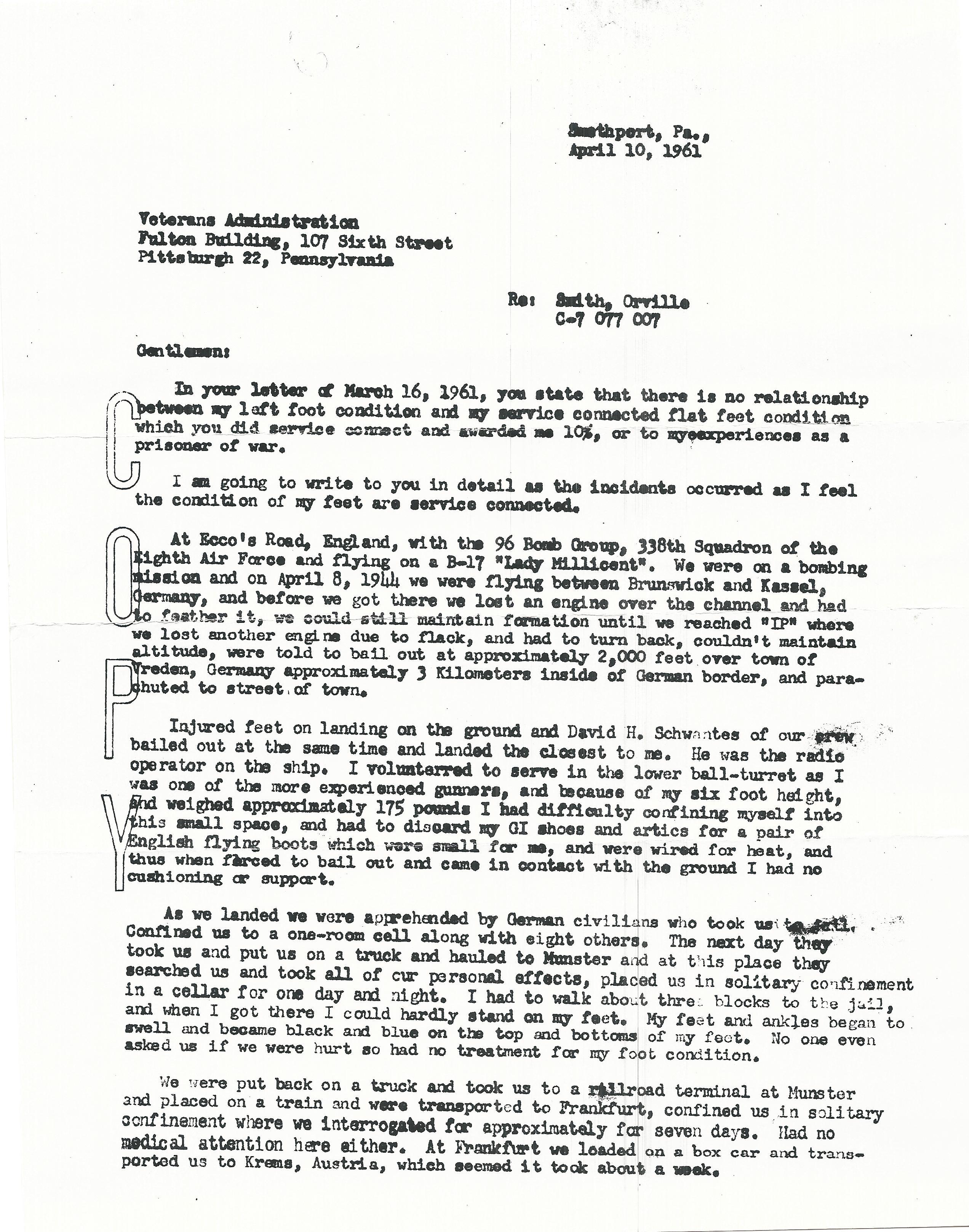 - Copy of letter Smith wrote to the VA describing the injury he sustained to his feet from baling out of the plane and his subsequent imprisonment. This letter is transcribed below and details some of his experience from bail out to liberation.