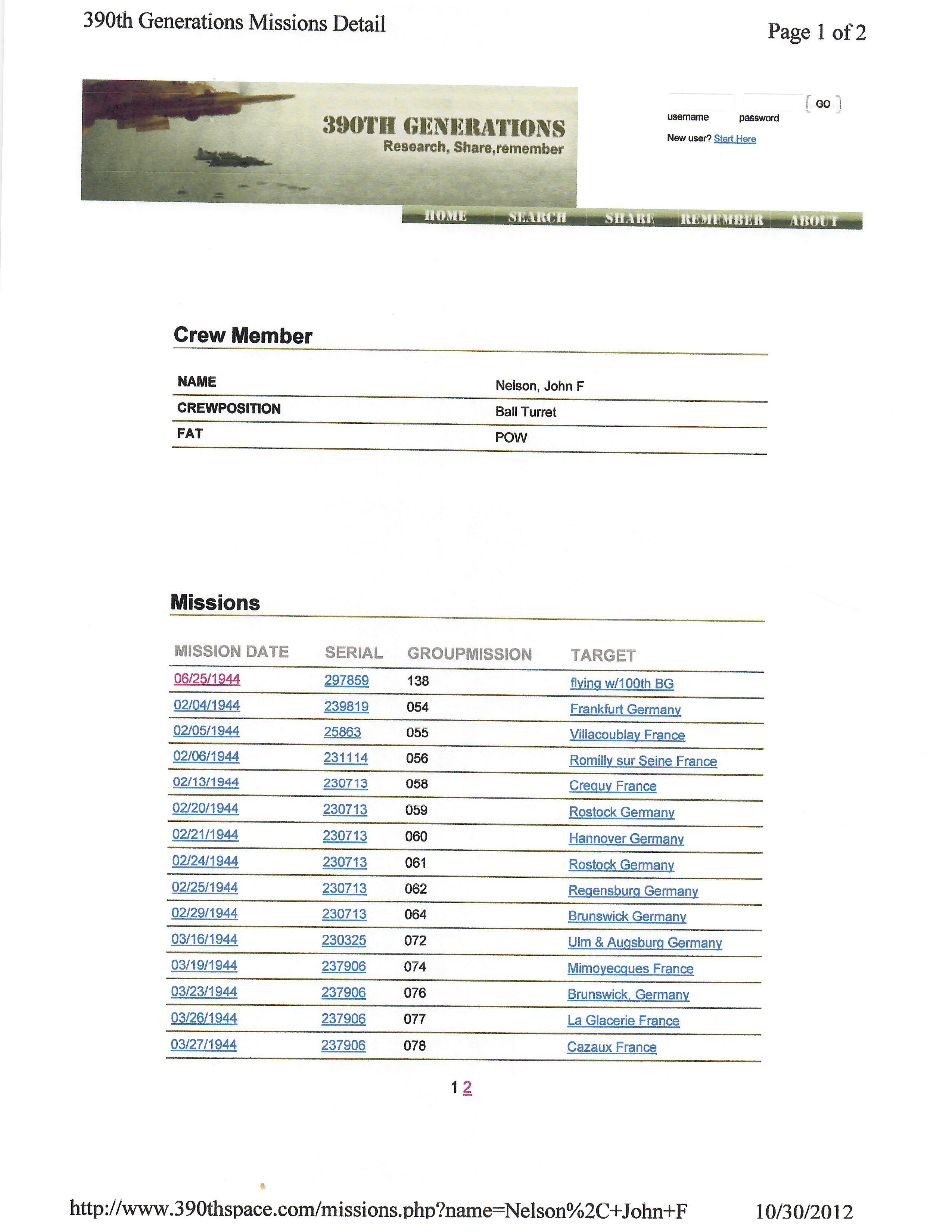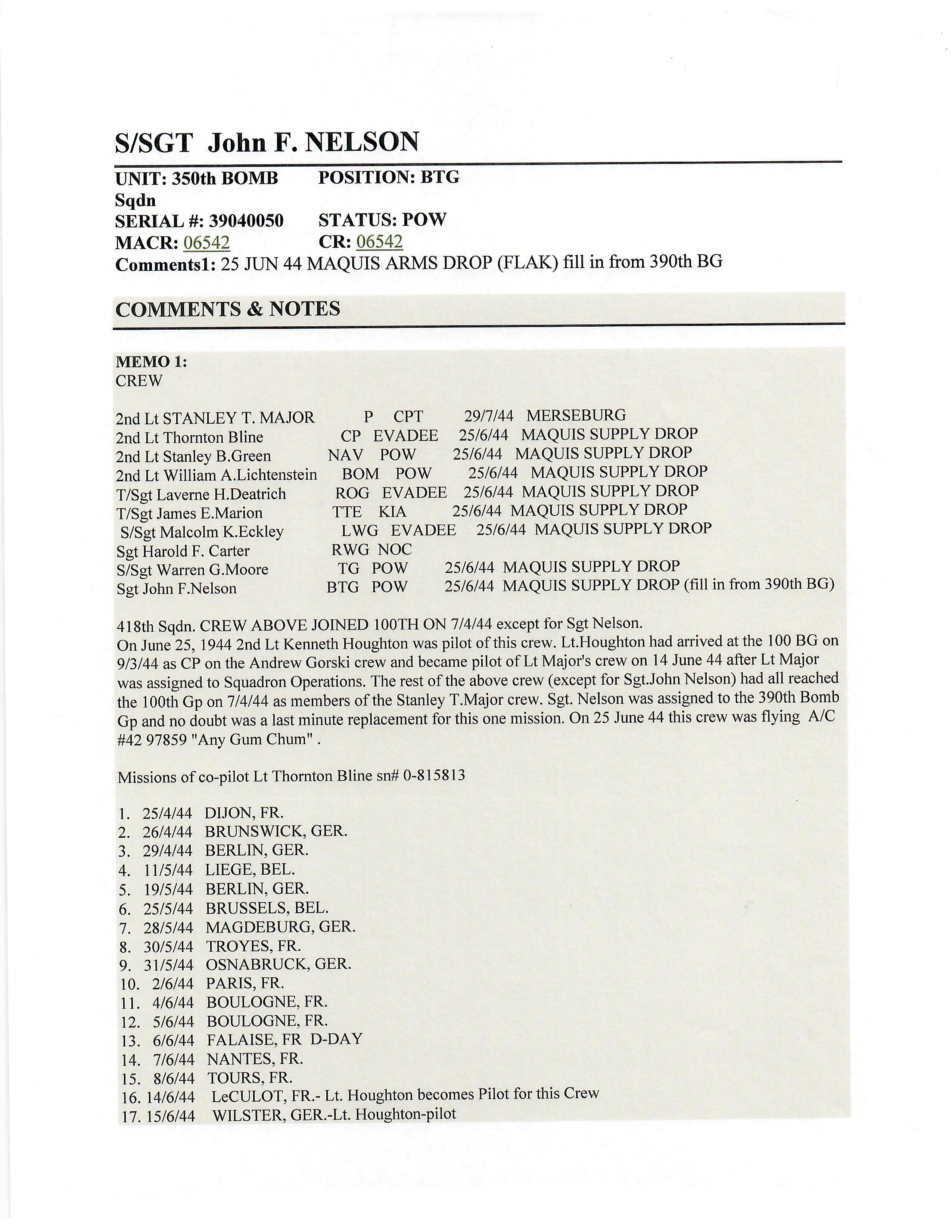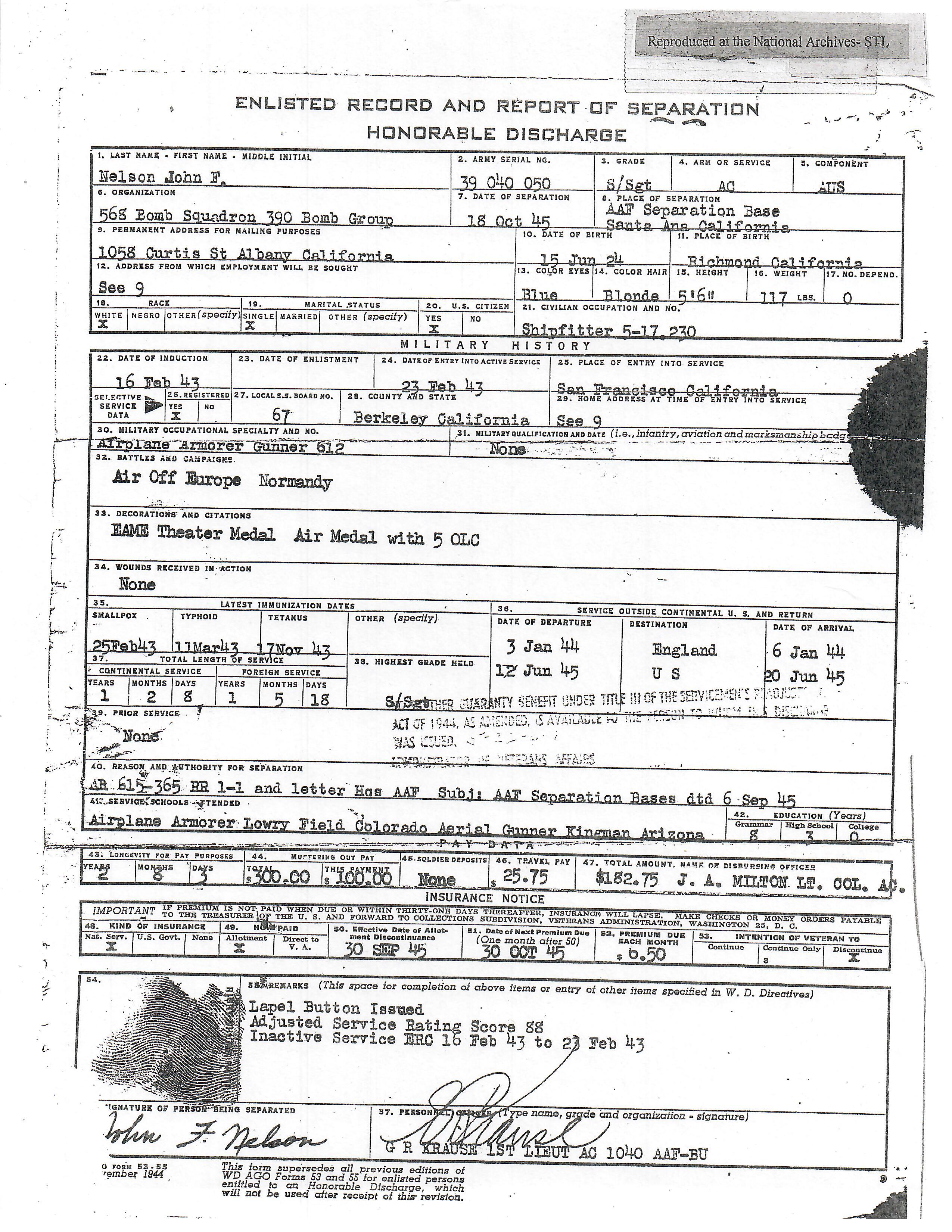 Original Items: One-of-a-kind set. Sergeant John Frederick Nelson ASN 39040050 was assigned to the 8th Air Force, 390th Bombardment Group, 568th Bomb Squadron during World War Two. He was a ball turret gunner aboard various Boeing B-17 Flying Fortresses and flew dozens of successful missions earning him the Air Medal with three oak leaf clusters. On June 25th, 1944 as part of 2nd Lt. Kenneth L. Houghton crew, his plane was shot down. He survived but was captured and sent to Stalag Luft IV. he was liberated from that camp on May 8th, 1945.