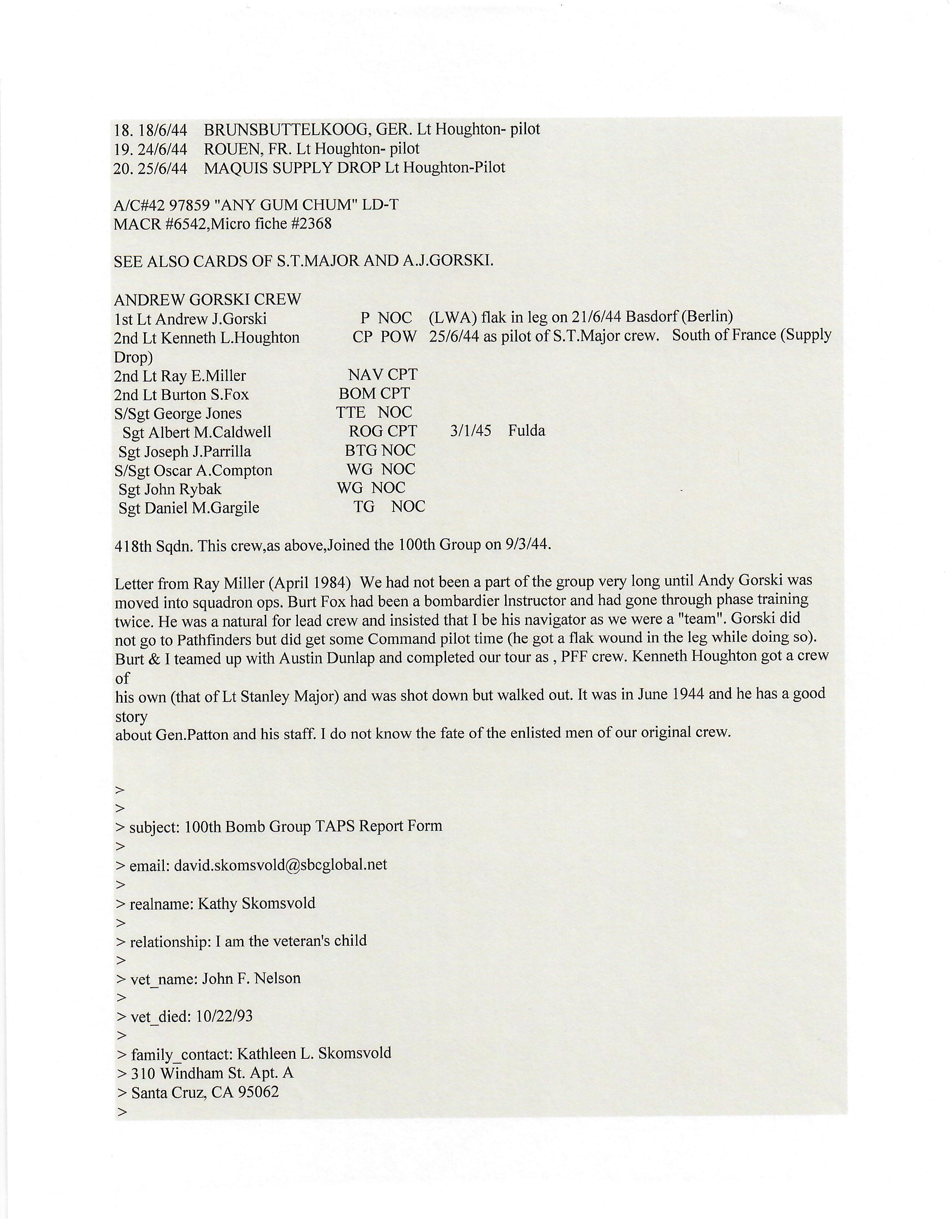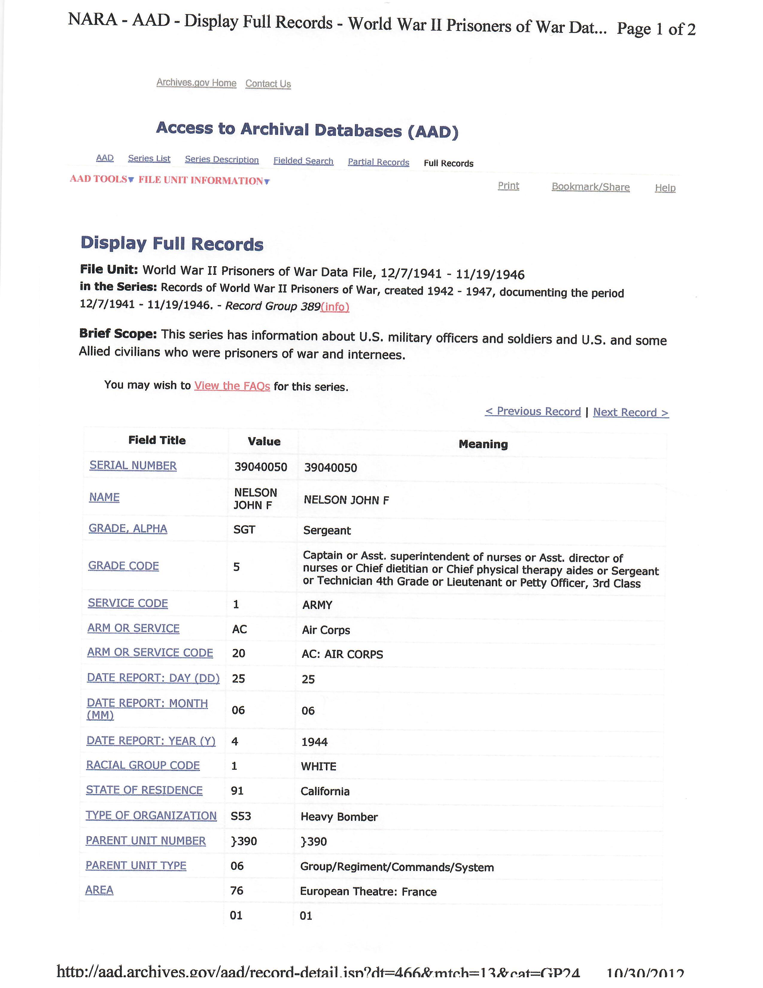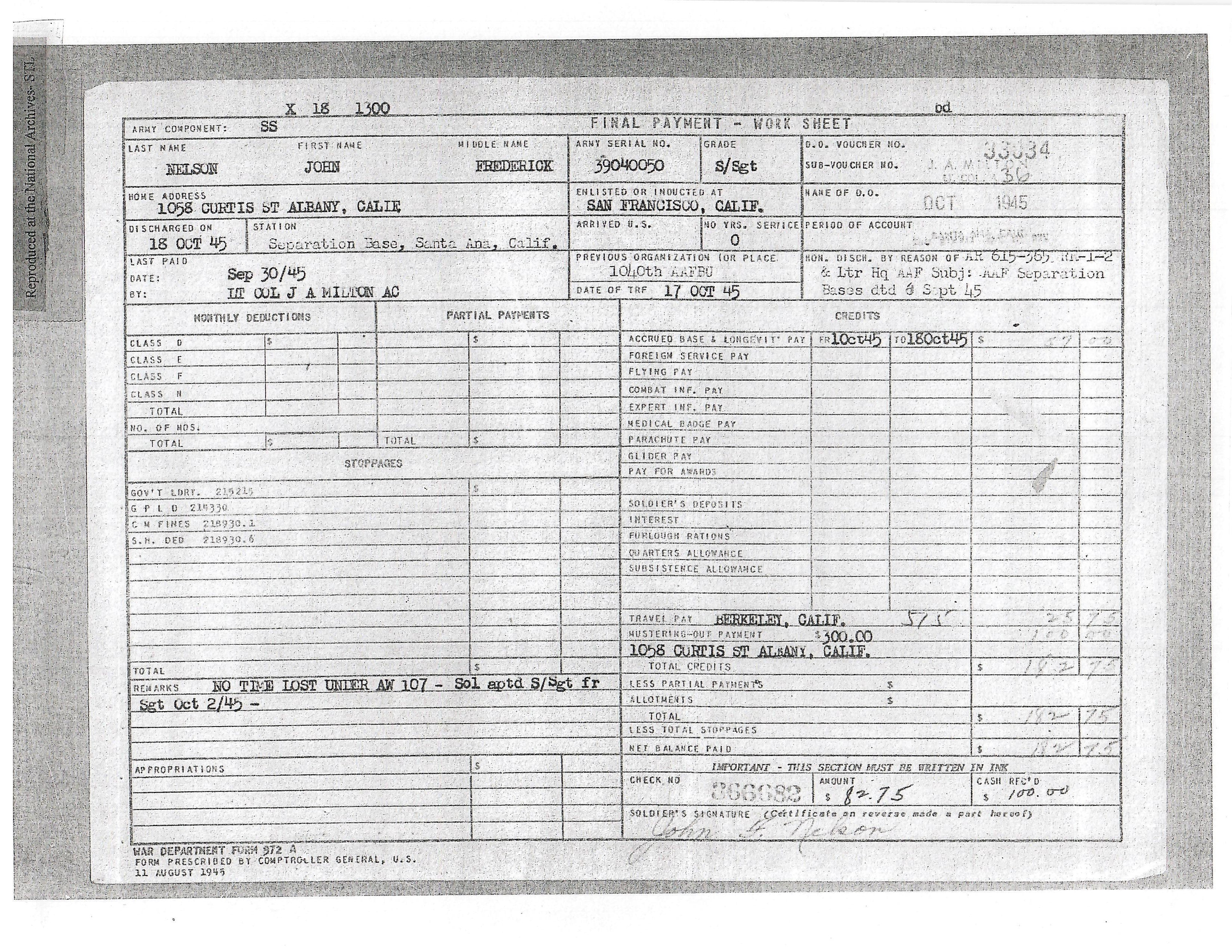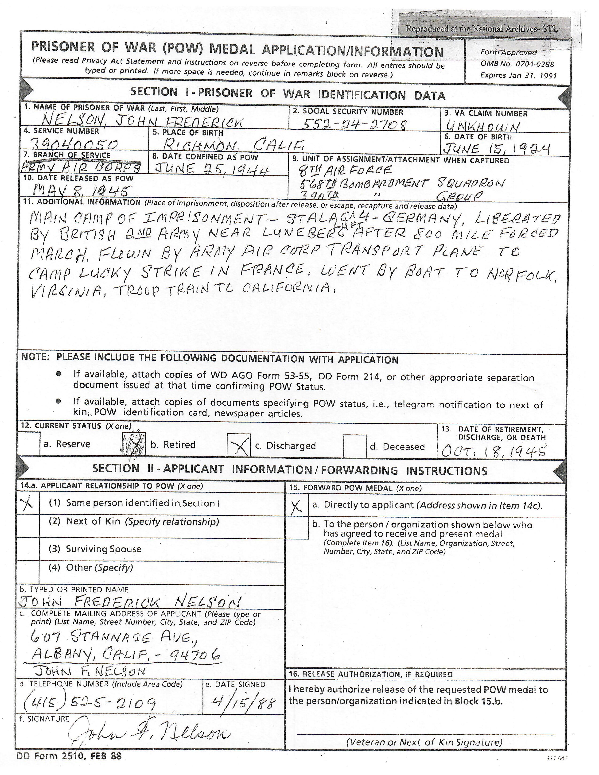 Original Items: One-of-a-kind set. Sergeant John Frederick Nelson ASN 39040050 was assigned to the 8th Air Force, 390th Bombardment Group, 568th Bomb Squadron during World War Two. He was a ball turret gunner aboard various Boeing B-17 Flying Fortresses and flew dozens of successful missions earning him the Air Medal with three oak leaf clusters. On June 25th, 1944 as part of 2nd Lt. Kenneth L. Houghton crew, his plane was shot down. He survived but was captured and sent to Stalag Luft IV. he was liberated from that camp on May 8th, 1945.