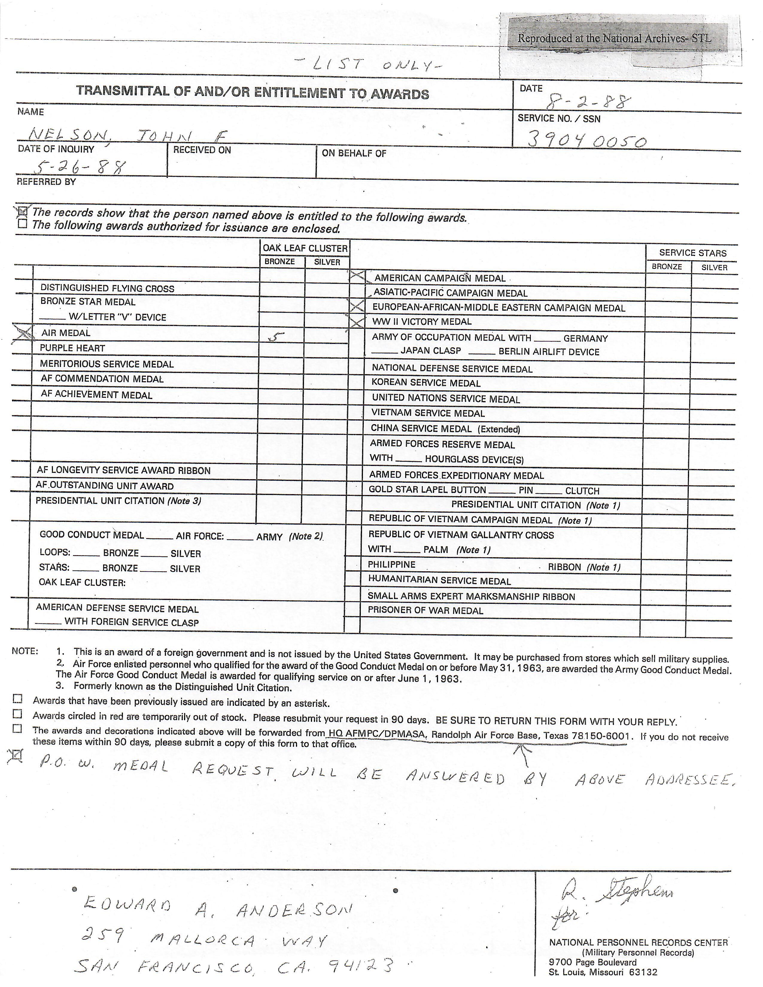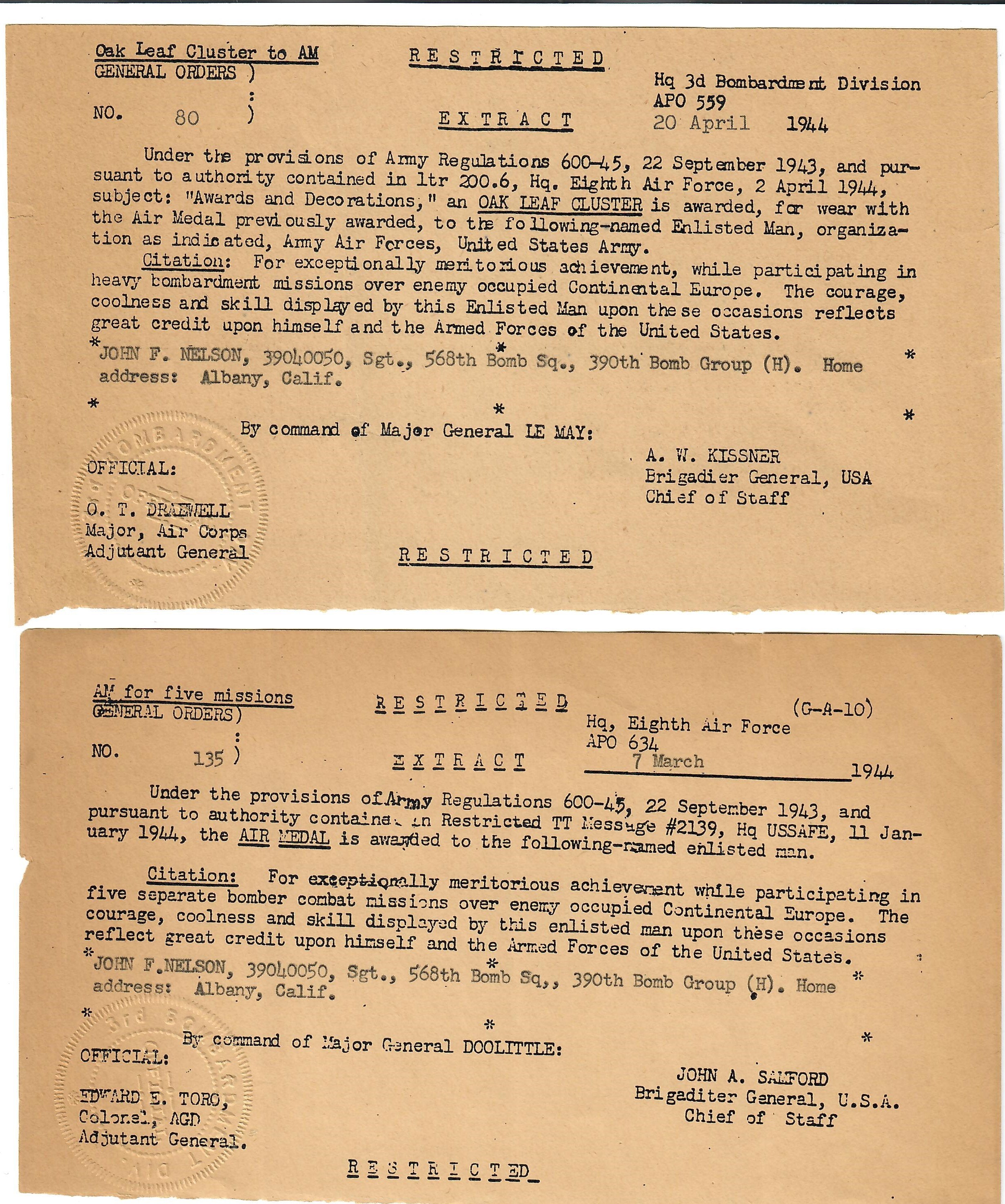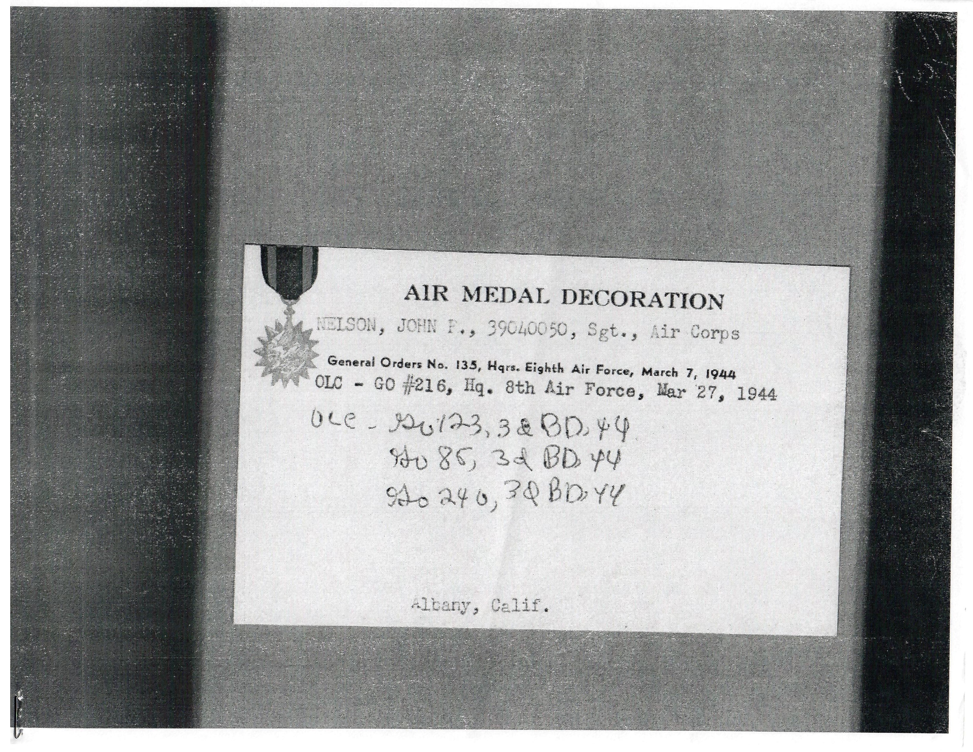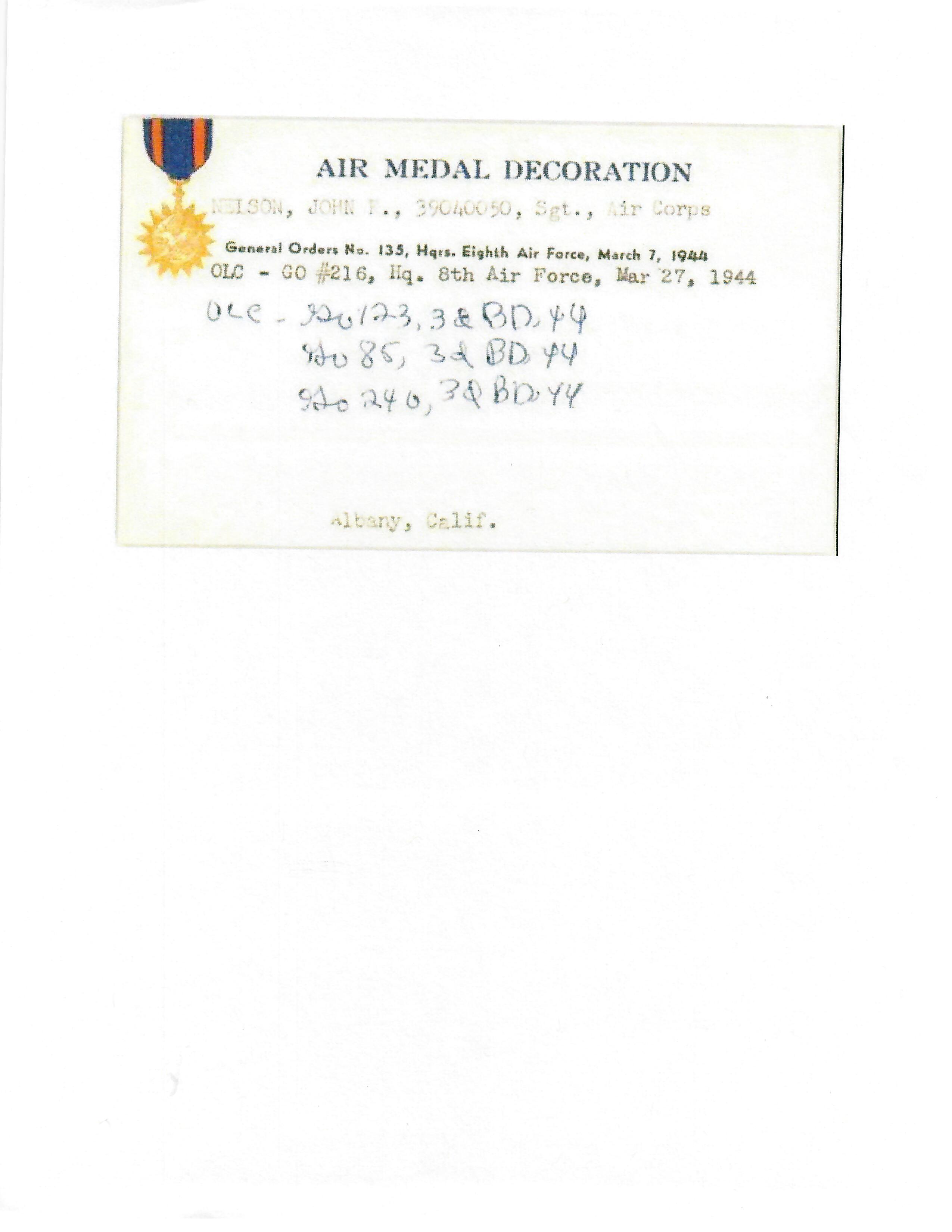 - Original Air Medal citation and oak leaf citation.