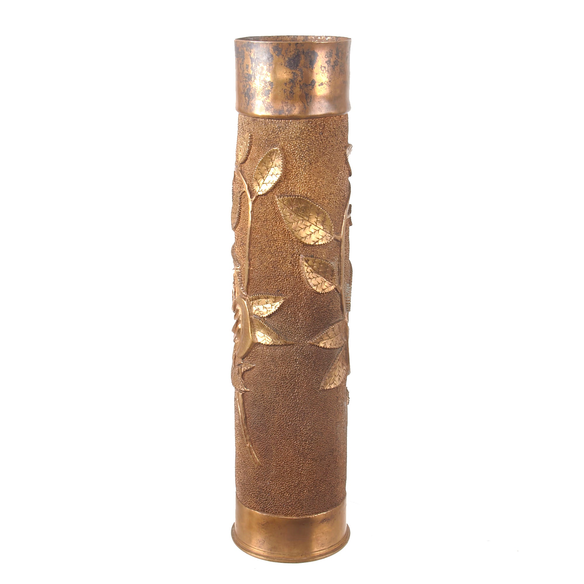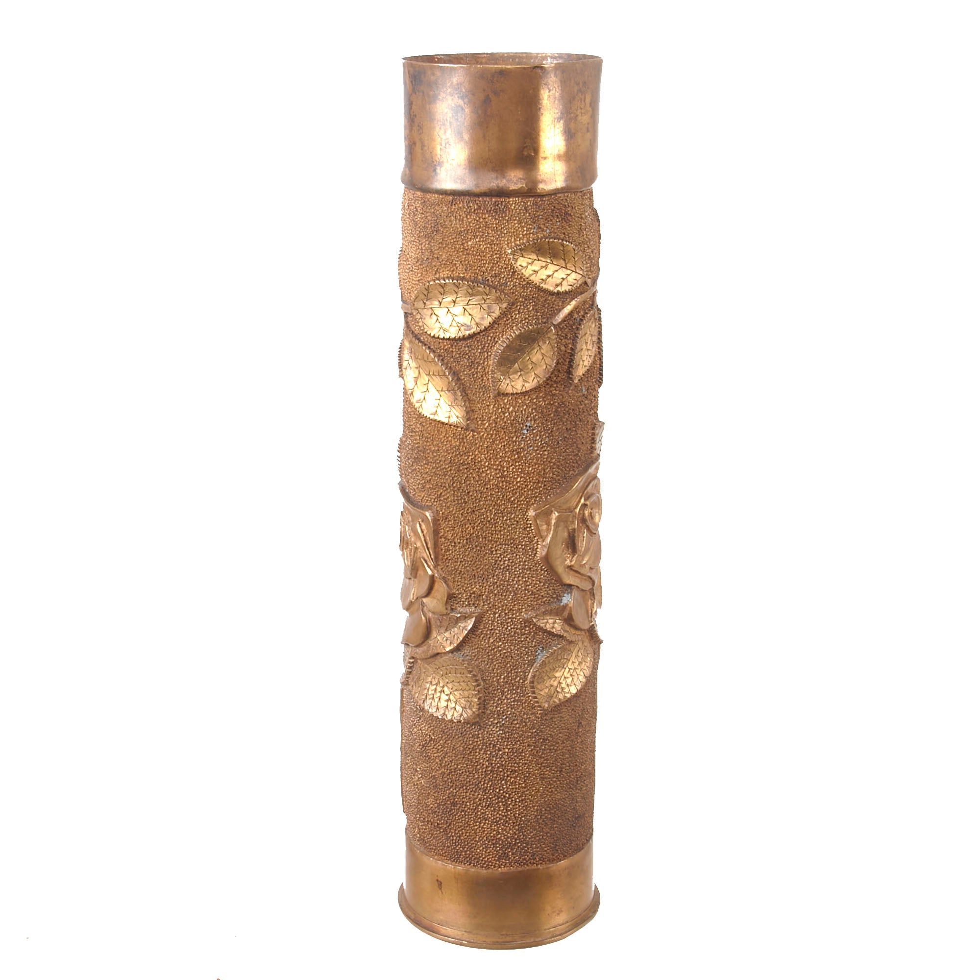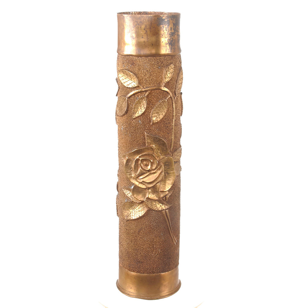 This is a lovely WWII artillery shell, likely of French or German origin, which has been meticulously stamped and decorated with motifs of roses and vinery. The detail is tremendous, with the individual midribs & veins etched into each leaf. This was a piece that certainly took a great deal of effort and time to complete.
