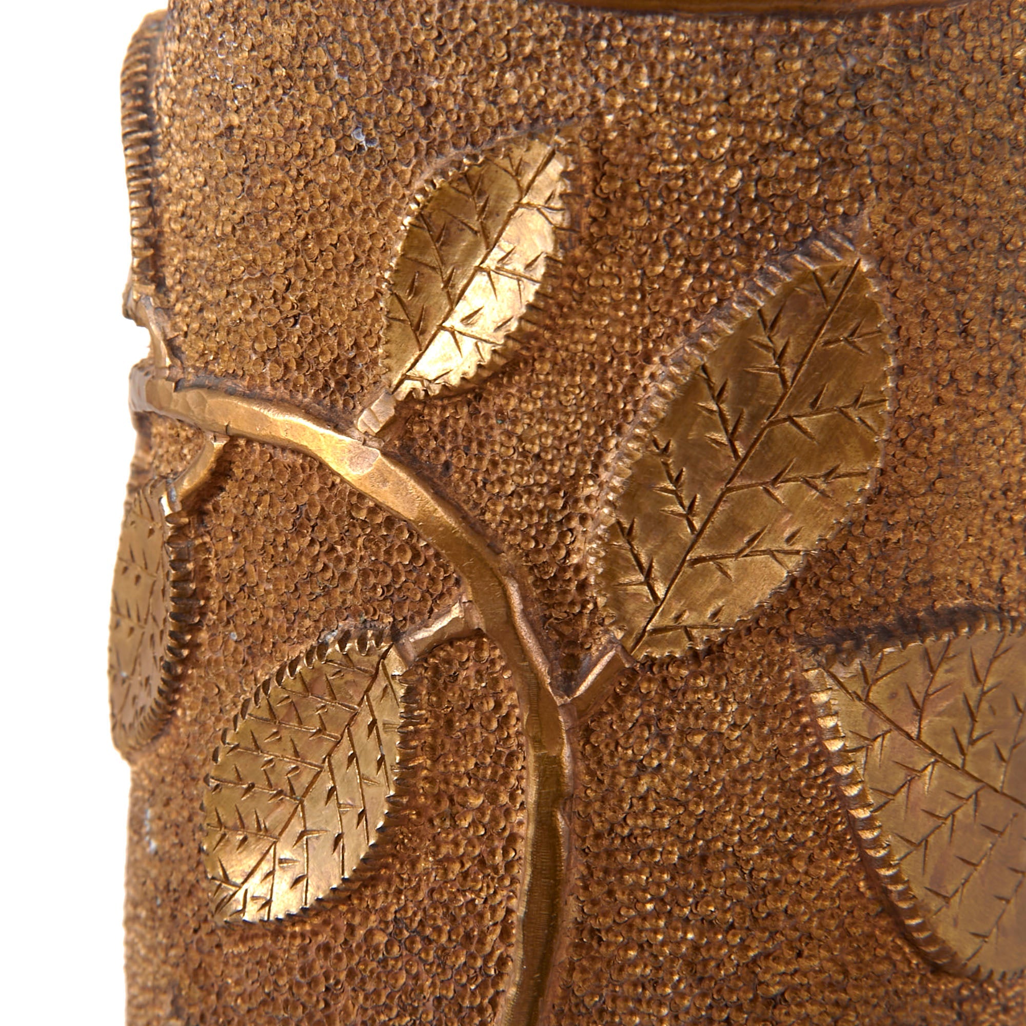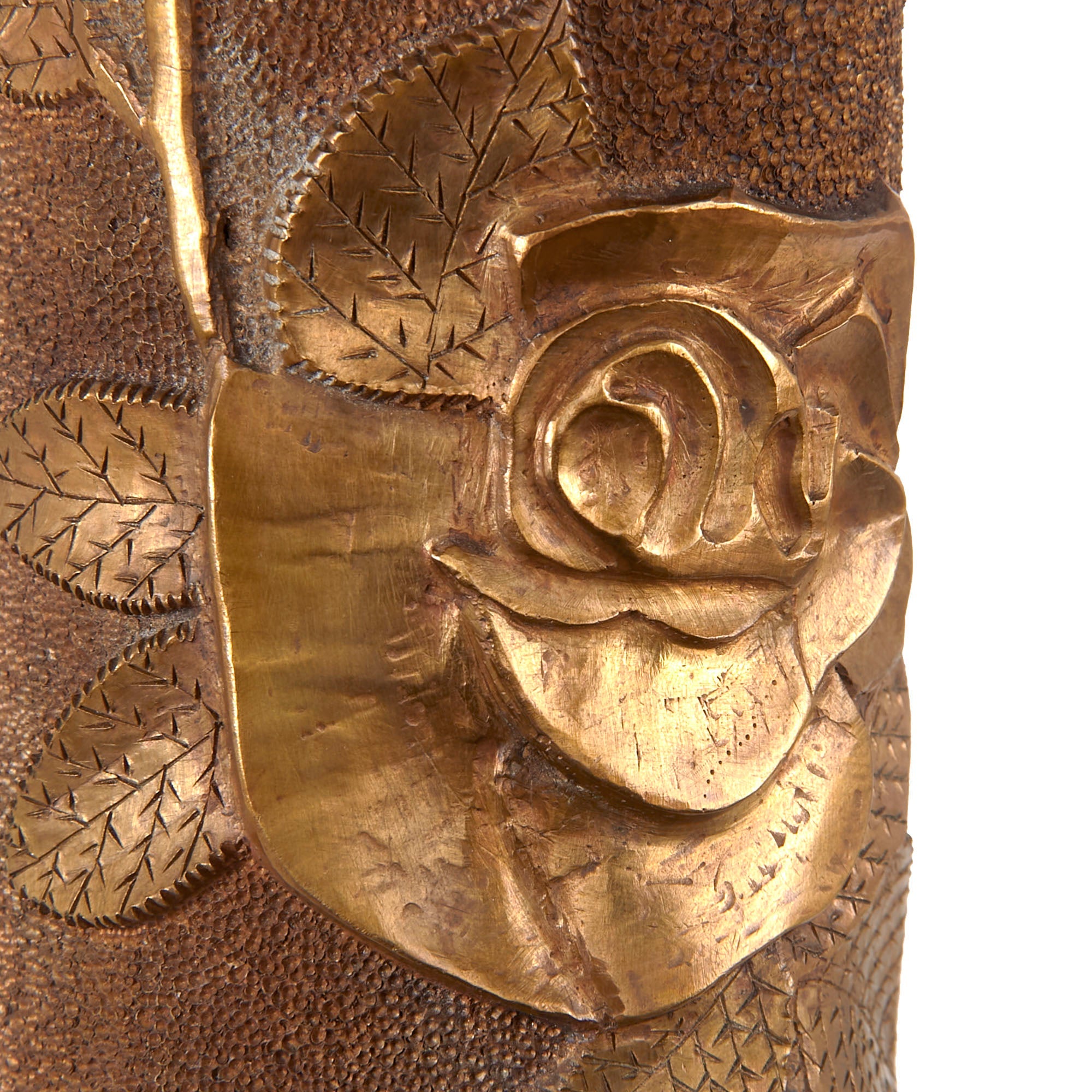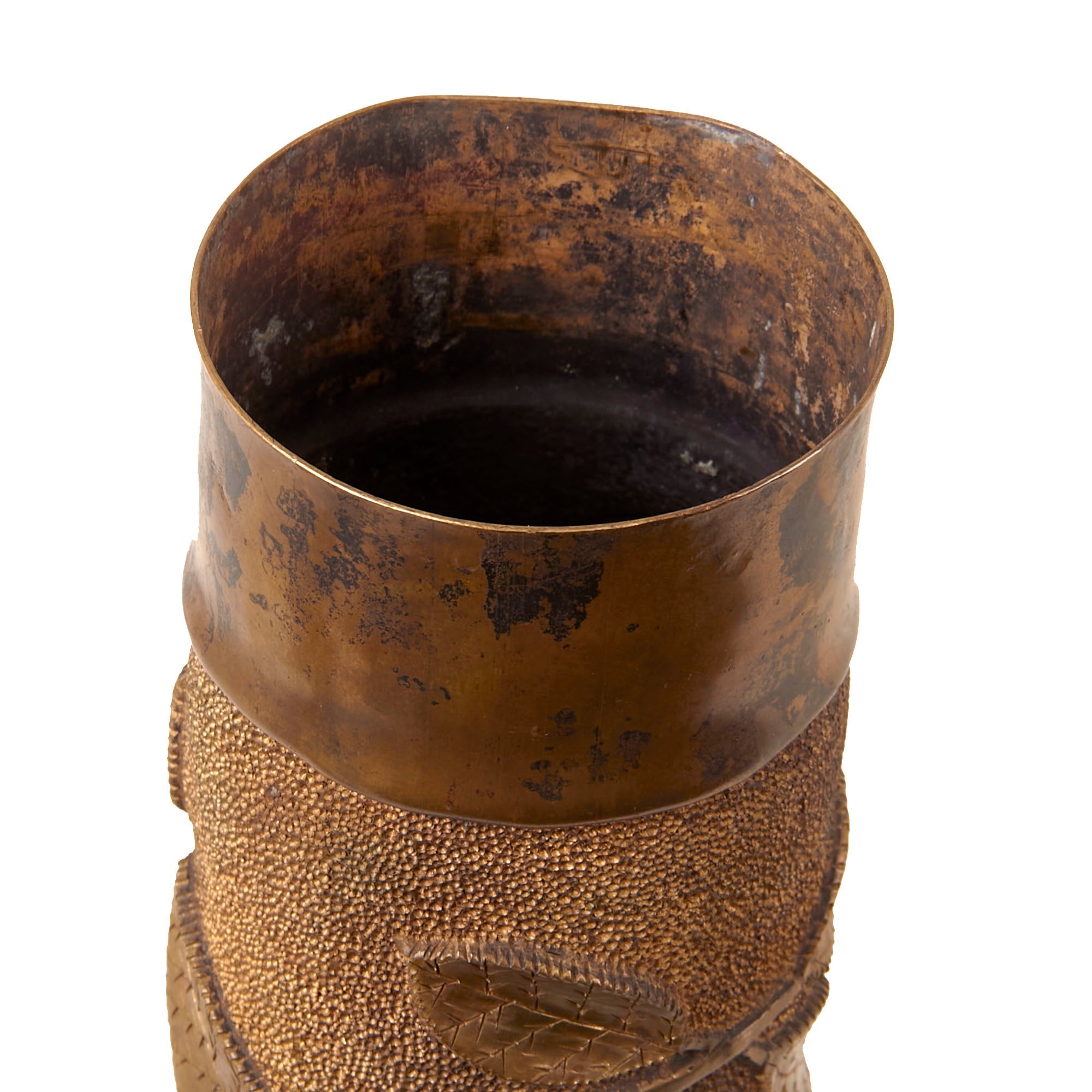 This is a lovely WWII artillery shell, likely of French or German origin, which has been meticulously stamped and decorated with motifs of roses and vinery. The detail is tremendous, with the individual midribs & veins etched into each leaf. This was a piece that certainly took a great deal of effort and time to complete.