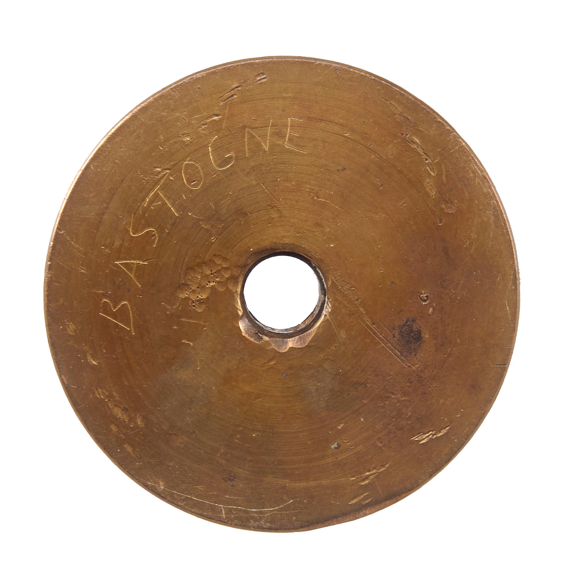 The shell measures 13⅞” tall with a 3⅜” base diameter. There are no markings on the shell which would identify the country of origin. The bottom of the shell is scratched BASTOGNE which may indicate that the round was fired into the town of Bastonge, but the engraving is crude, and we have no provenance to back this up.