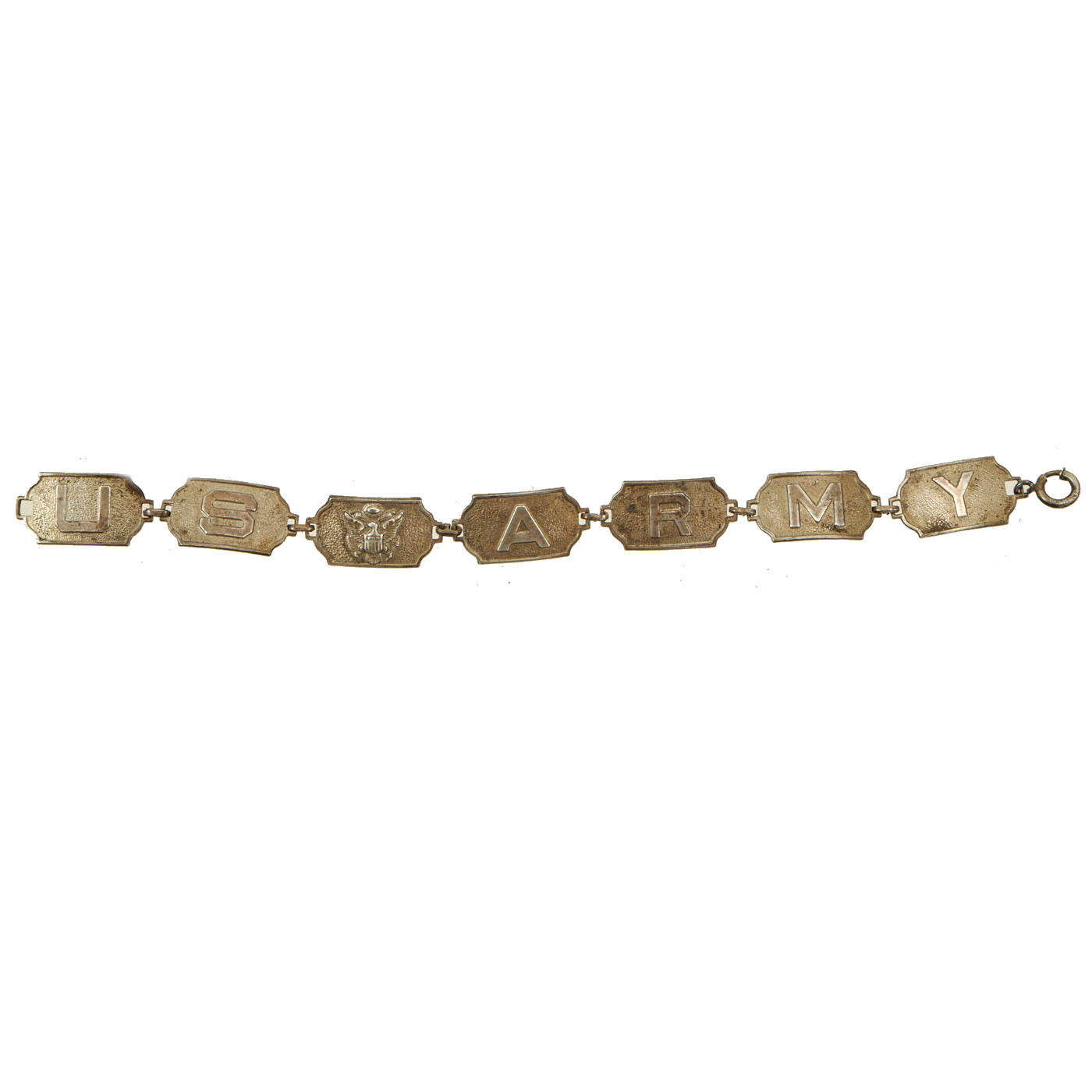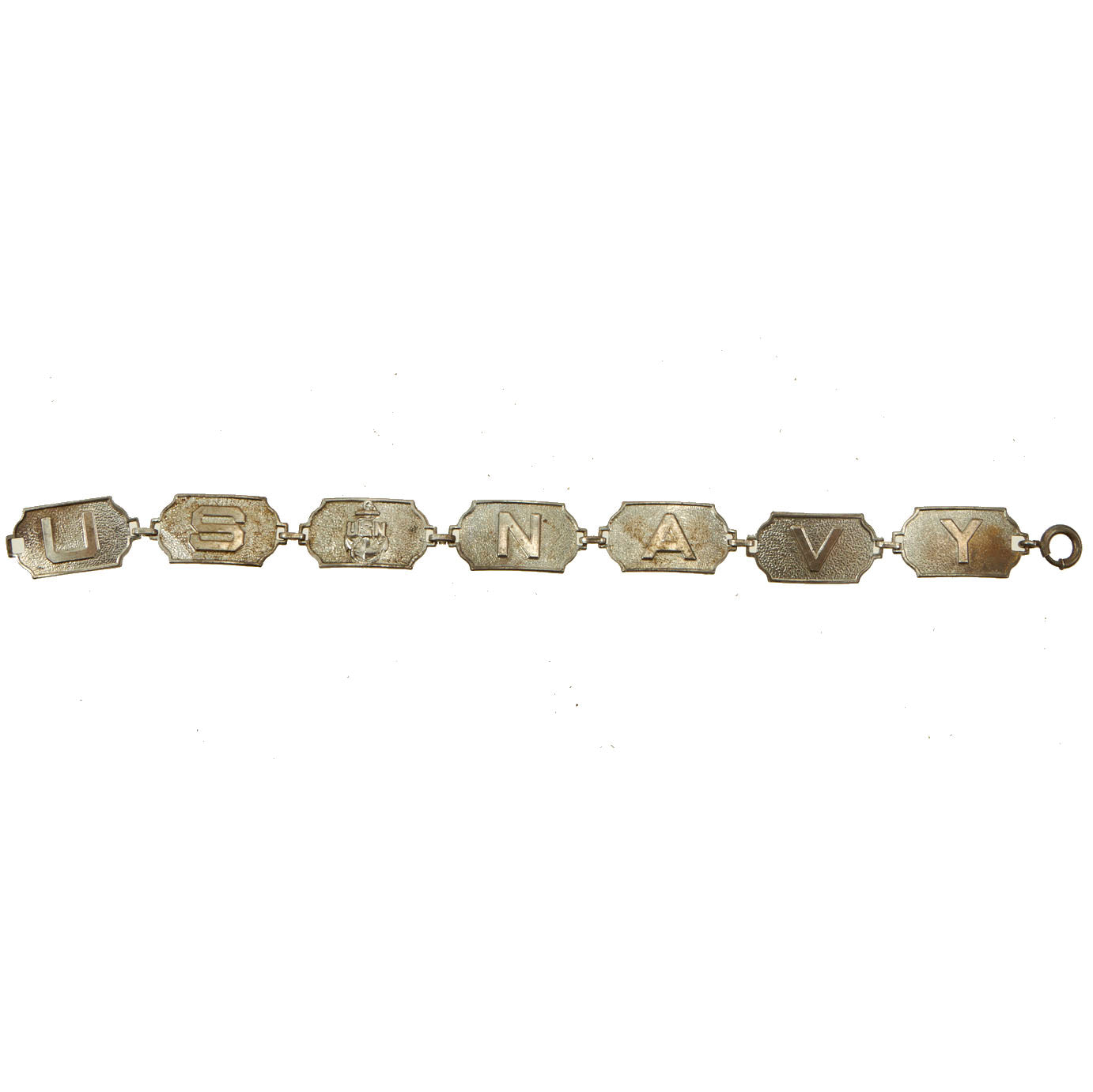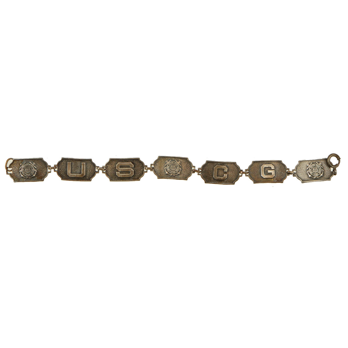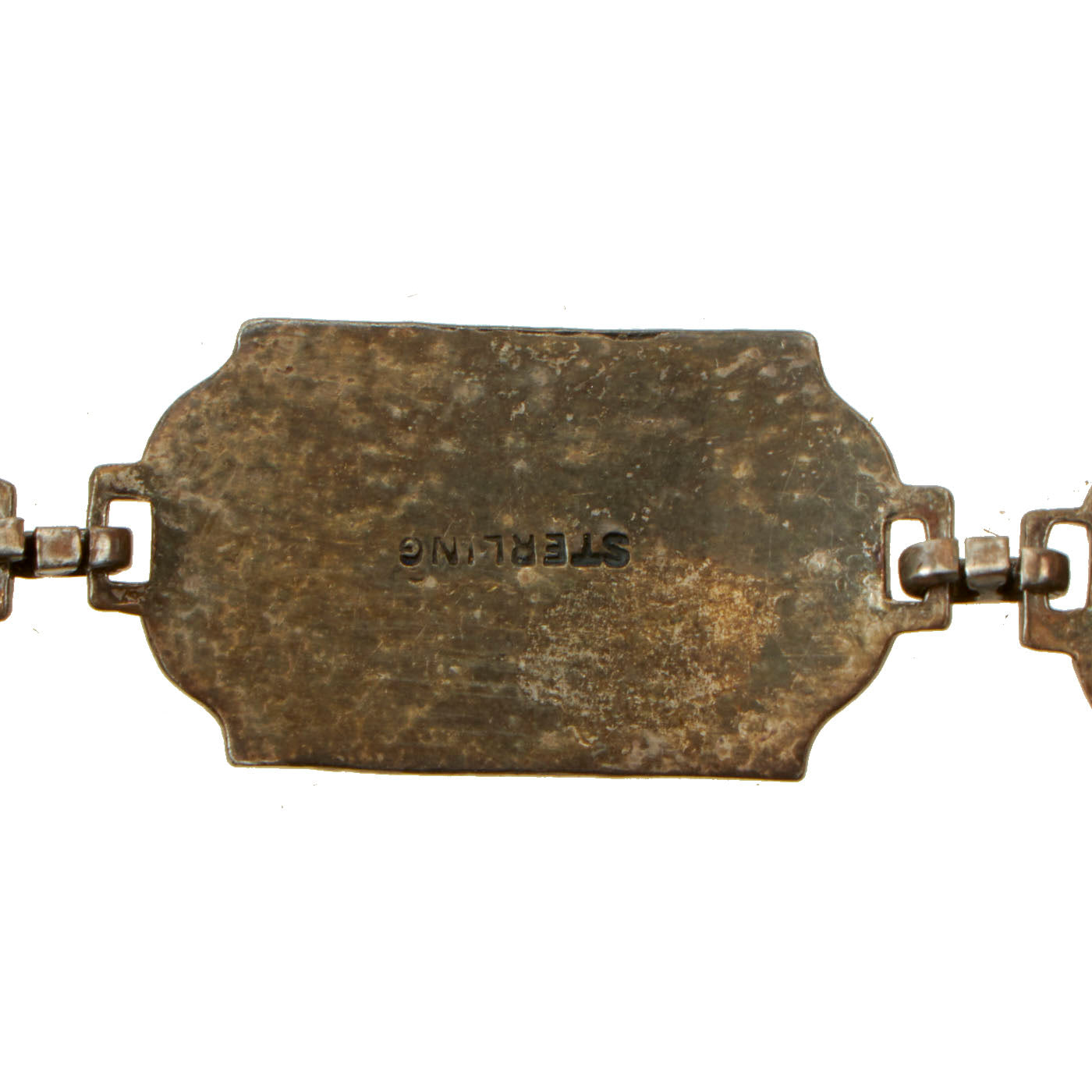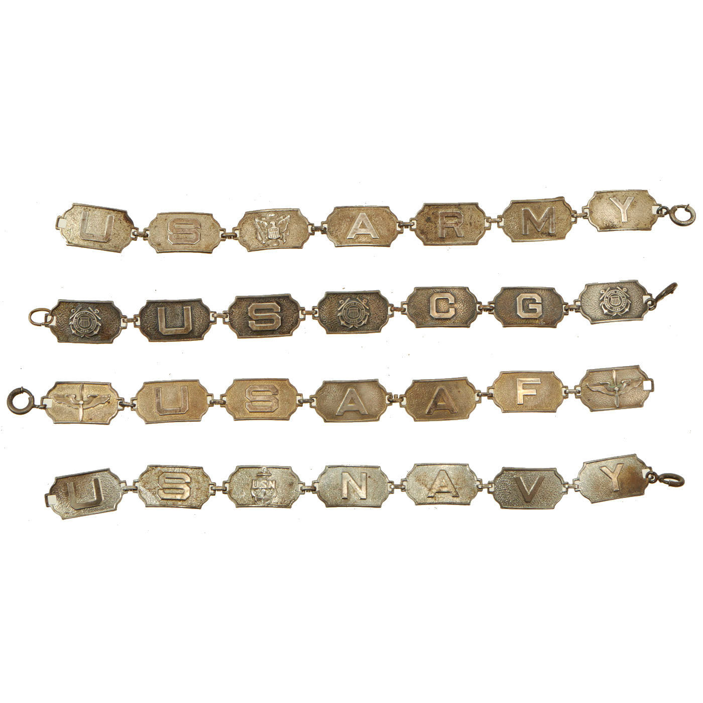 These are very nice examples of sweetheart bracelets, each composed of 7 linked sections, with an end clasp that locks into the other end, securing the bracelet. The sections of this bracelet are marked with the initials of the branches, as well as the proper insignia. The "locking" section is marked “Sterling”. The bracelets all measure approximately 7 inches not including the clasp section, and are all marked STERLING on the back.
