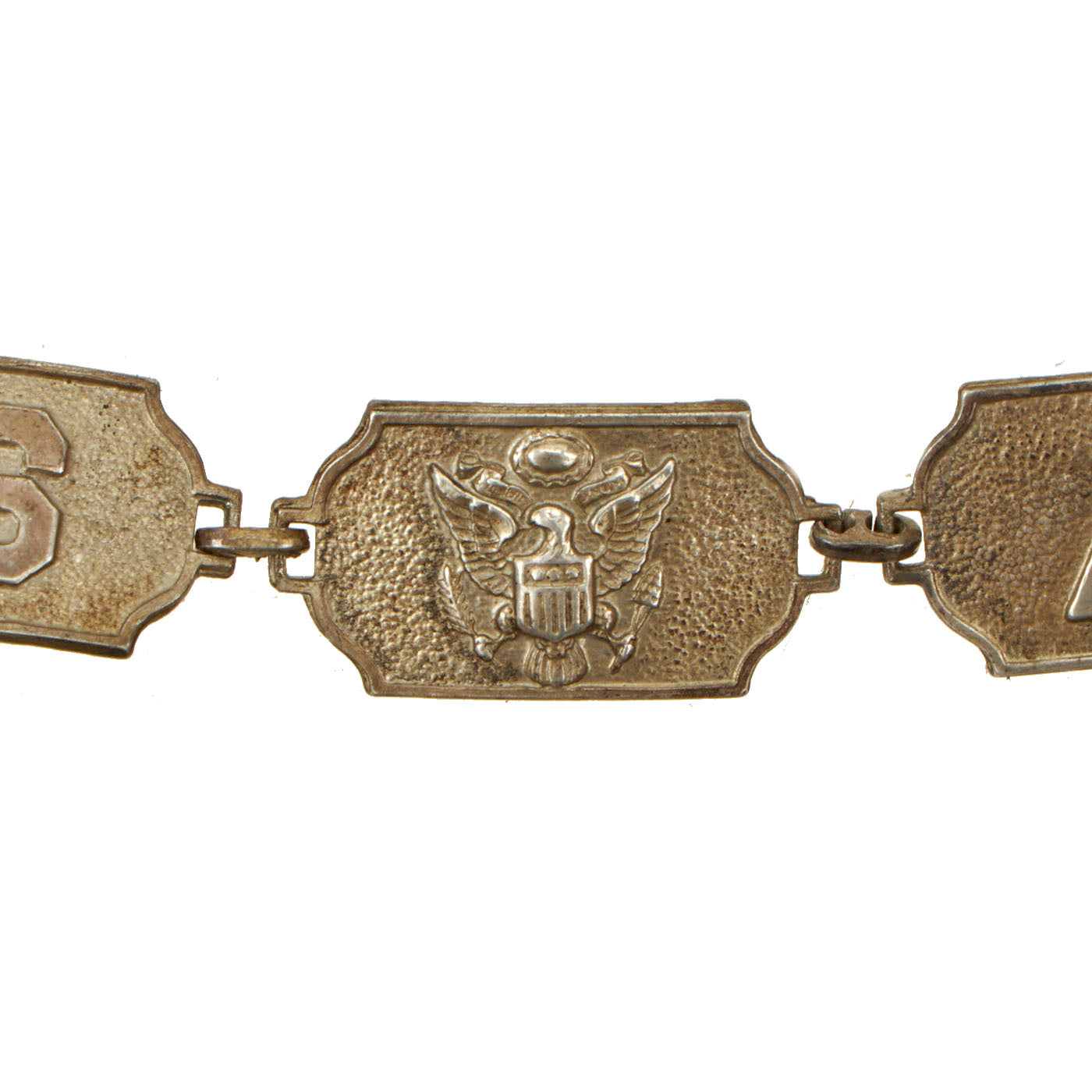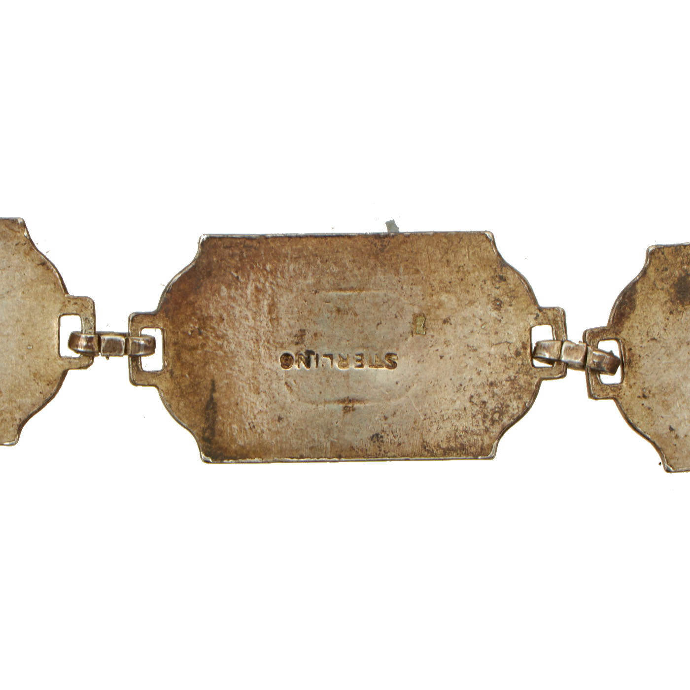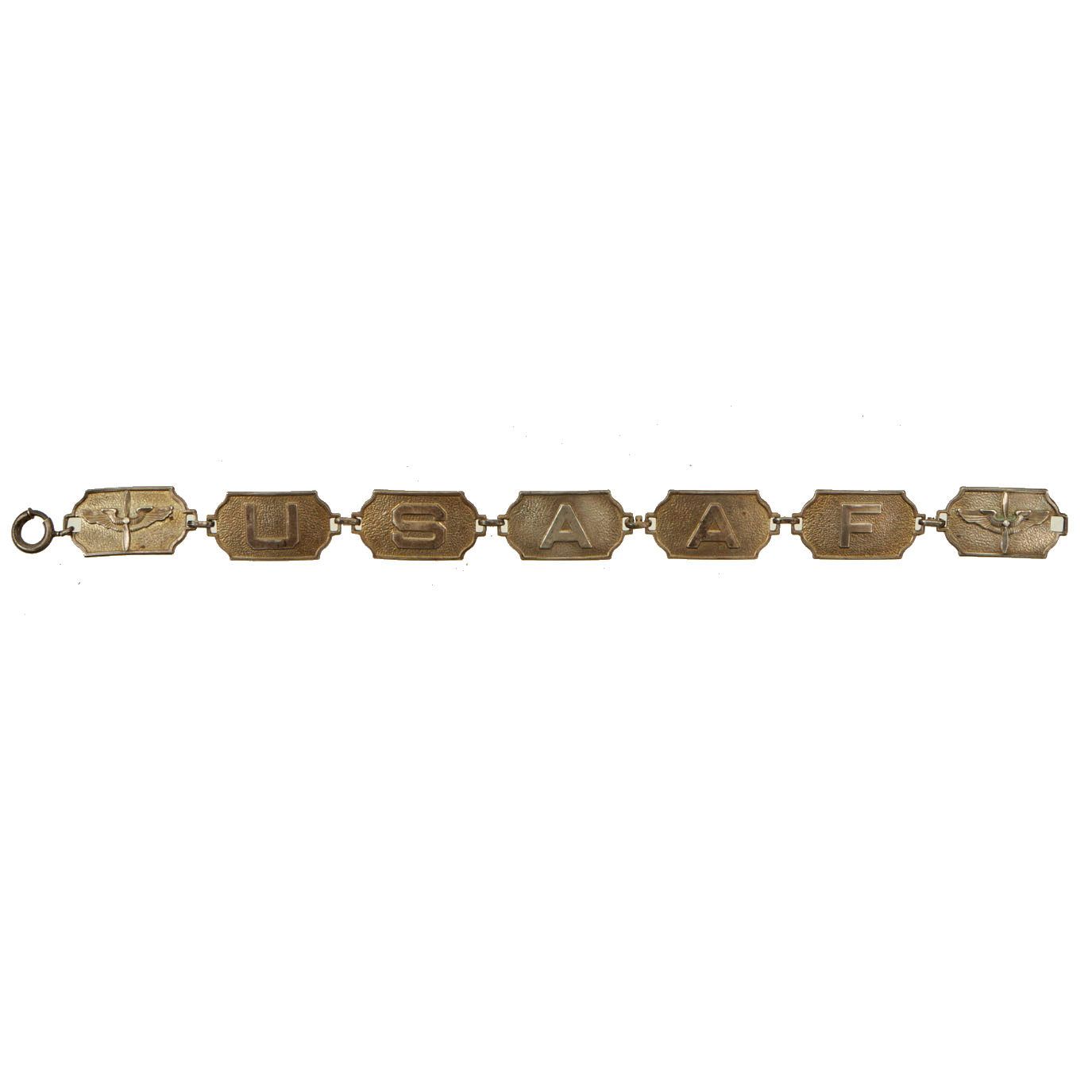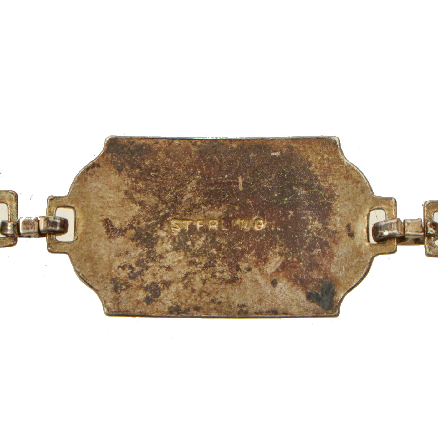 These are very nice examples of sweetheart bracelets, each composed of 7 linked sections, with an end clasp that locks into the other end, securing the bracelet. The sections of this bracelet are marked with the initials of the branches, as well as the proper insignia. The "locking" section is marked “Sterling”. The bracelets all measure approximately 7 inches not including the clasp section, and are all marked STERLING on the back.