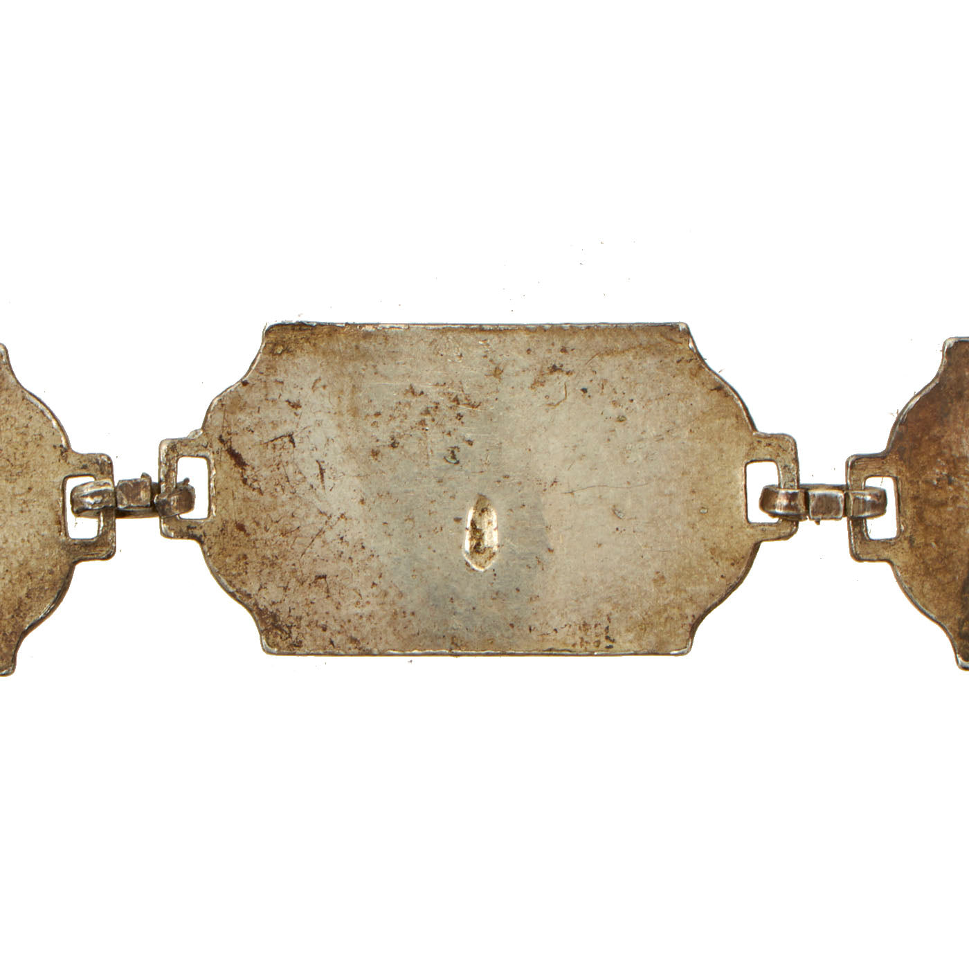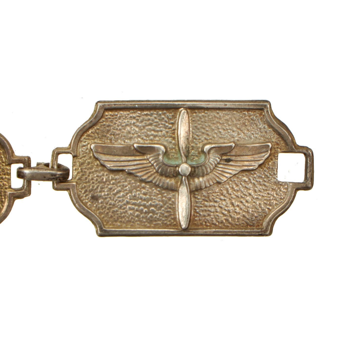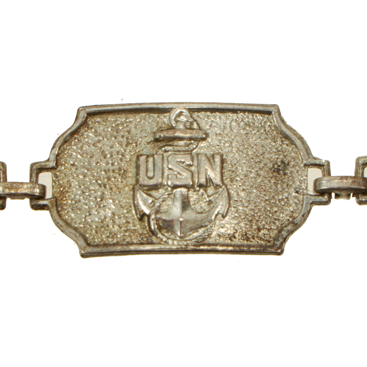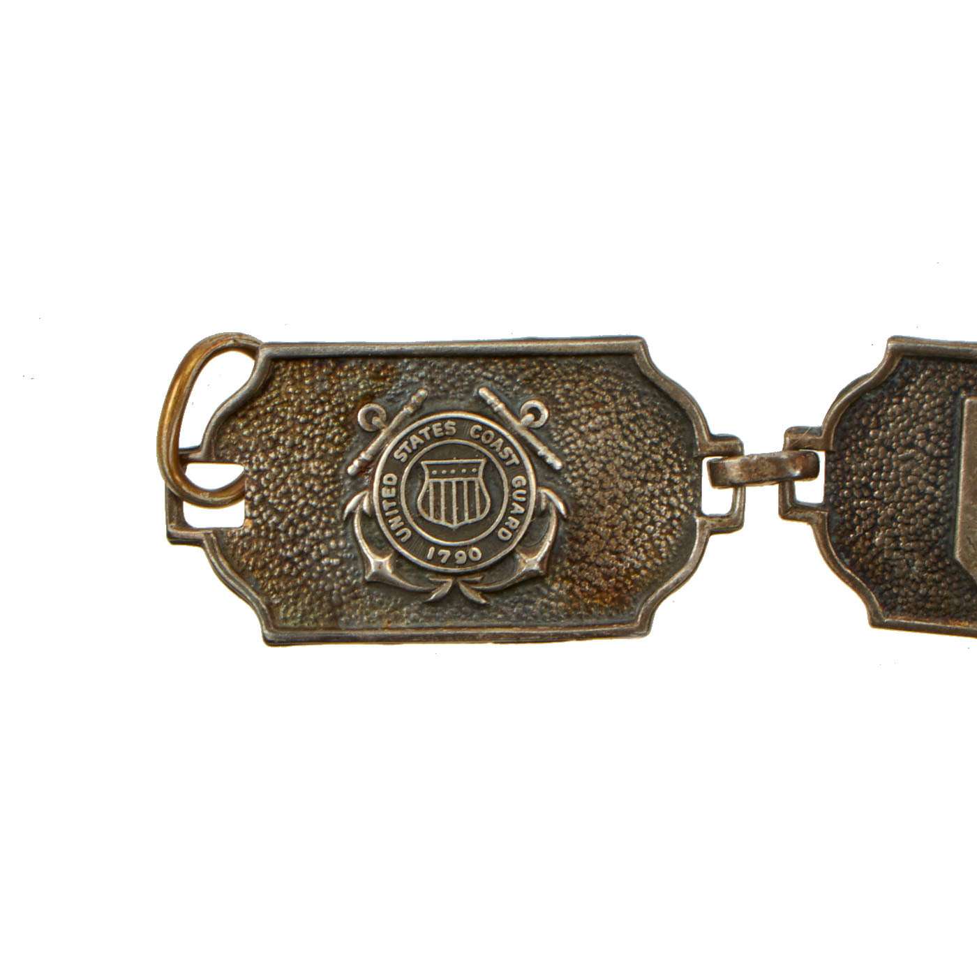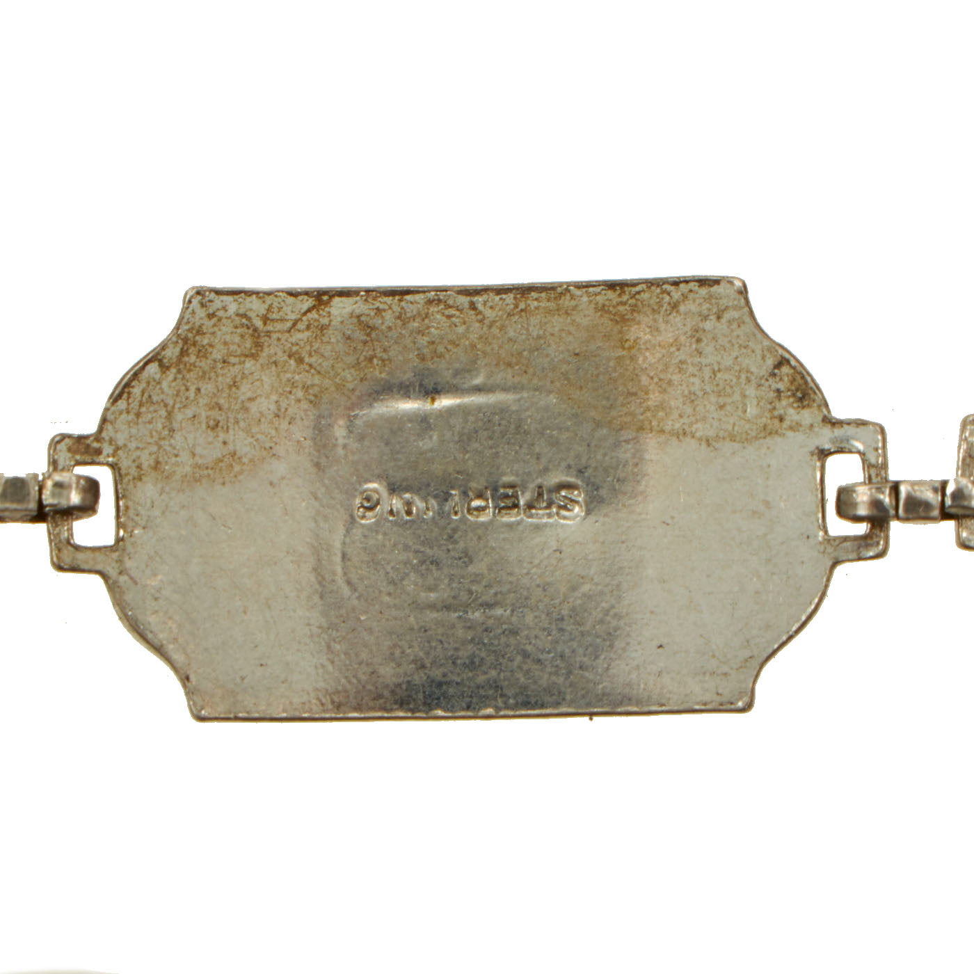 These are very nice examples of sweetheart bracelets, each composed of 7 linked sections, with an end clasp that locks into the other end, securing the bracelet. The sections of this bracelet are marked with the initials of the branches, as well as the proper insignia. The "locking" section is marked “Sterling”. The bracelets all measure approximately 7 inches not including the clasp section, and are all marked STERLING on the back.
