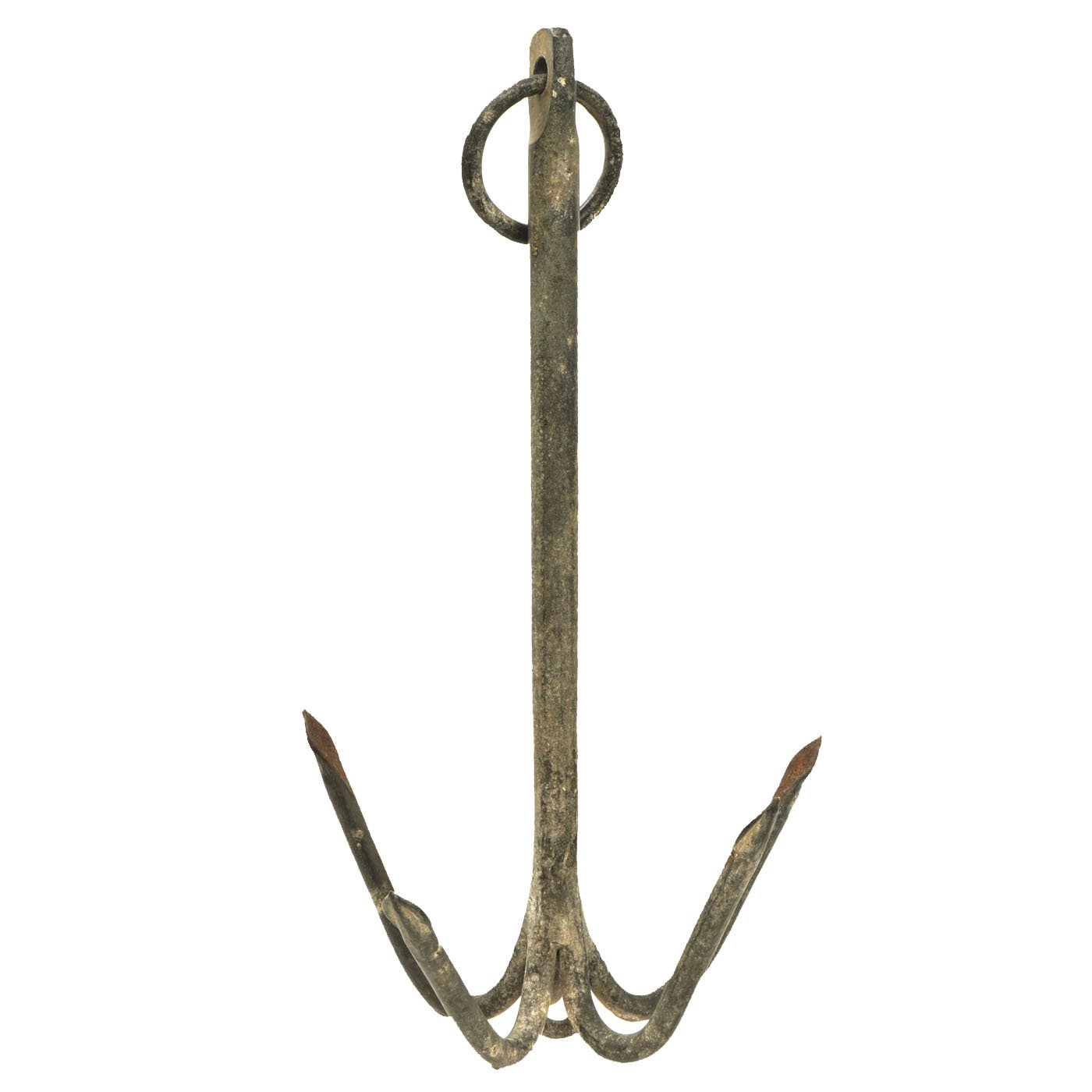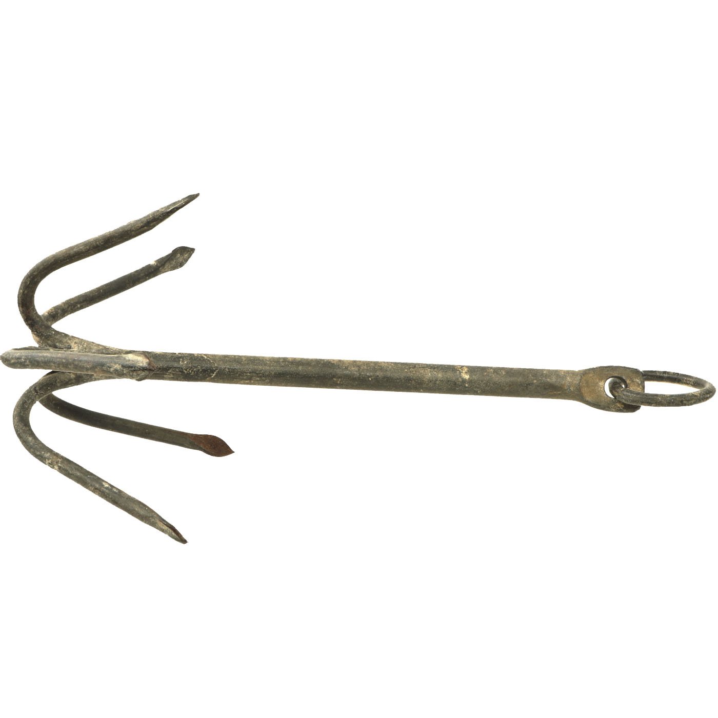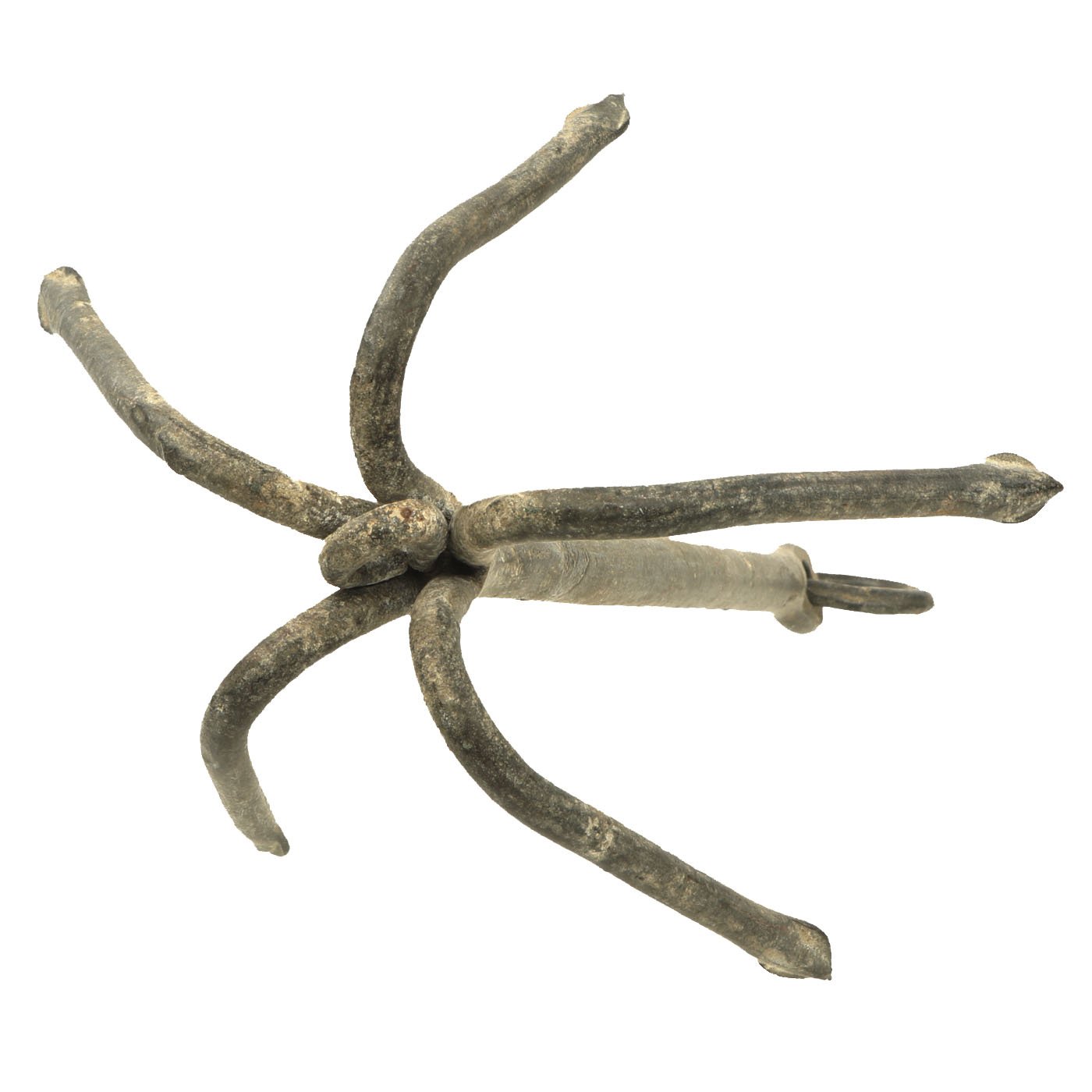 Original Item: Only One Available. We don't know exactly when this gripping hook was manufactured, but assume it is post World War Two, and this is not the style rocket propelled grappling hook that was used on D-Day. Instead this style was used by American forces for for anchoring ropes, ladders and lines that held equipment and vehicles. This is a very nice example and will add aesthetic value to any D-Day display. It measures 19" long with a hook diameter of 10" and has rings on both ends.