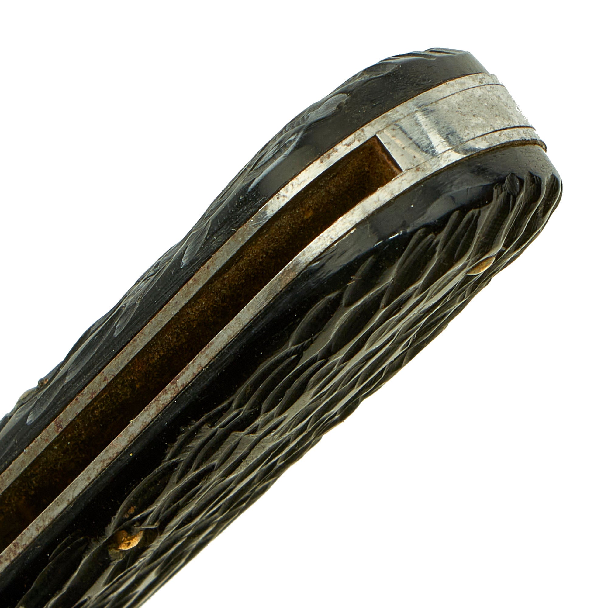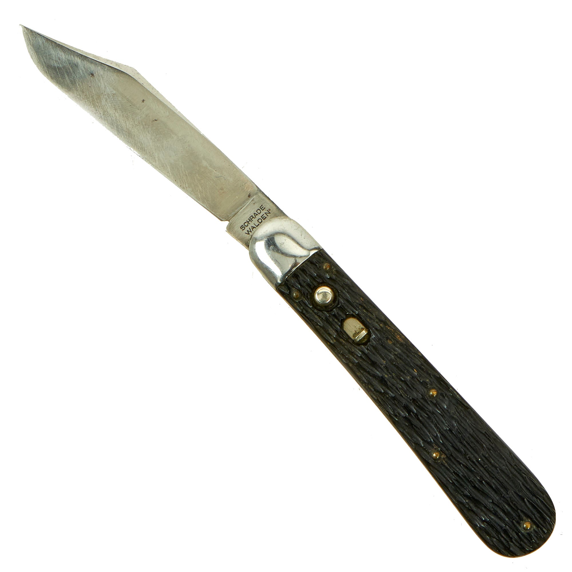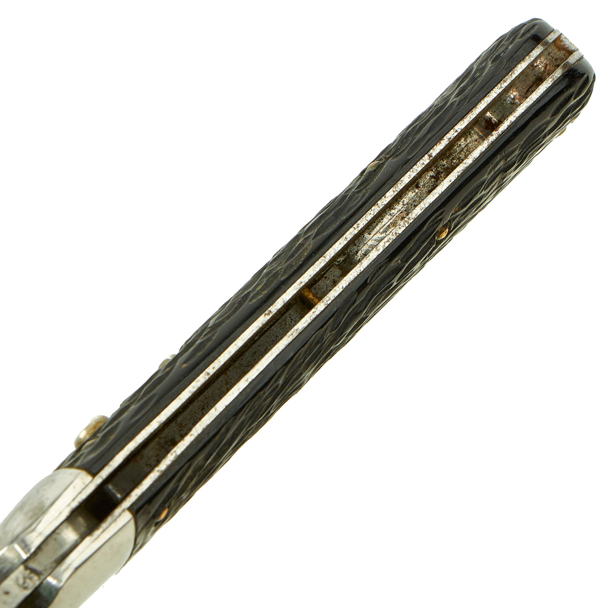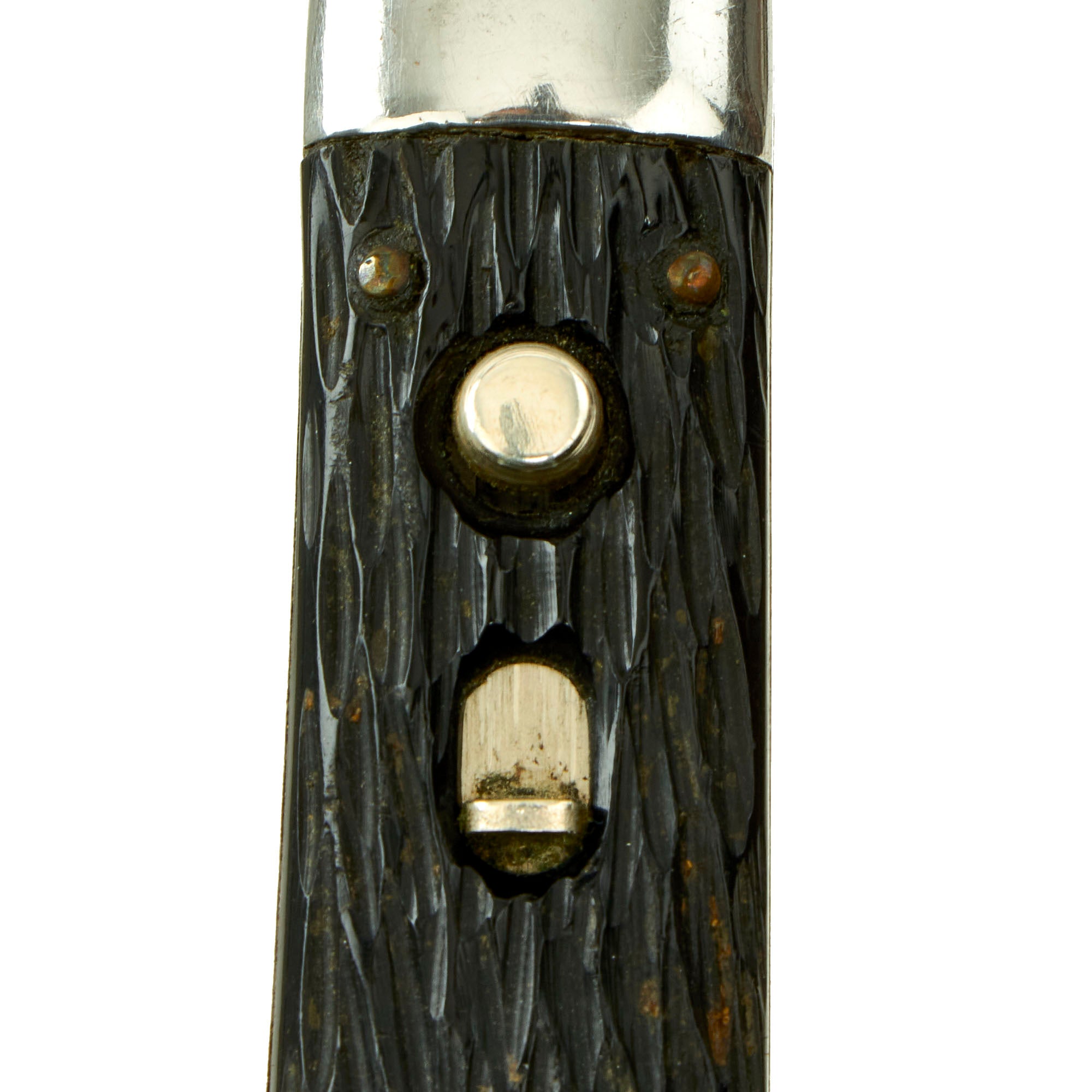 Overall measurement is 7 ⅛ inch, with a 4" long blade. The spring is still strong, and opens with ease, and locks in place. Safety mechanism is functional. Artificial horn grips show signs of honest wear, and some slight cracking to each grip panel. Our example shows signs of honest wear from use, and very light sharpening, as well as some past oxidation.