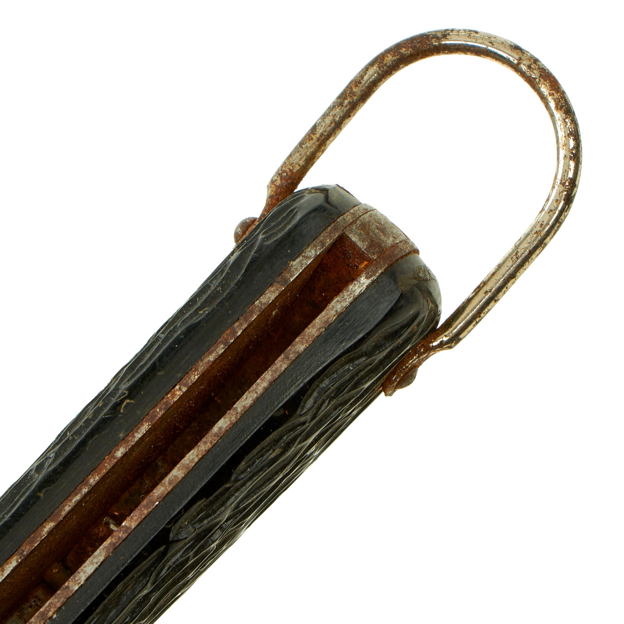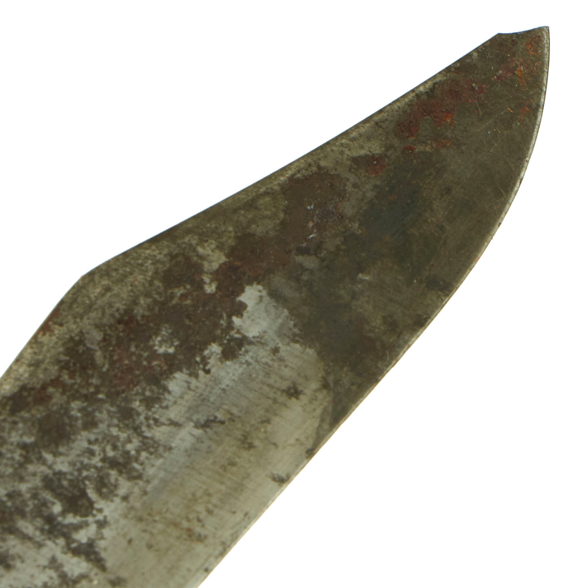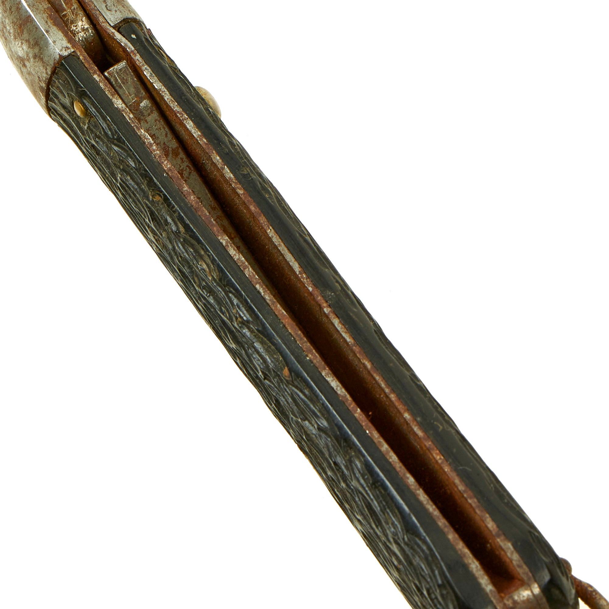 This very nice used example is in mostly functional condition (does not lock) and comes complete with a bail (ring) on the end for a lanyard, indicating military issue. Condition is fair, with a nice semi-sharp blade but it does have a broken point. It does show some use and sharpening, as these were often used in the field. It is marked on the base of the blade with: