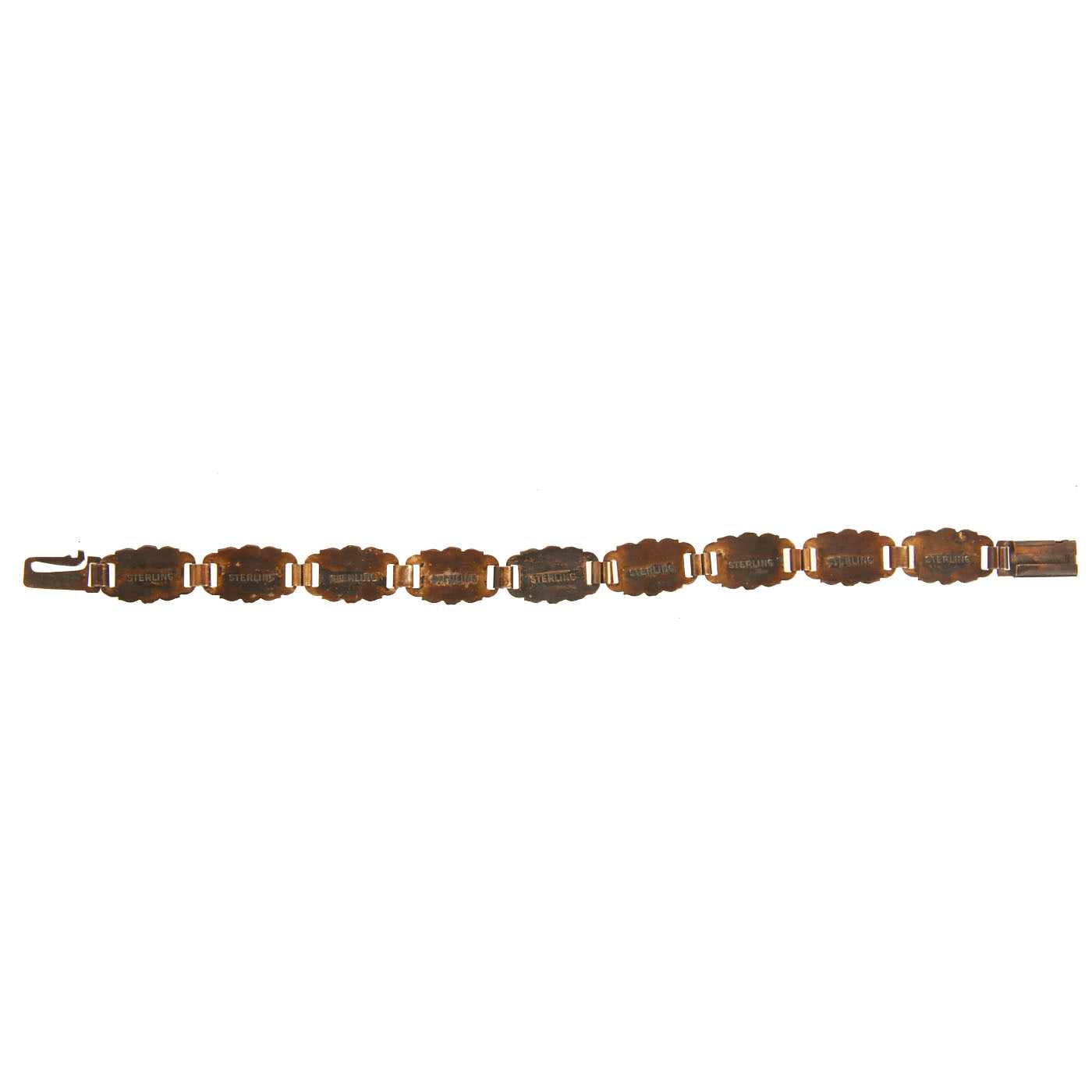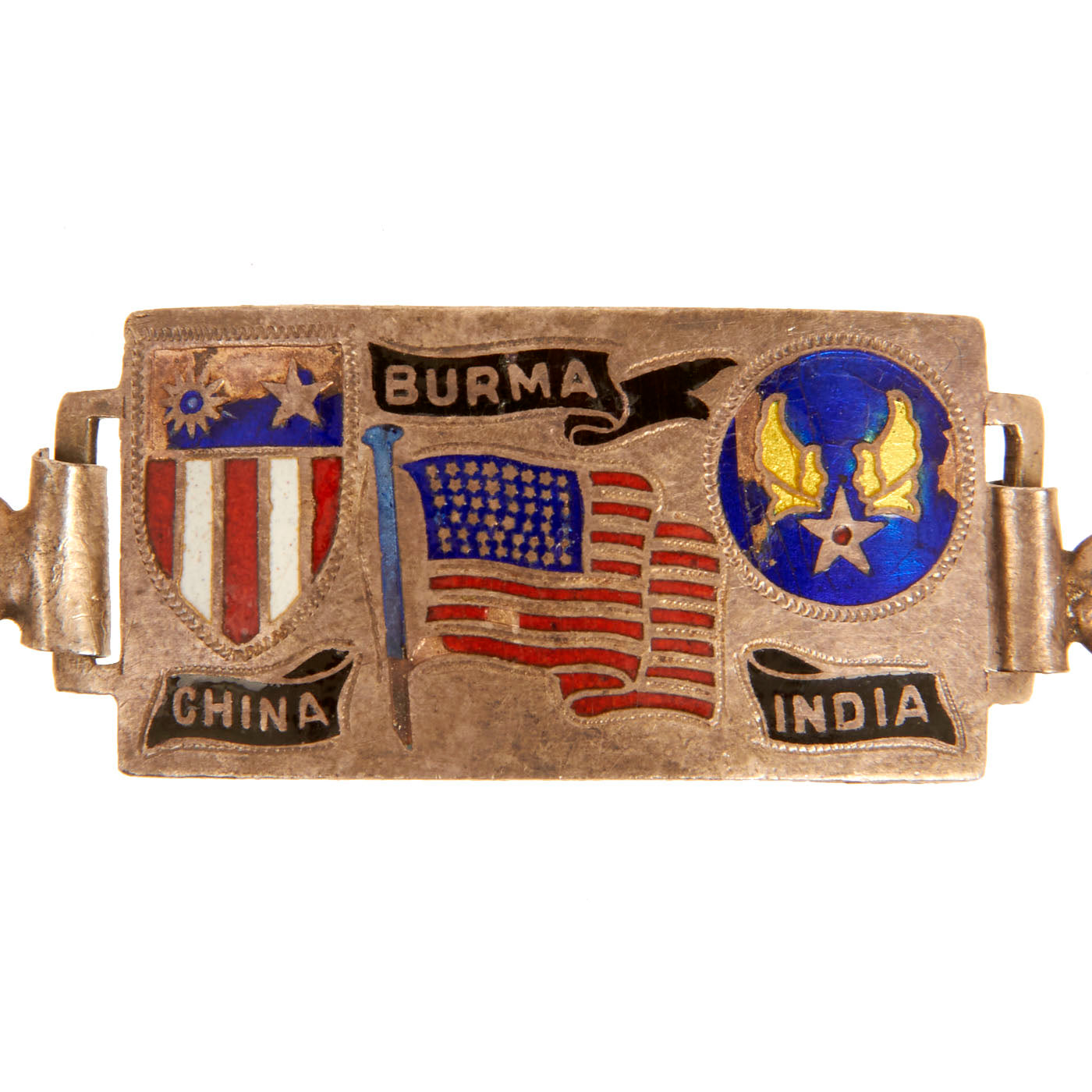 - China-Burma-India Theater USAAF Bracelet: The bracelet measures approximately 8” and appears to be of sterling silver construction, judging by the “silver” text engraved on the back. The front “cuff” off the bracelet features a lovely CBI flag, American Flag and Army Air Corps insignia. In black scrolls underneath and above the symbols are CHINA - BURMA - INDIA. The enameled colors are mostly intact with some of the blue chipping off from the CBI flag and the AAF insignia.