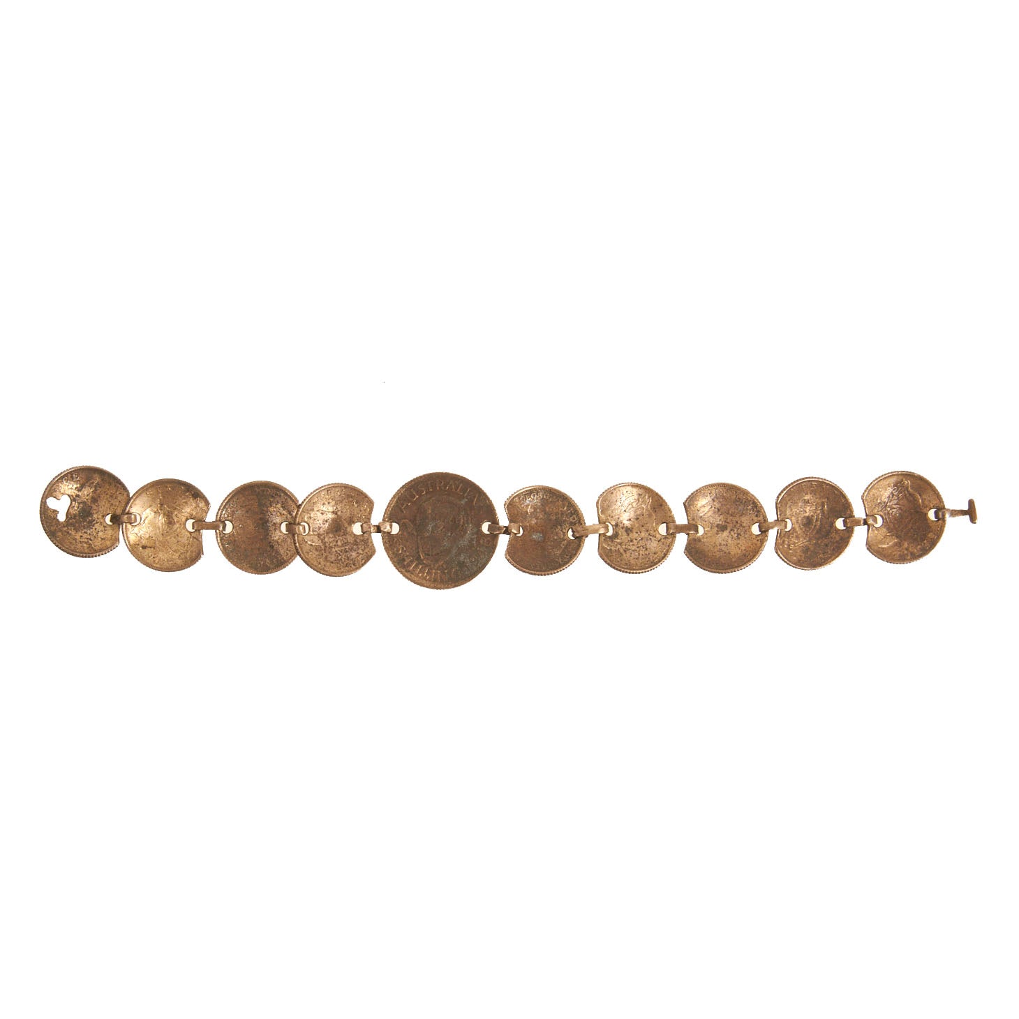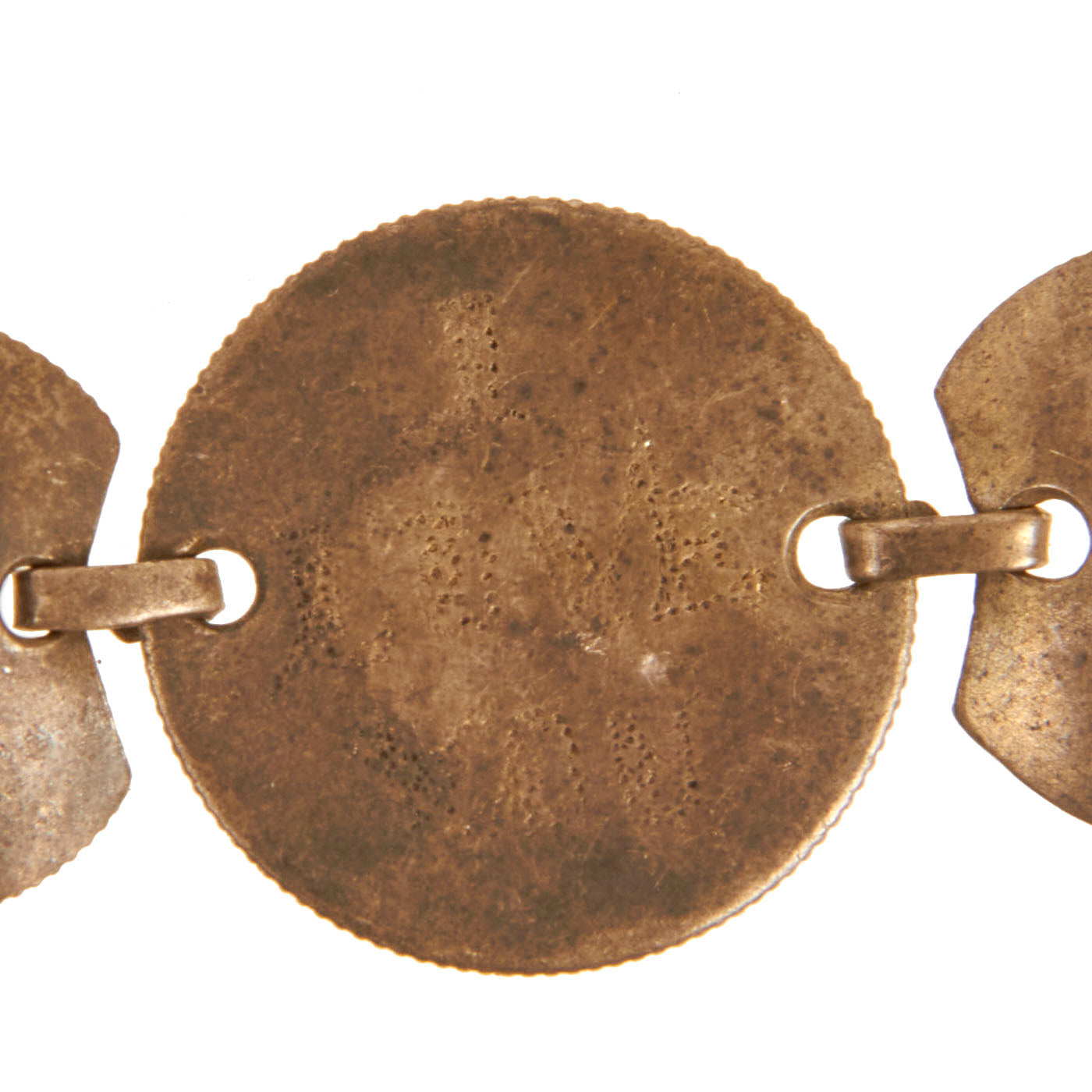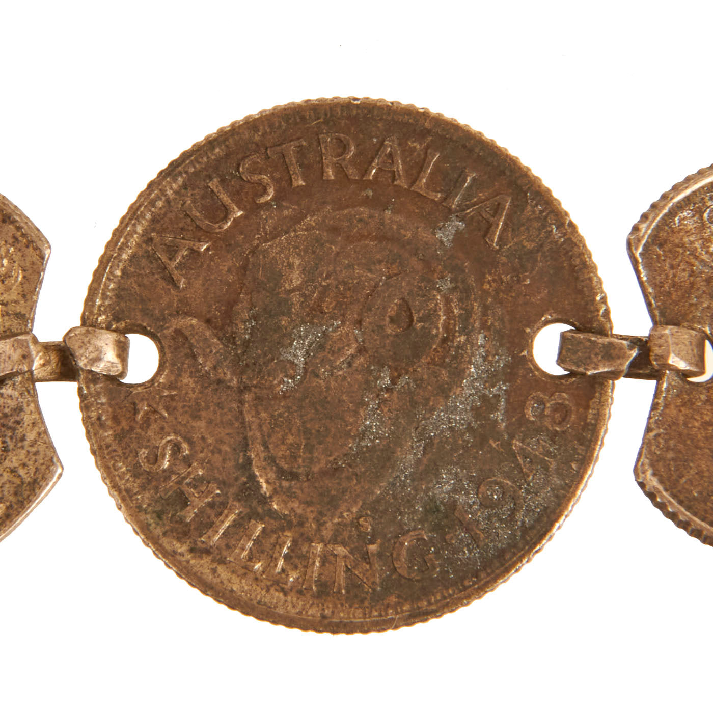 - Australian Coins Bracelet: This is a lovely example of just how creative an individual at war can be. One of the most useless things you can have on you while in a trench or on the frontlines is money. The bracelet consists of Six Pence coins with a much larger Schilling in the center. All coins appear to be dated 1943. On the back of the Schilling “I LOVE YOU” can be found engraved. The bracelet is free of damage, but has tarnished over the years. Measures approximately 7 ¼”.