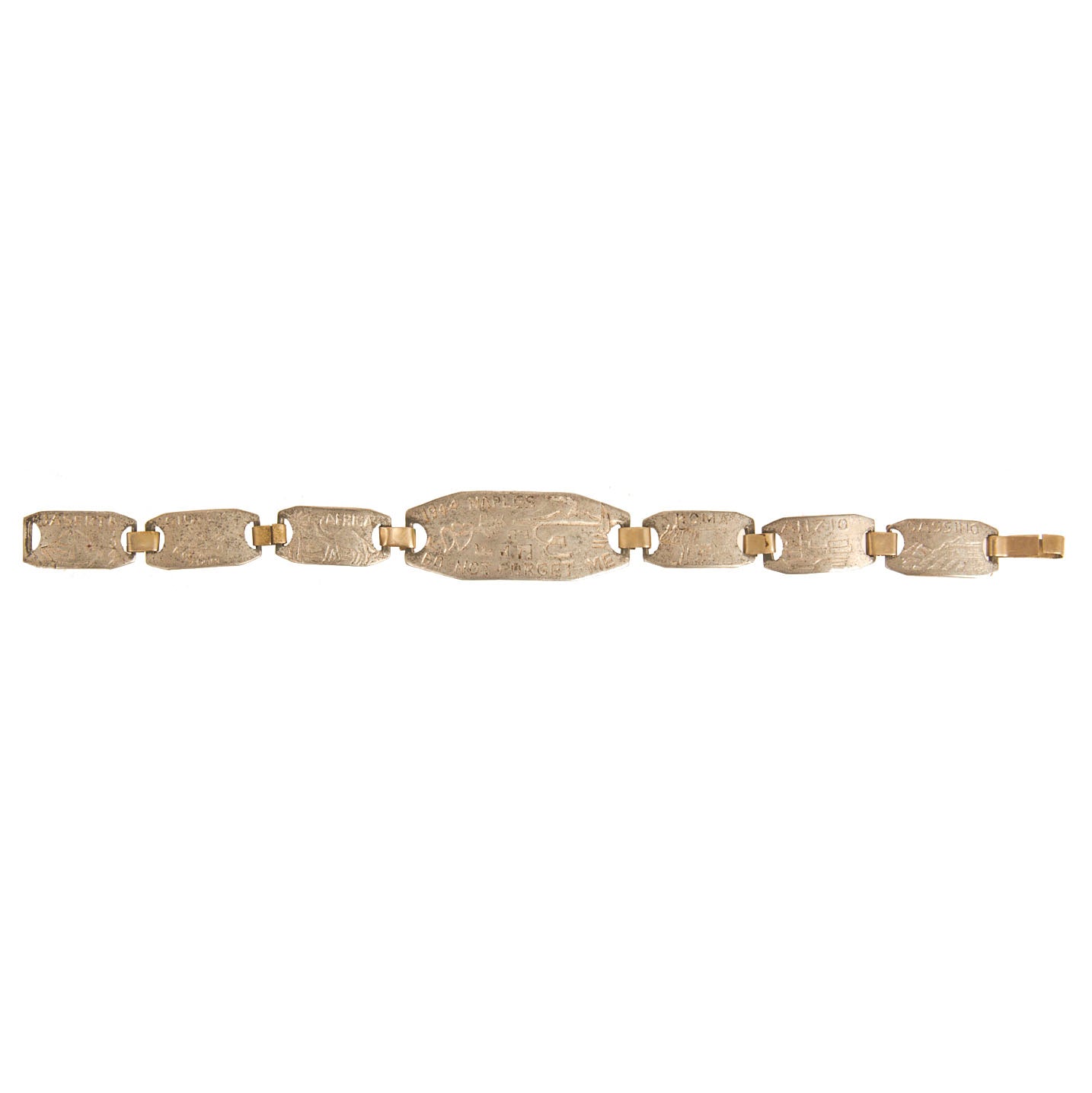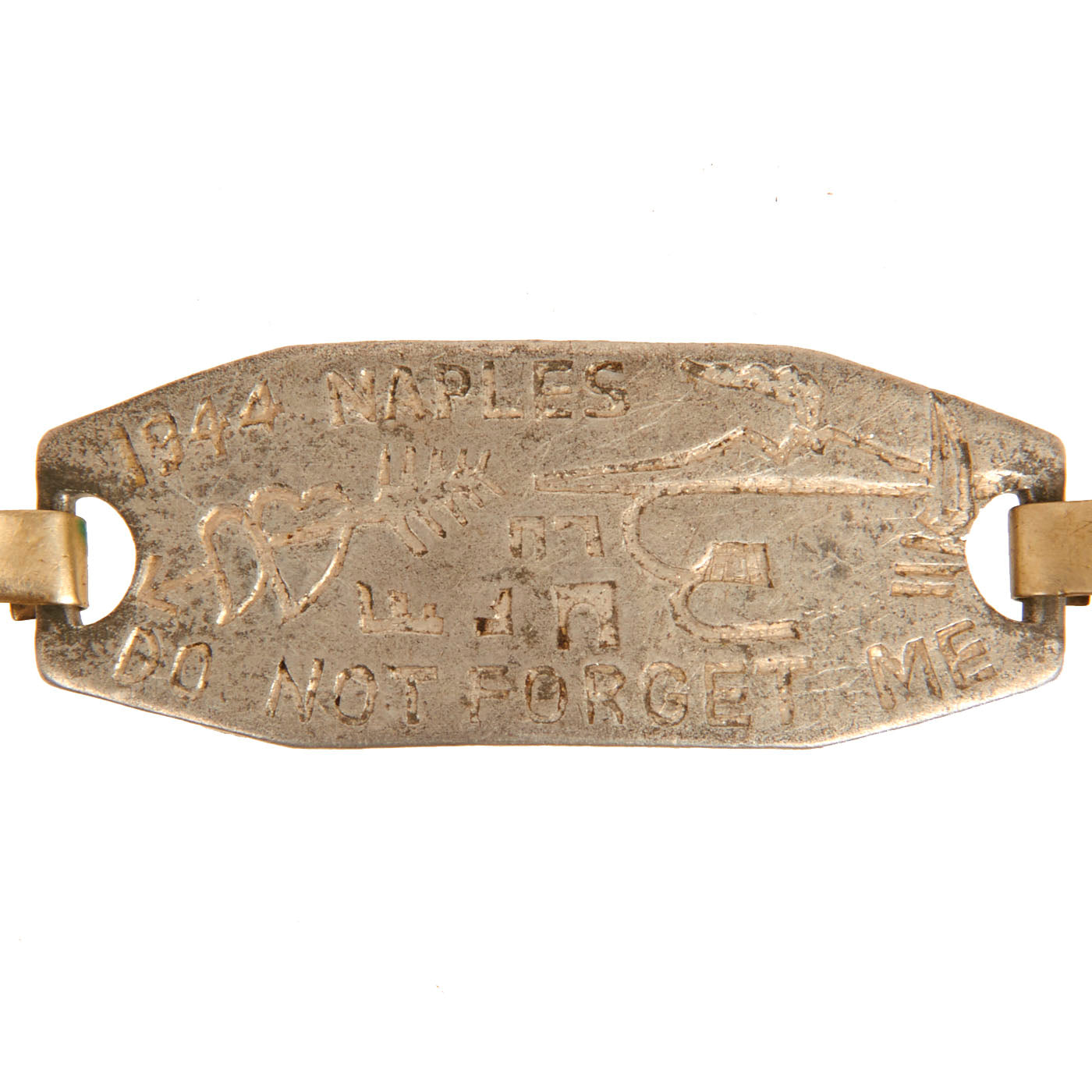 - Aluminum Italian Campaign Bracelet: This is an incredible example. The bracelet is from a soldier’s 1944 campaign throughout the various locations in Italy. There are 7 links in total, with the center one being the largest. The center link says 1944 NAPLES at the top with a lovely scene of hearts, a volcano smoking and what appears to be a sail boat. The words engraved at the bottom are DO NOT FORGET ME, a beautiful yet heartbreaking message. We are almost certain that with a breathtaking piece like this he was never forgotten! The links are as follows (L to R): BASERTA - SICILY - AFRICA - ROMA - ANZIO - CASSINO. This was truly a battle hardened individual! The bracelet measures approximately 9”.
