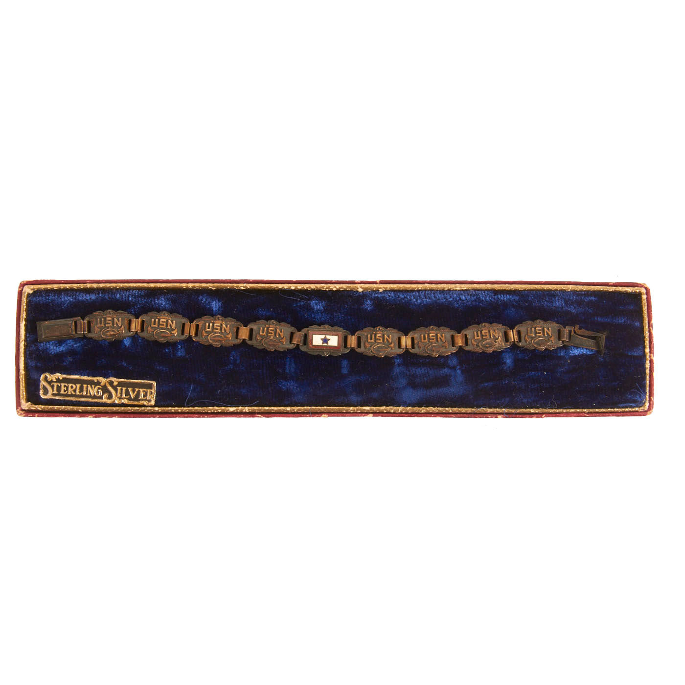 - Sterling Silver USN Bracelet: This bracelet measures approximately 7 ½” and comes in what appears to be the original box! The bracelet consists of 8 “USN” links with a charm in the middle featuring a blue star service flag. It's an American tradition to display a Blue Star Service Banner in the window of a home or in this case on jewelry, when a loved one is proudly serving in the U.S. Armed Forces. As Americans support troops deployed overseas, the Blue Star Service Banner is a reminder that war touches every neighborhood. The bracelet is free of damage, but has tarnished over the years.