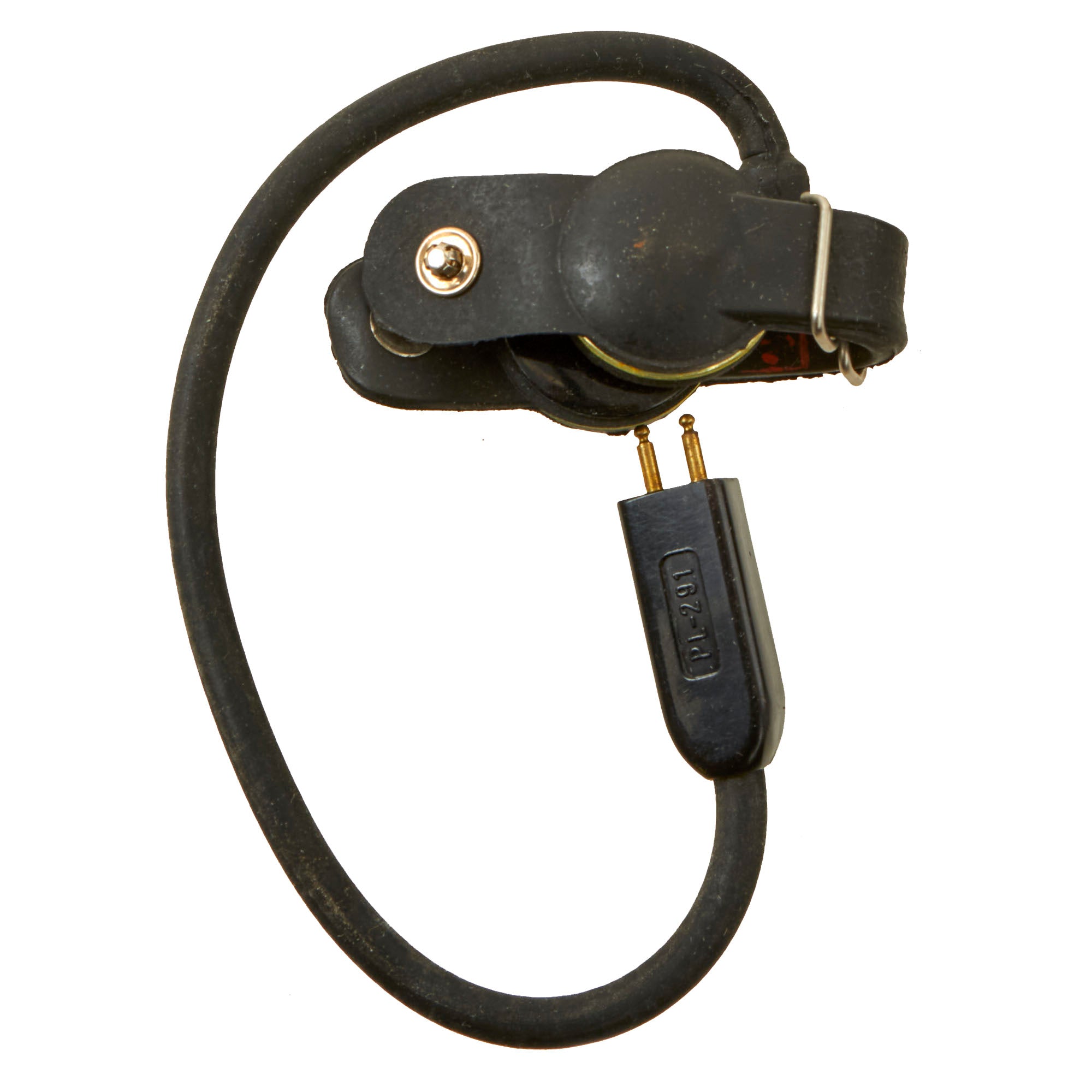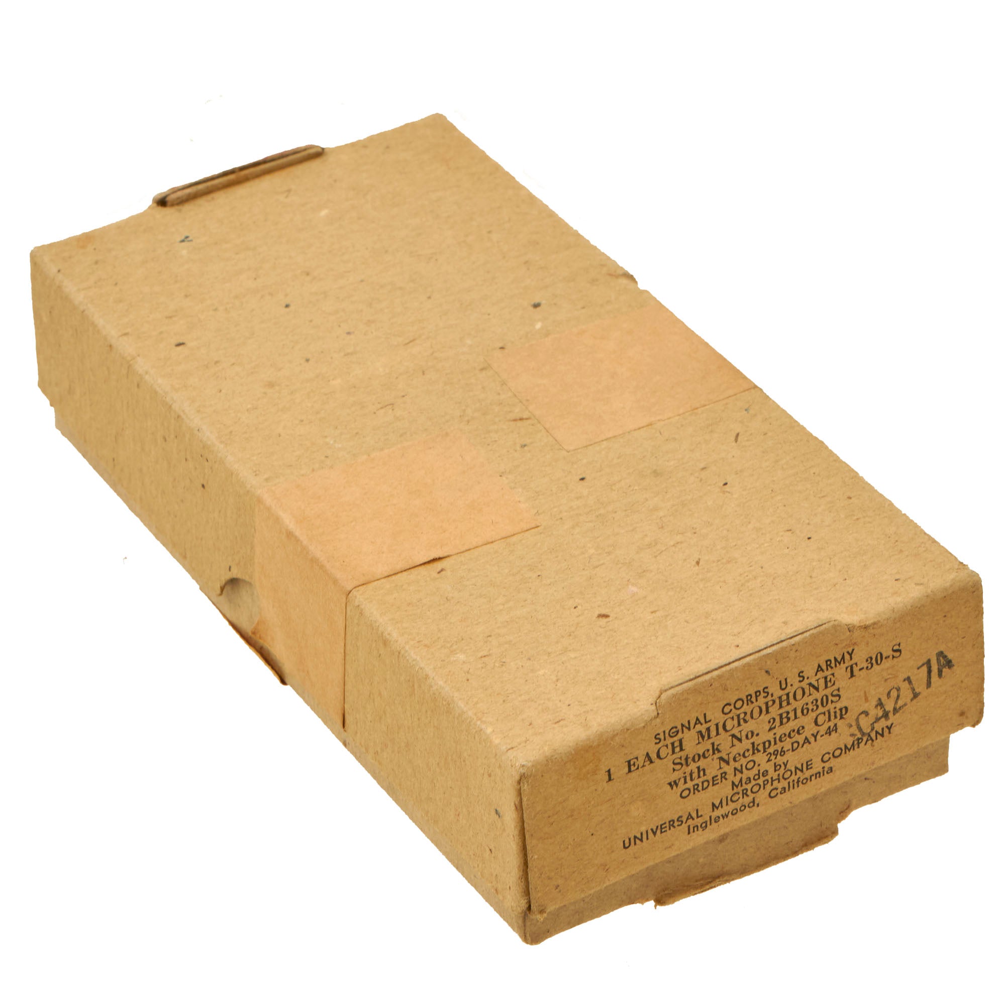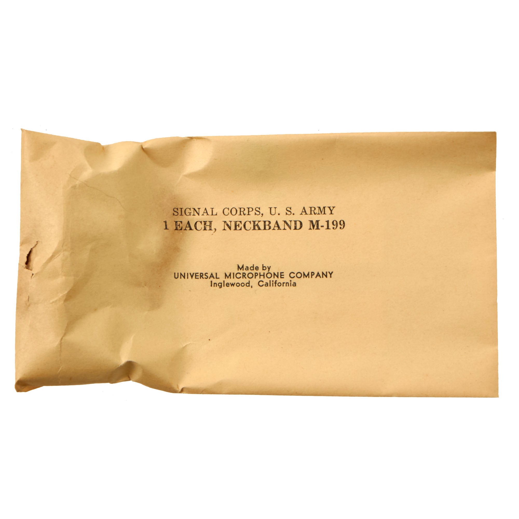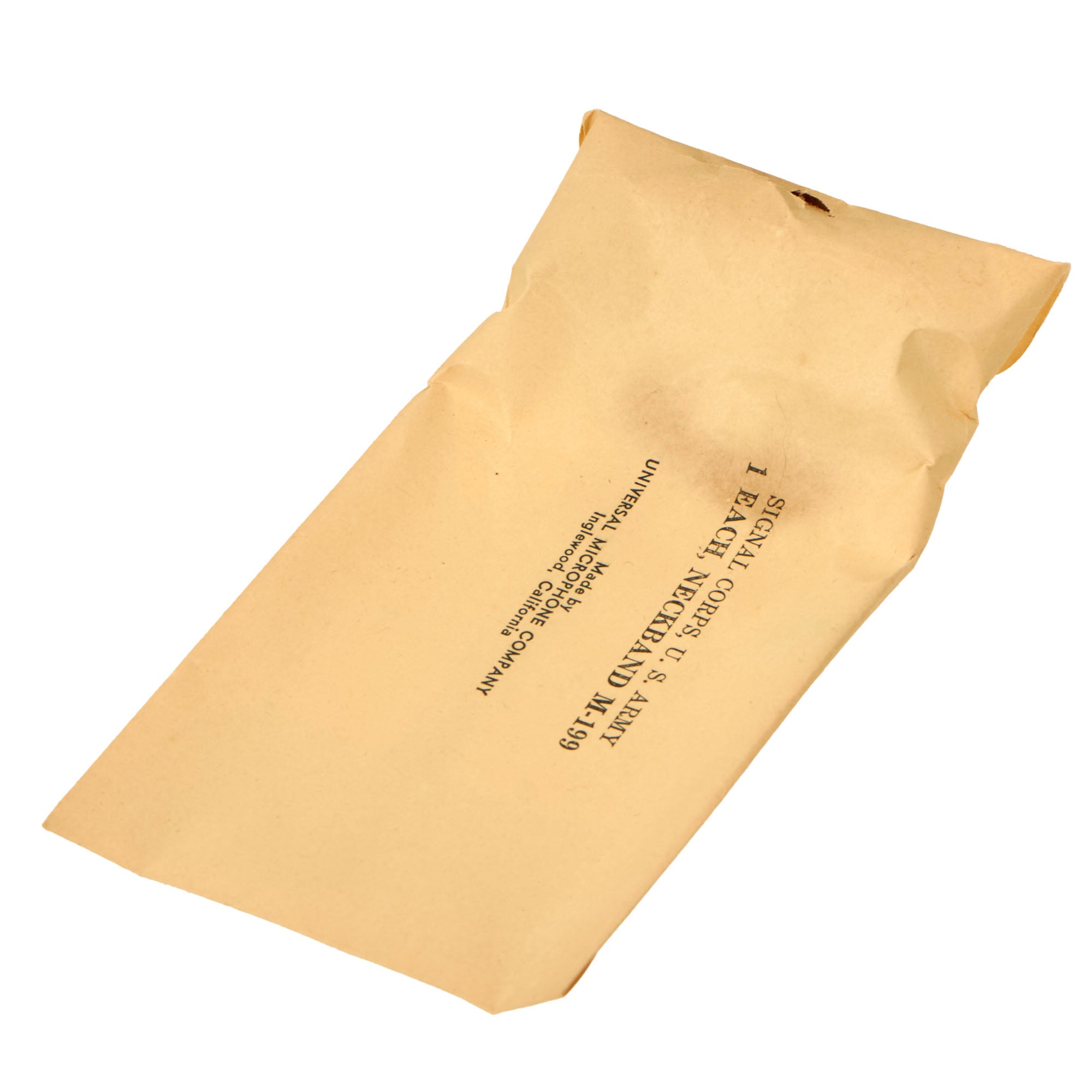 Original Item: Only One Available. This is a very nice example of the classic WWII U.S. T-30 Throat Mic, as used by American armored crews during WWII. This example comes complete in its original box with an instruction sheet and a still-sealed neckband M-199.This T-30-S throat microphone was manufactured by Universal Microphone Company in Inglewood, California. The plug of the mic is marked PL-291. It’s wrapped in the original paper. The neckband sleeve is marked Signal Corps, US Army and indicates it as a Model M-199. The side of the box indicates it as being 1944 manufacture.A fantastic set in its original box measuring 6 x 3 x 1”. Comes ready for further research and display.