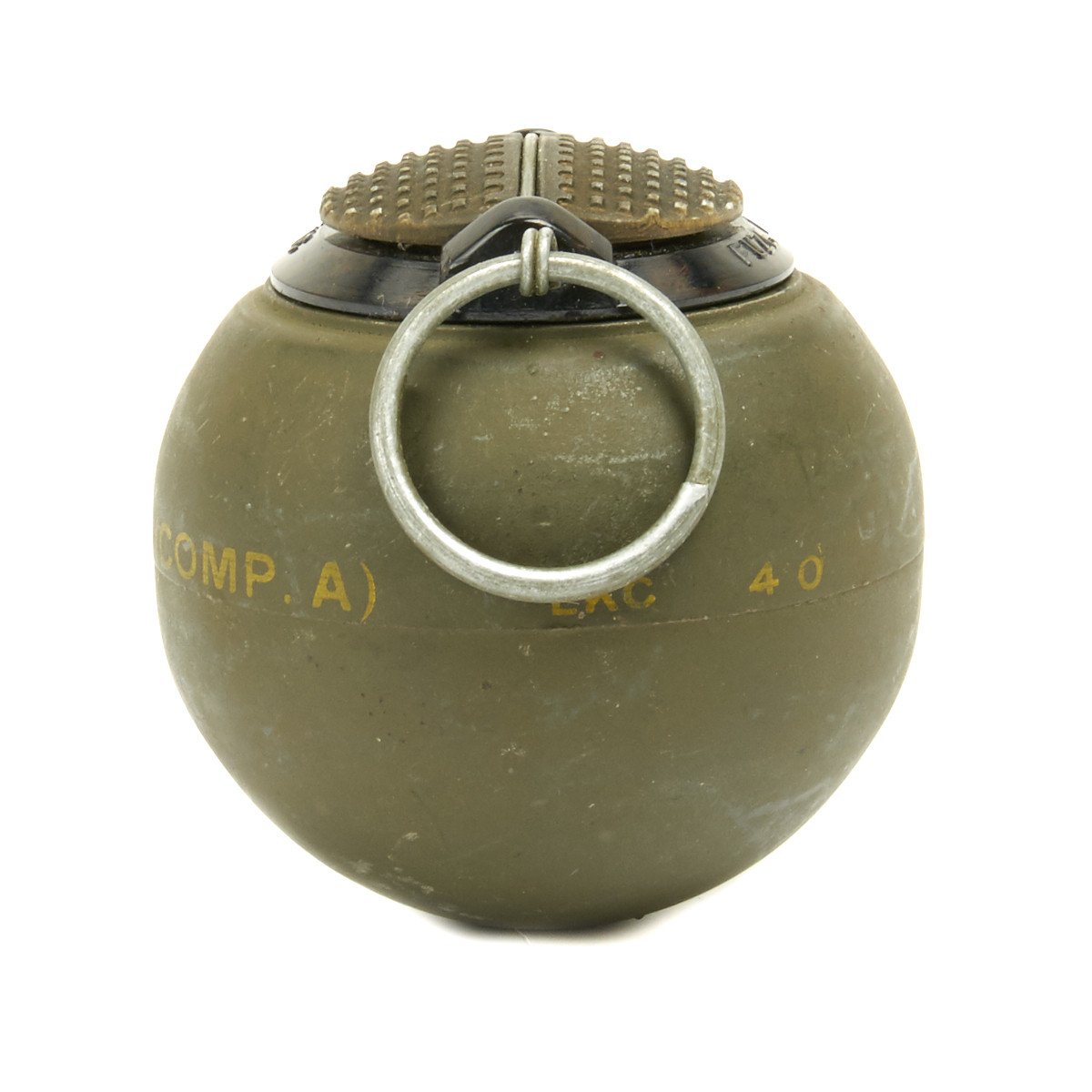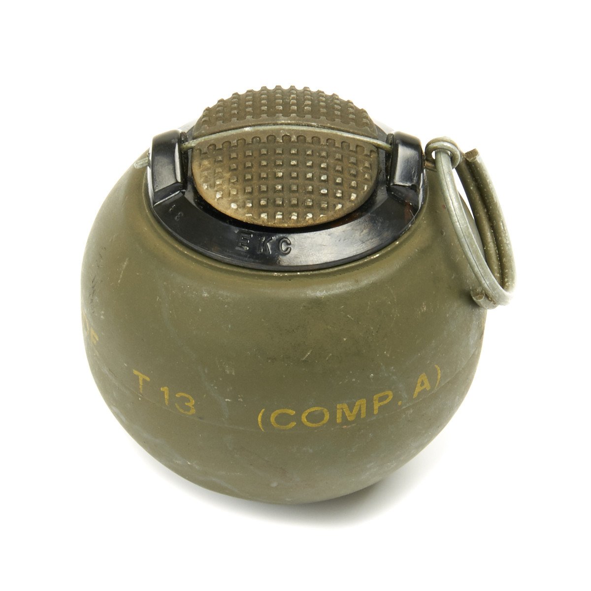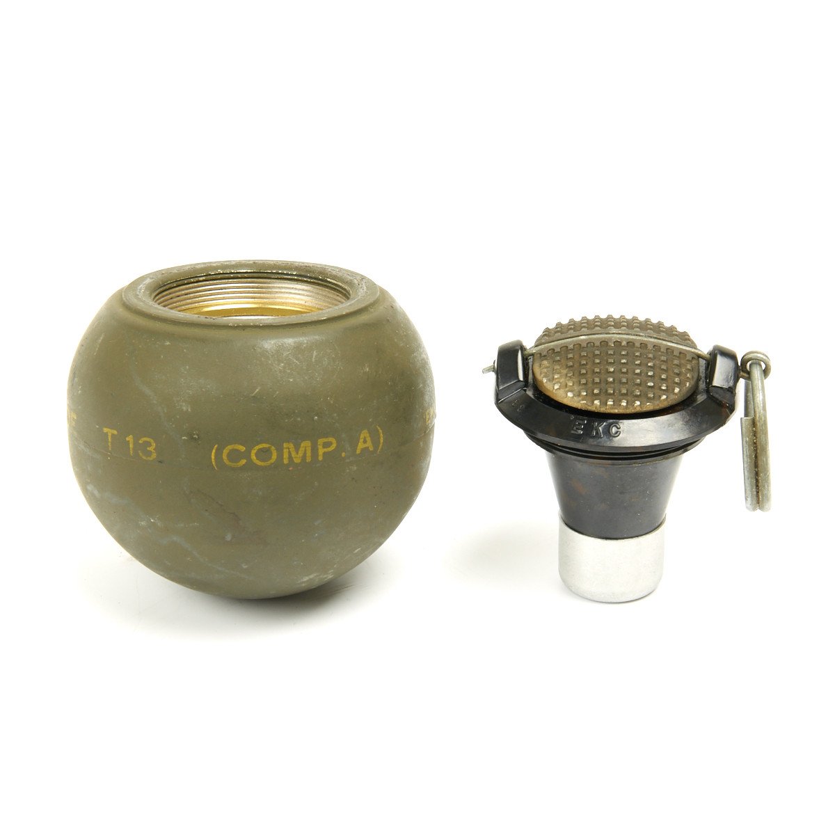 Original Item: Only One Available. Totally inert and non-functional, this is an original WW2 BEANO T-13 hand grenade was an experimental hand grenade developed by the Office of Strategic Services (which later became the CIA) in the latter years of WW2. The grenade is marked EKC 40 indicating the manufacturer, the Eastman Kodak Company. COMP A indicates composition A explosive was used. This example is offered in excellent condition.