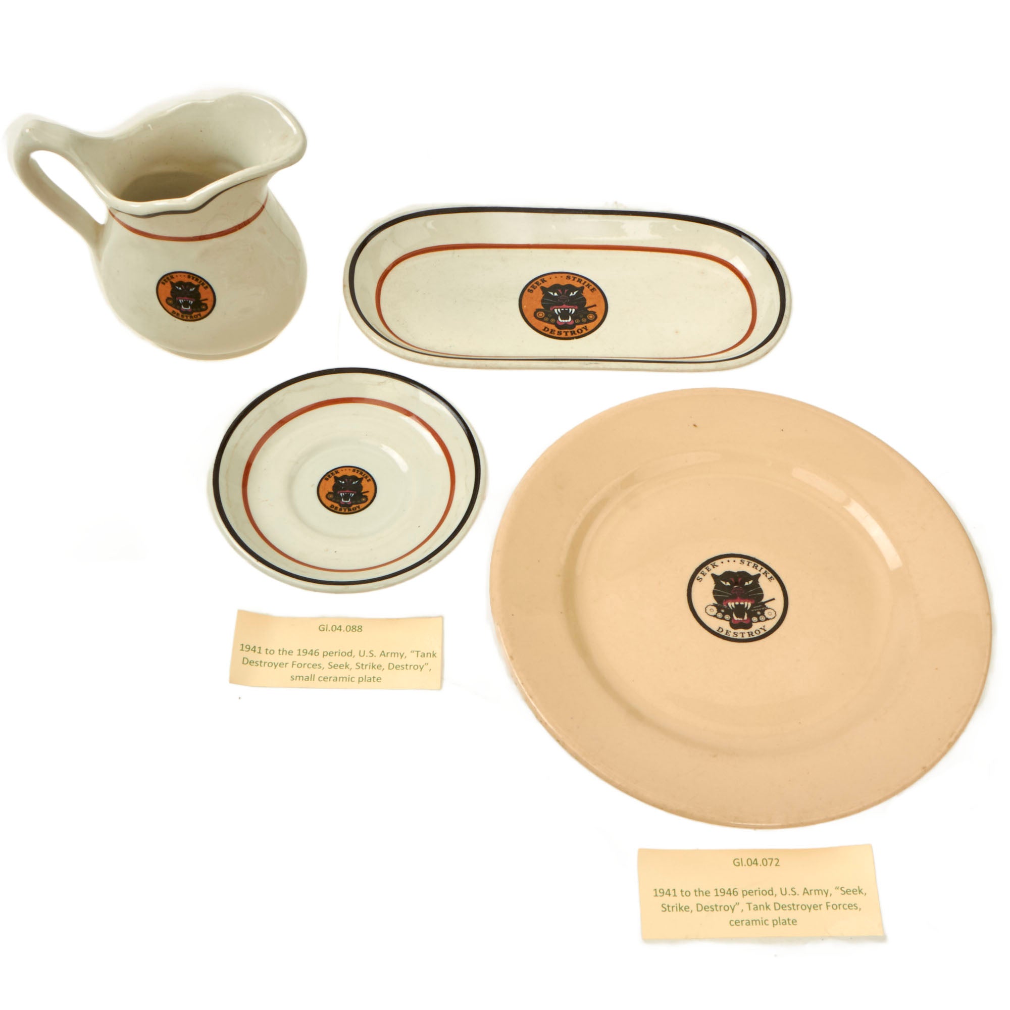 Original Items: Only One Set Available. This is a fantastic set of china that was more than likely utilized in an Officer’s Club of sorts. Each item in the set is in wonderful condition and bears the Tank Destroyer insignia on the front of face. There is no damage to speak of that we could find and they present themselves quite nicely! While we are uncertain as to which manner and where these were used, they are still a fantastic array of items that would display very well together!