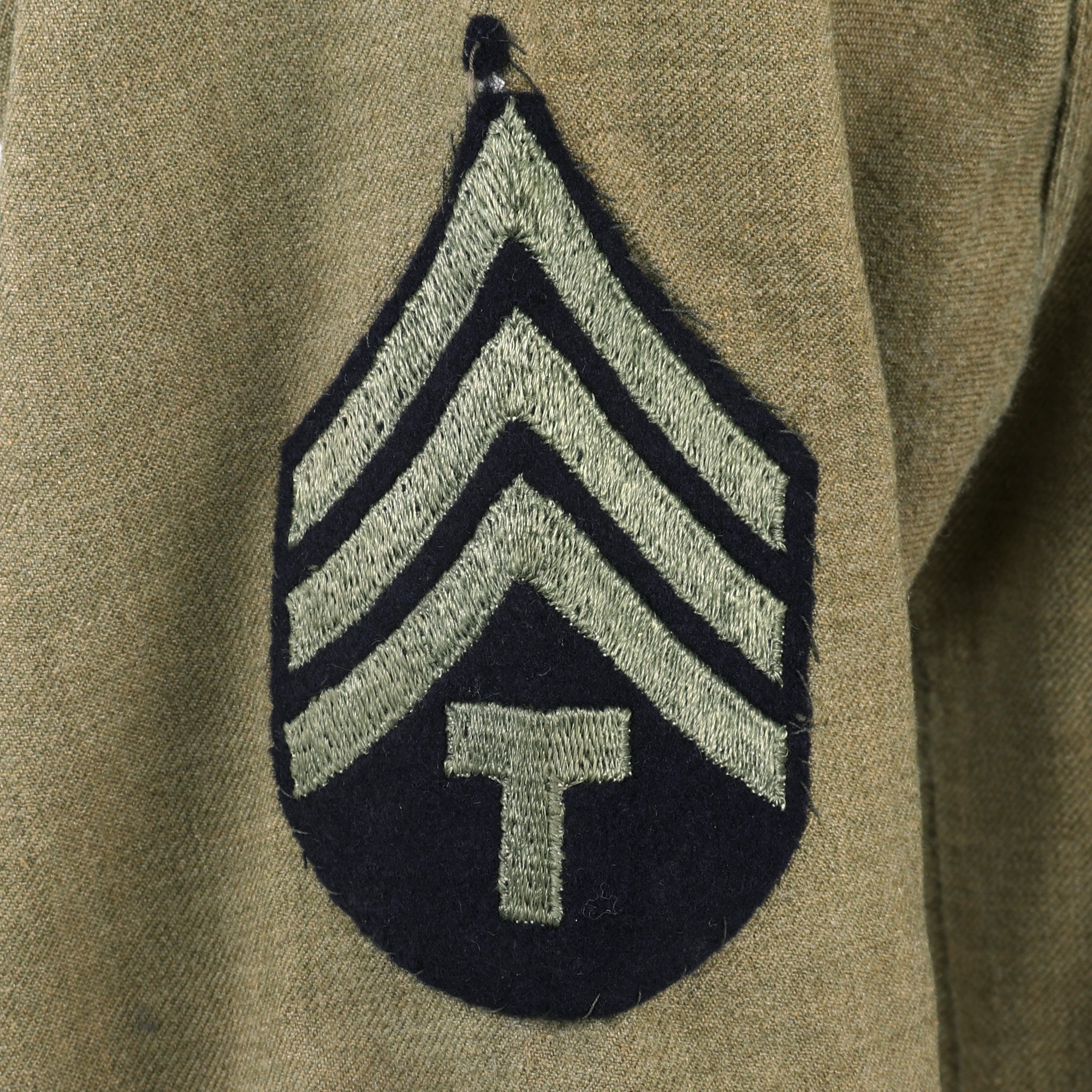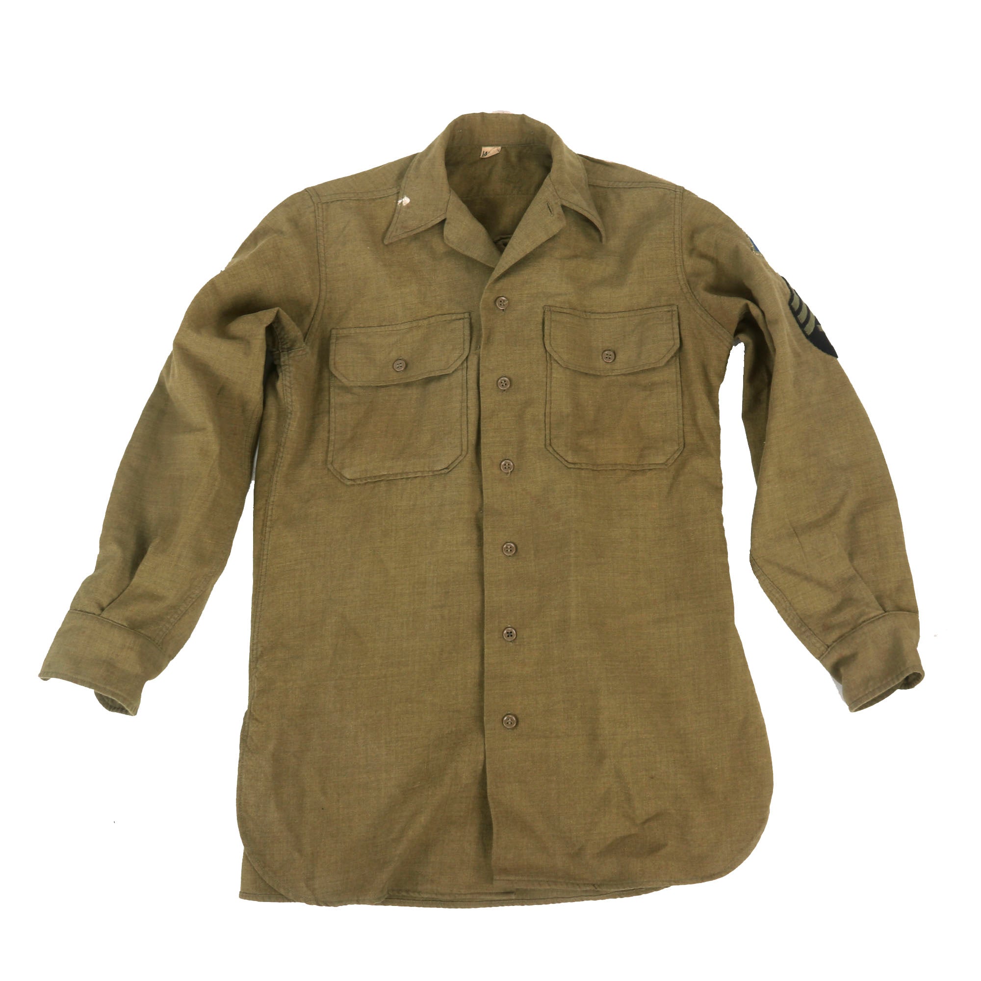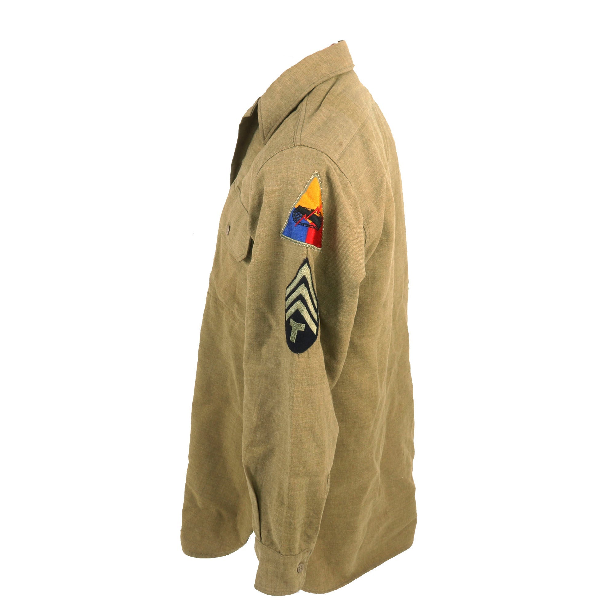 The shirt is in great shape with a patch on the left shoulder for an Armored Division, and Technical Sergeant chevrons on both sleeves. There is a Size tag, 14½-33. There is a name under the collar but it is too worn to read.