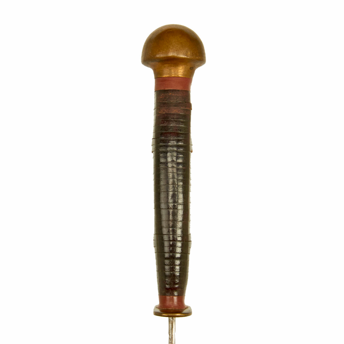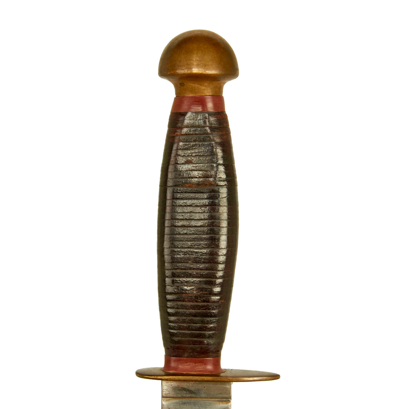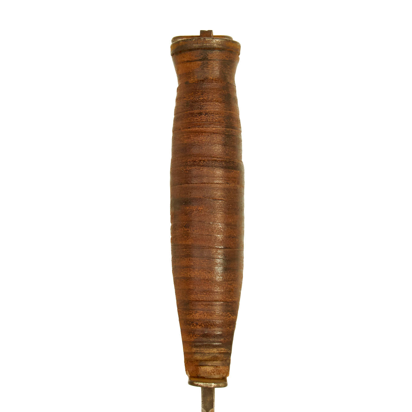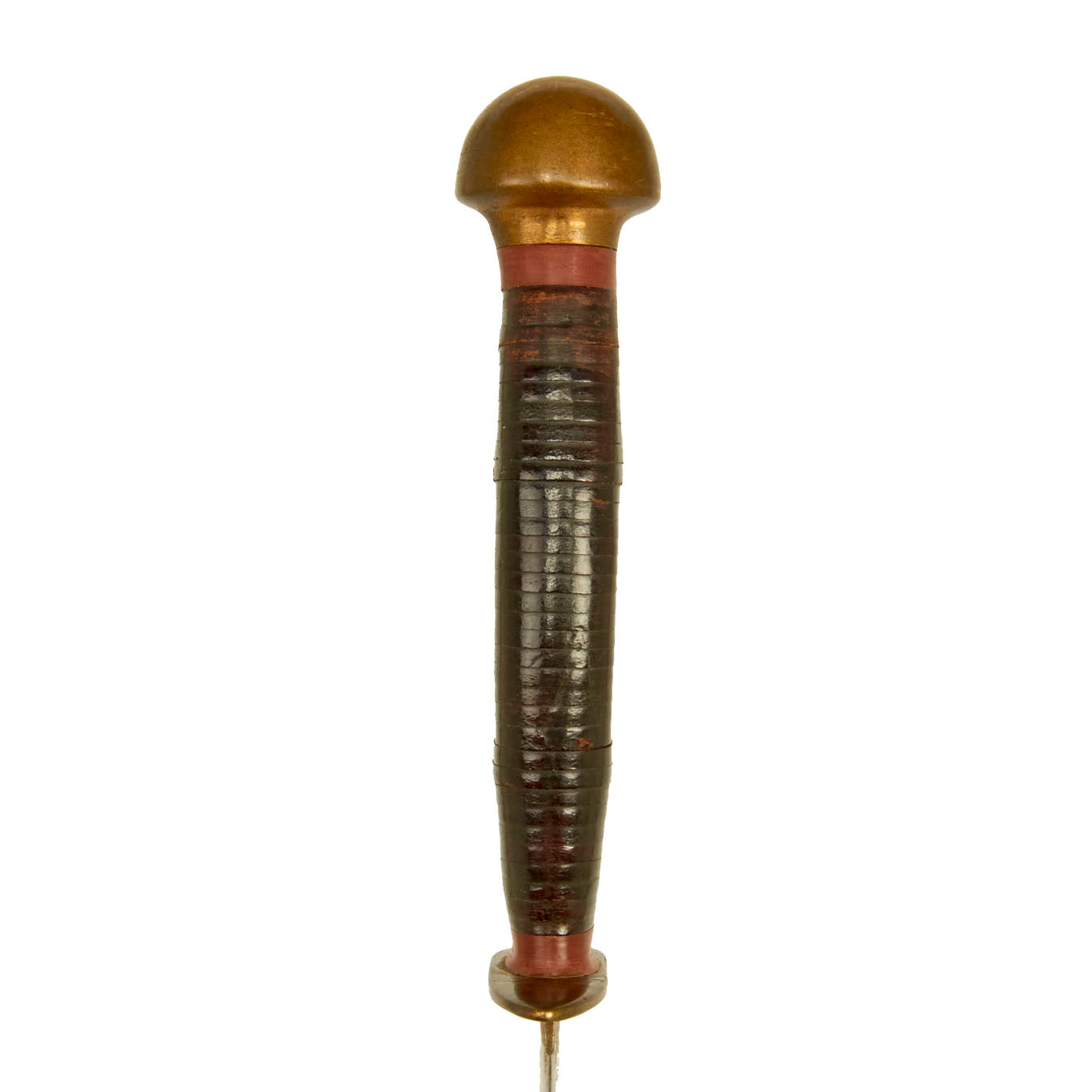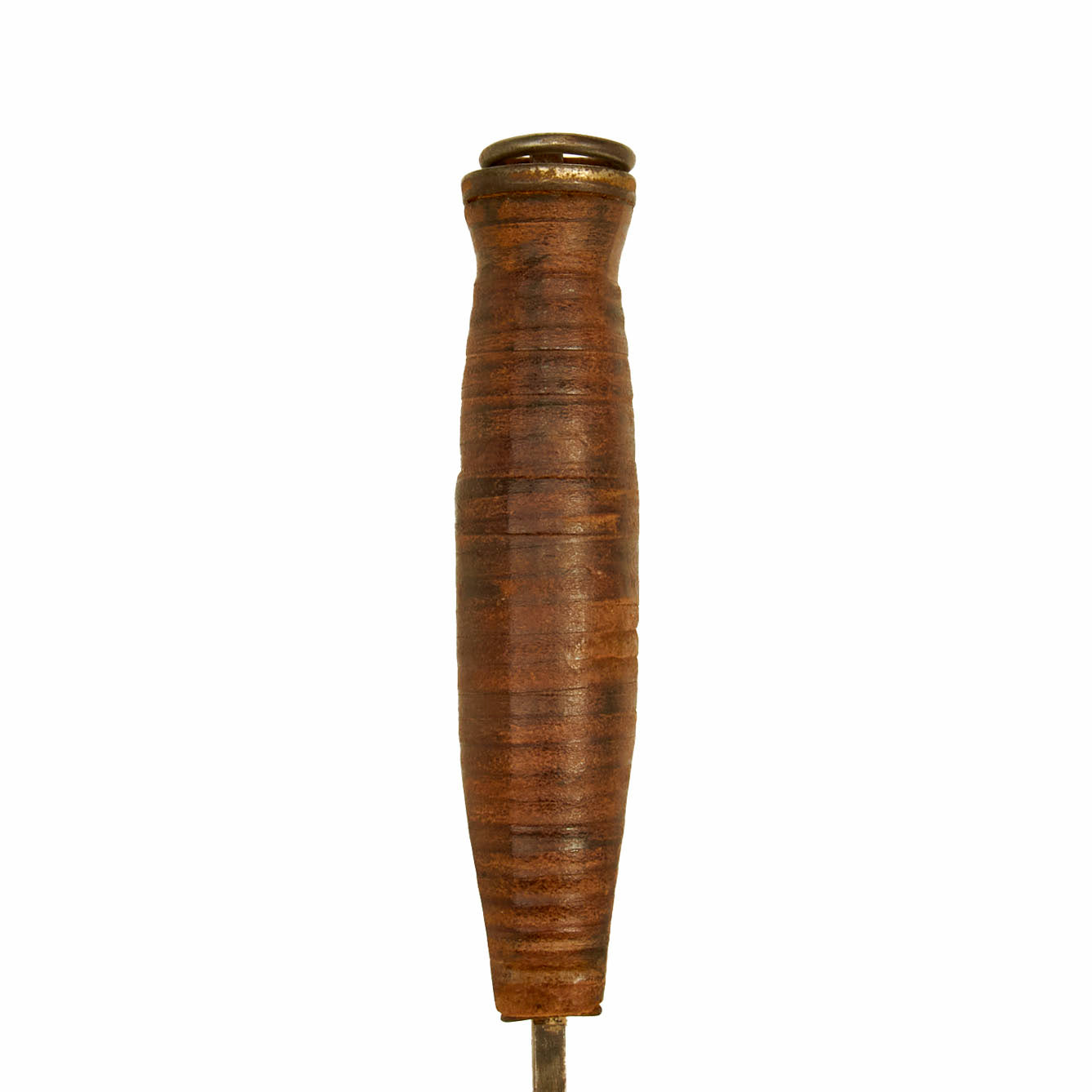 -M3 Fighting Knife: This example used the pre existing blade of the famed M3 Fighting Knife, which was a common knife to use. The user manufactured a new and wider stacked leather grip with a pommel that has a ring on the bottom. 11 ½” Total Length