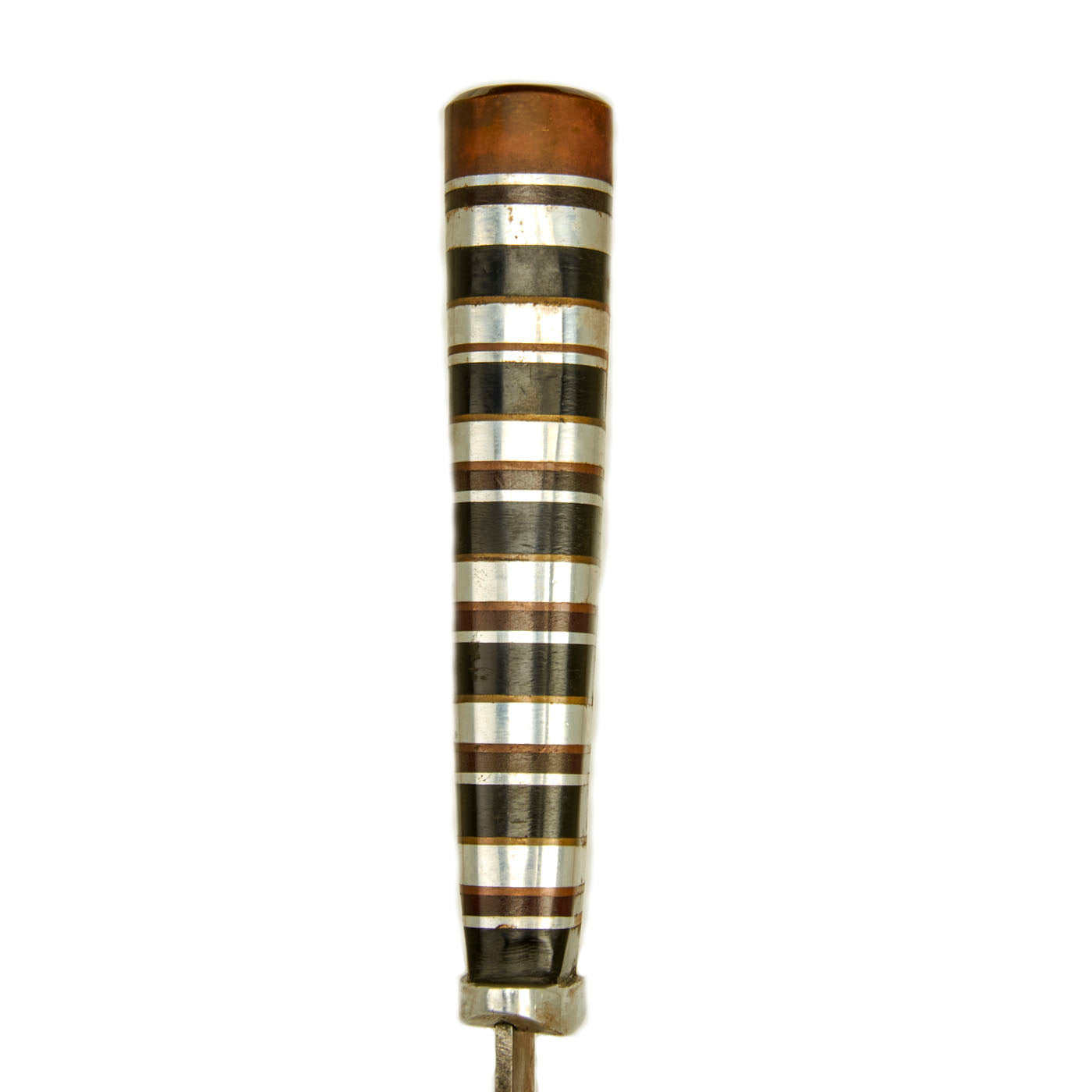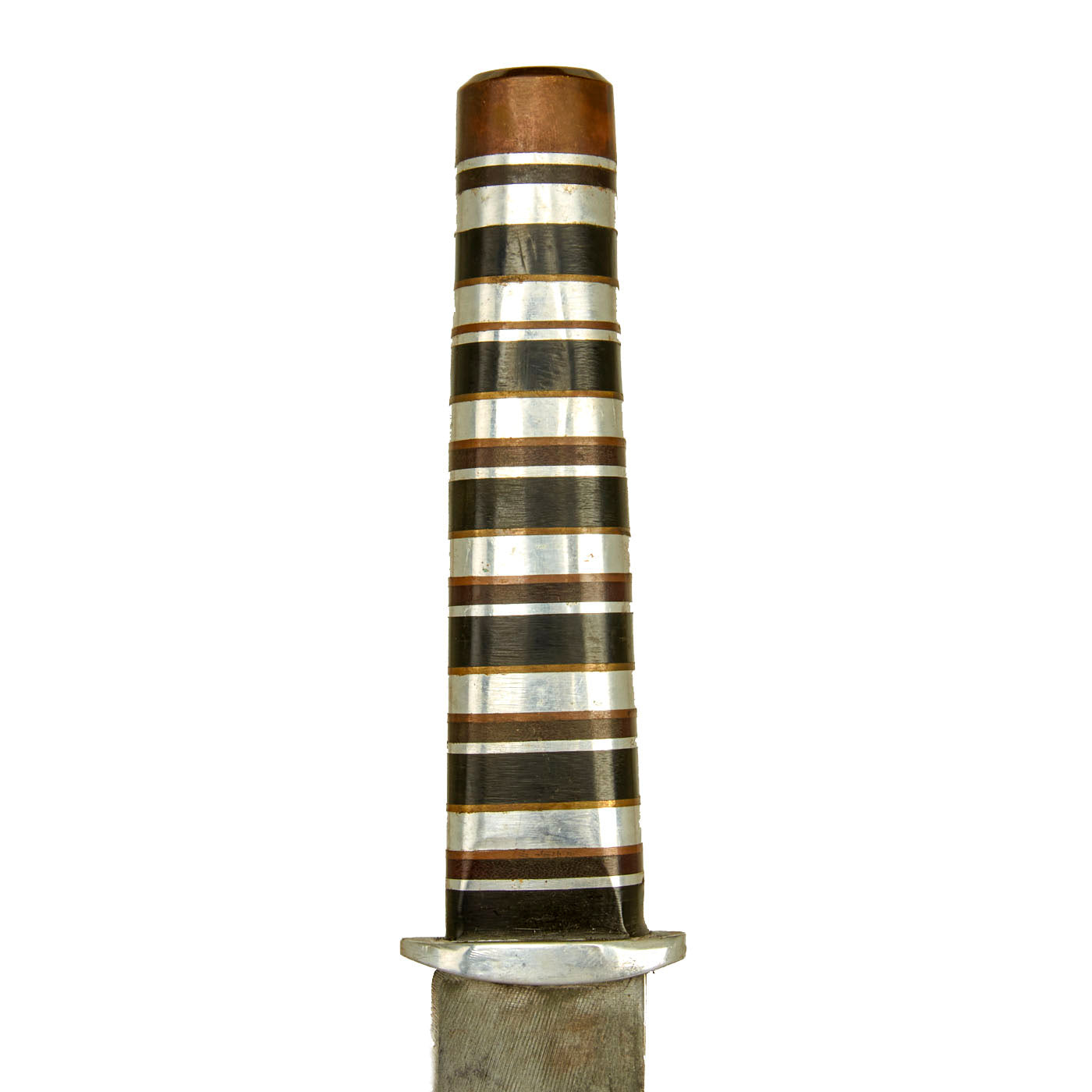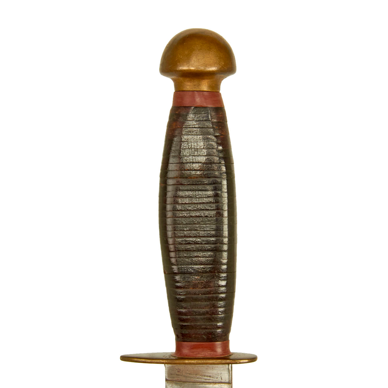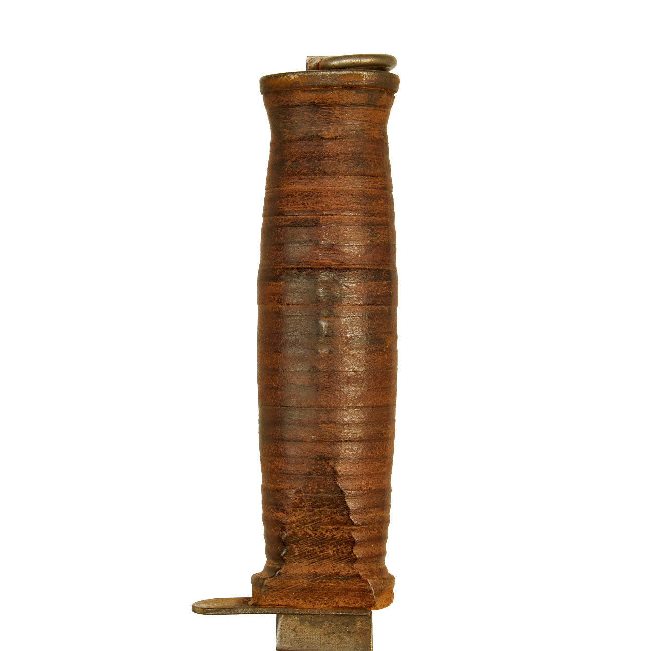 -M3 Fighting Knife: This example used the pre existing blade of the famed M3 Fighting Knife, which was a common knife to use. The user manufactured a new and wider stacked leather grip with a pommel that has a ring on the bottom. 11 ½” Total Length