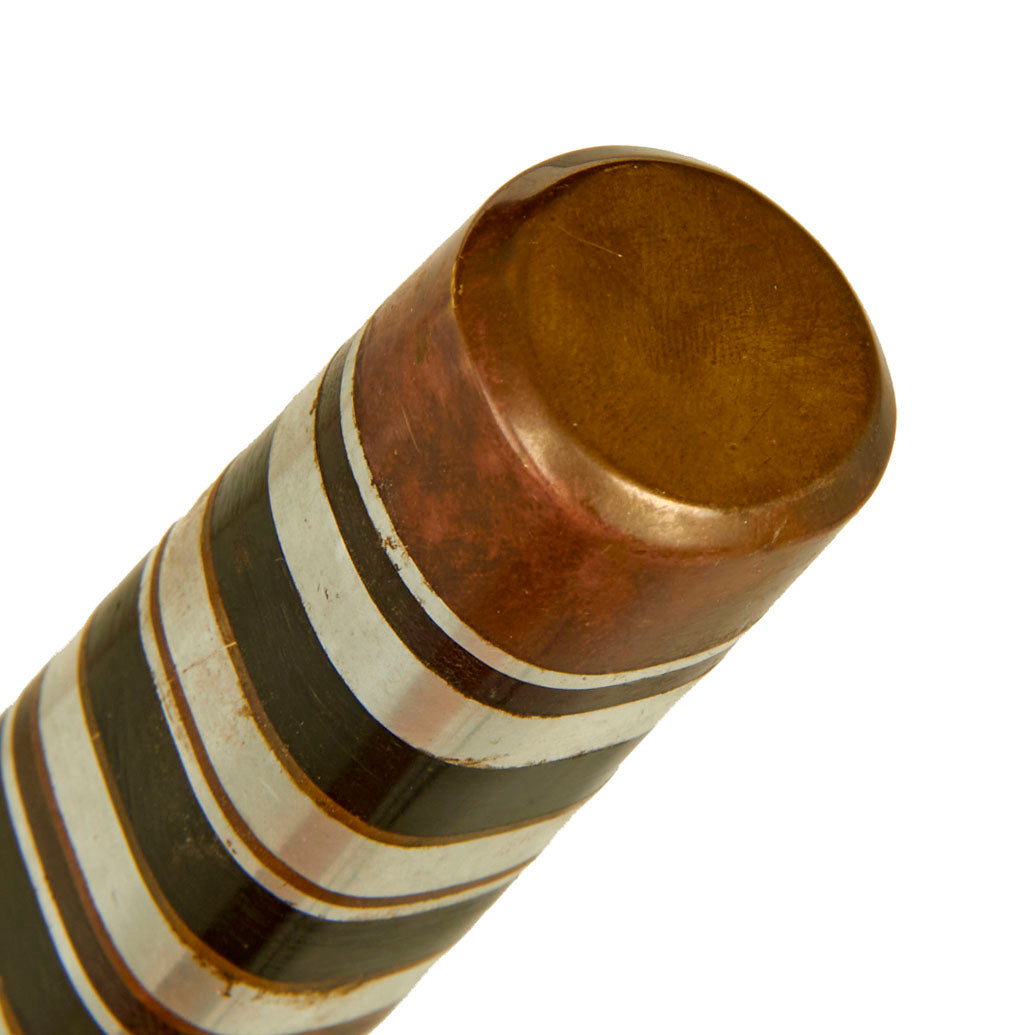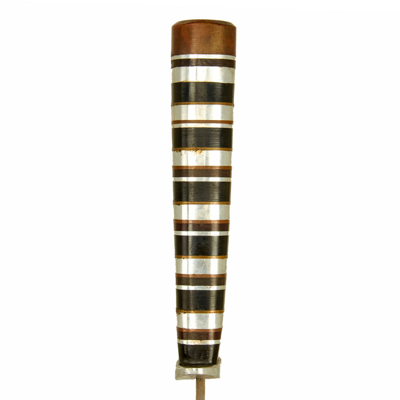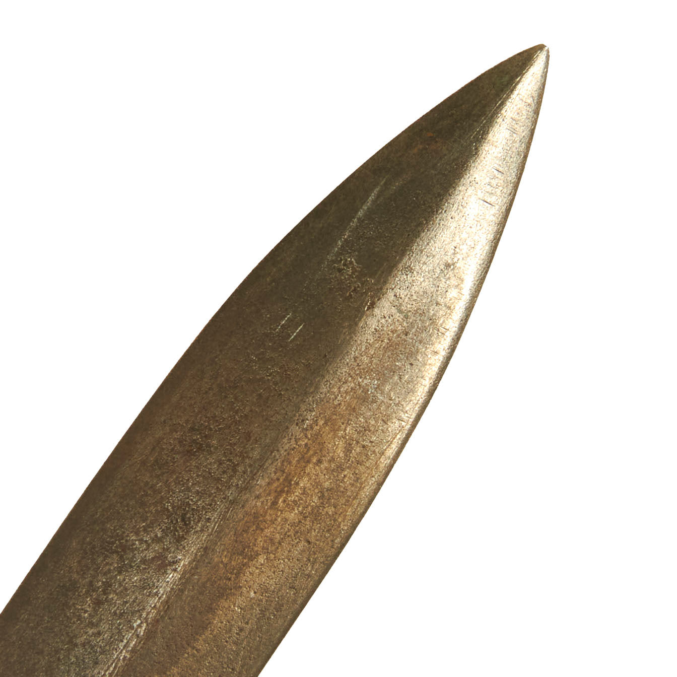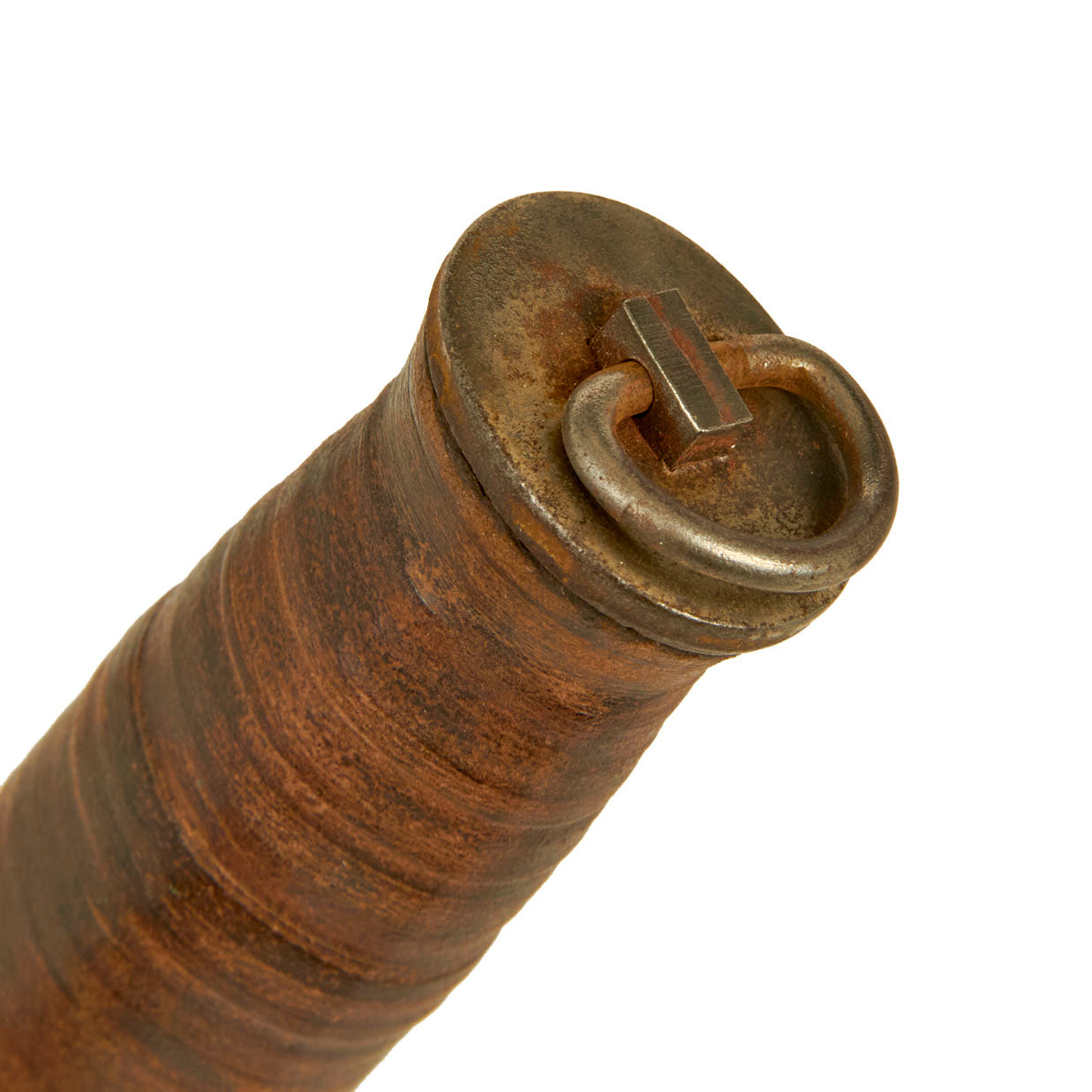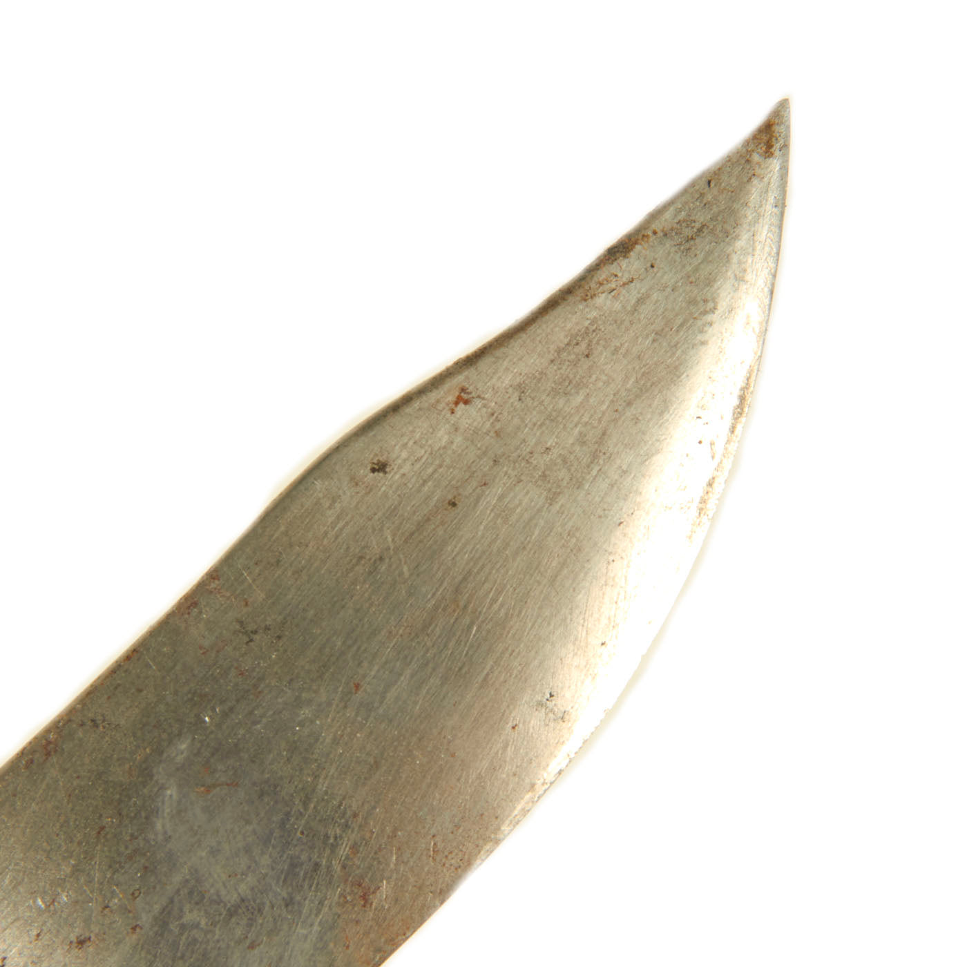-M3 Fighting Knife: This example used the pre existing blade of the famed M3 Fighting Knife, which was a common knife to use. The user manufactured a new and wider stacked leather grip with a pommel that has a ring on the bottom. 11 ½” Total Length