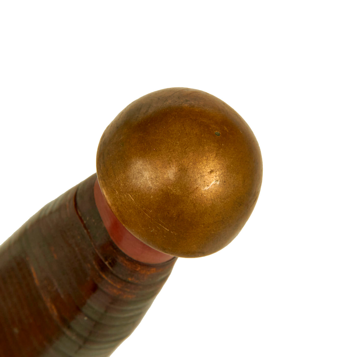 -“Ka-Bar” Style Knife: This has the same appearance as a USMC Ka-Bar. The clip point steel blade resembles the famed fighting knife with a stacked leather grip with thick red washers at the top and bottom. The cross guard is machined brass as well as the large round bottom pommel. 13” Total Length