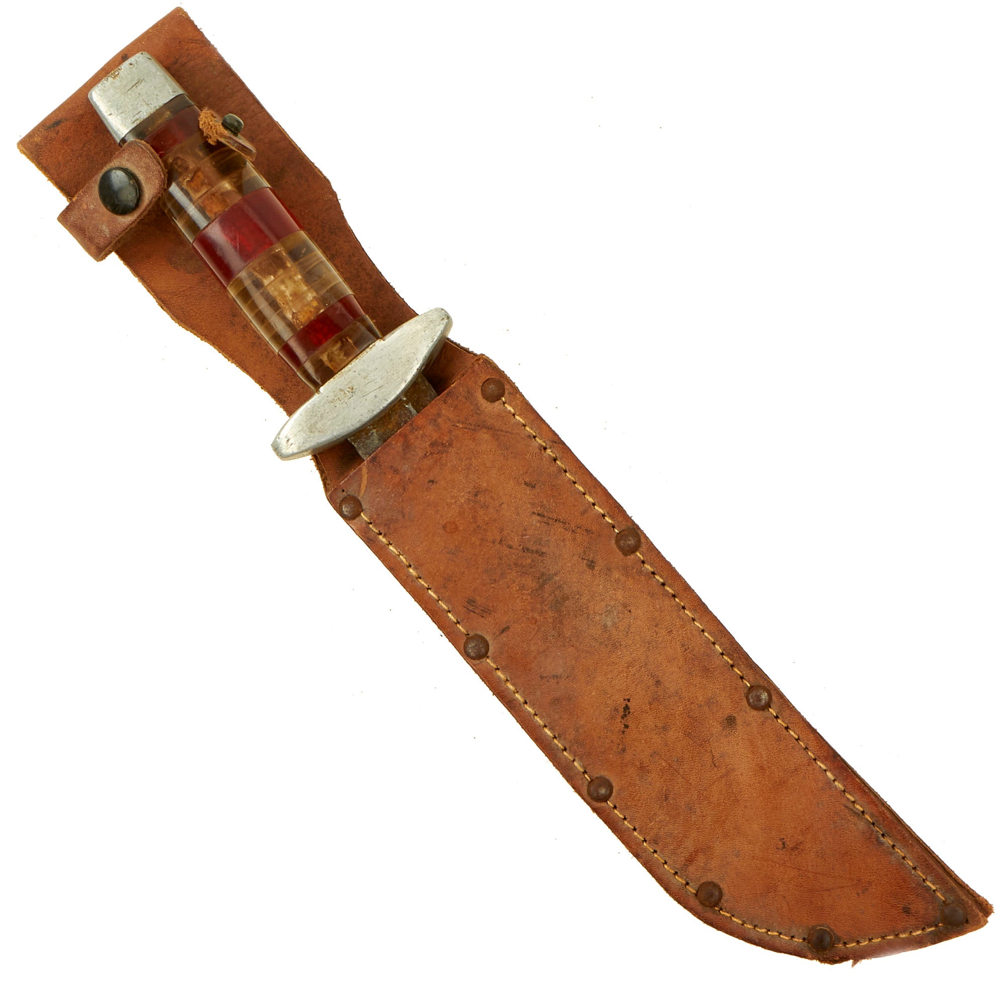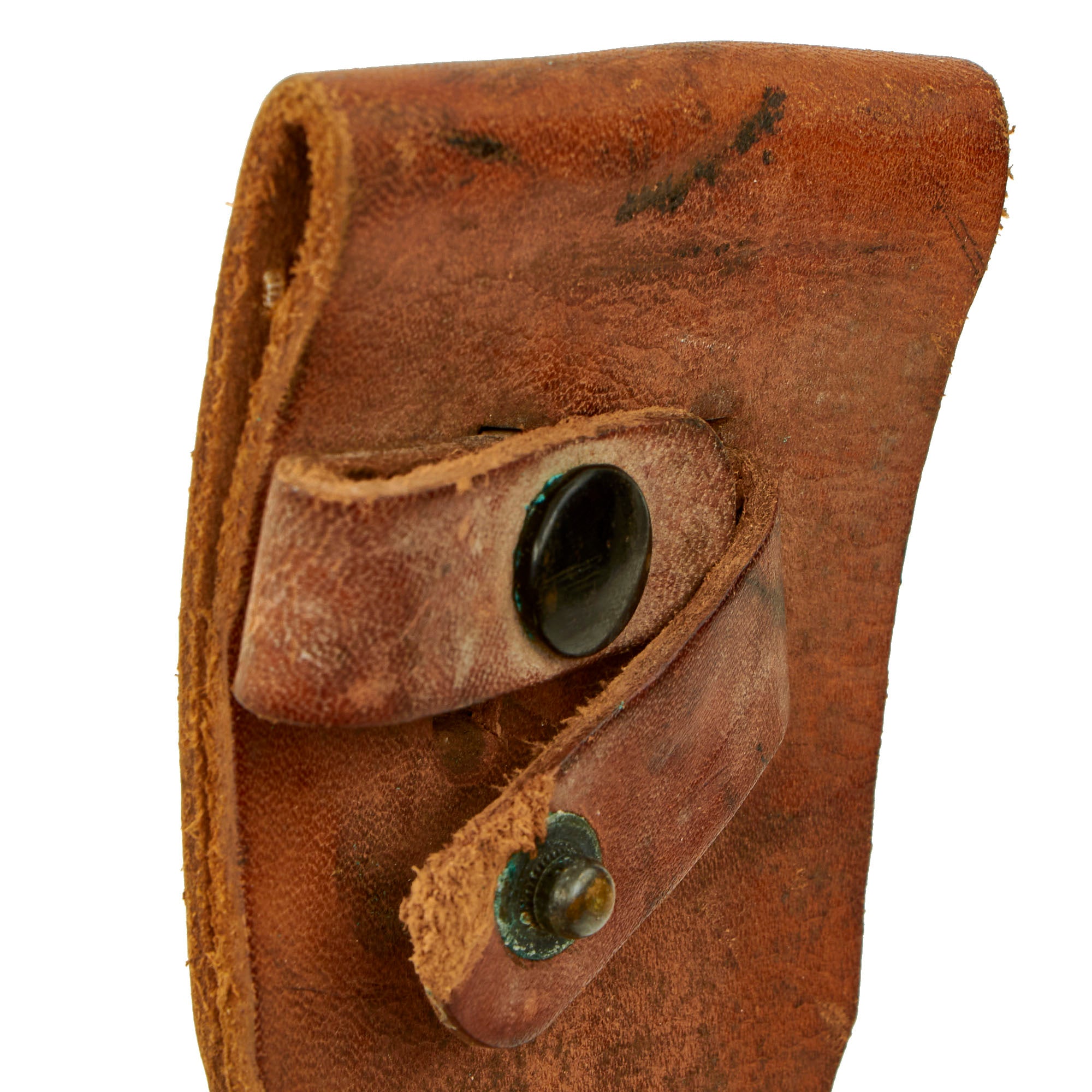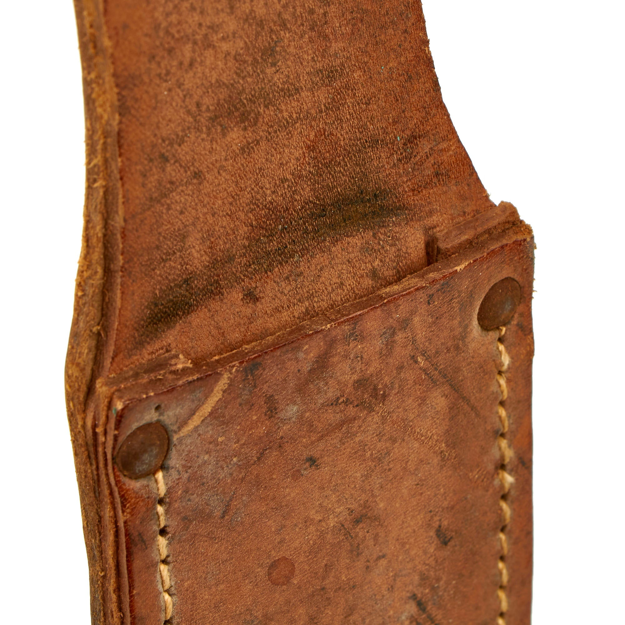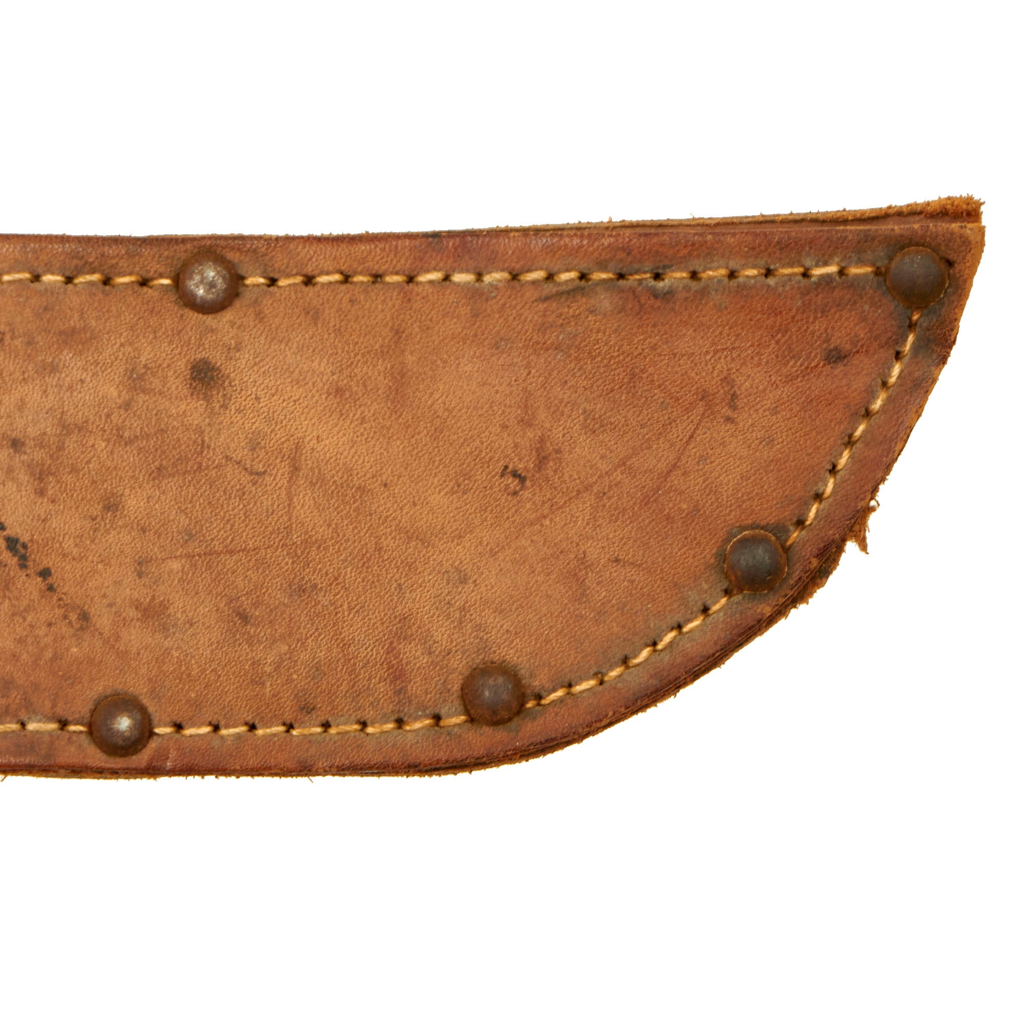 The original leather scabbard appears to be from a WWII USMC Ka-Bar fighting knife due to its appearance. It is in lovely condition and still rather serviceable.