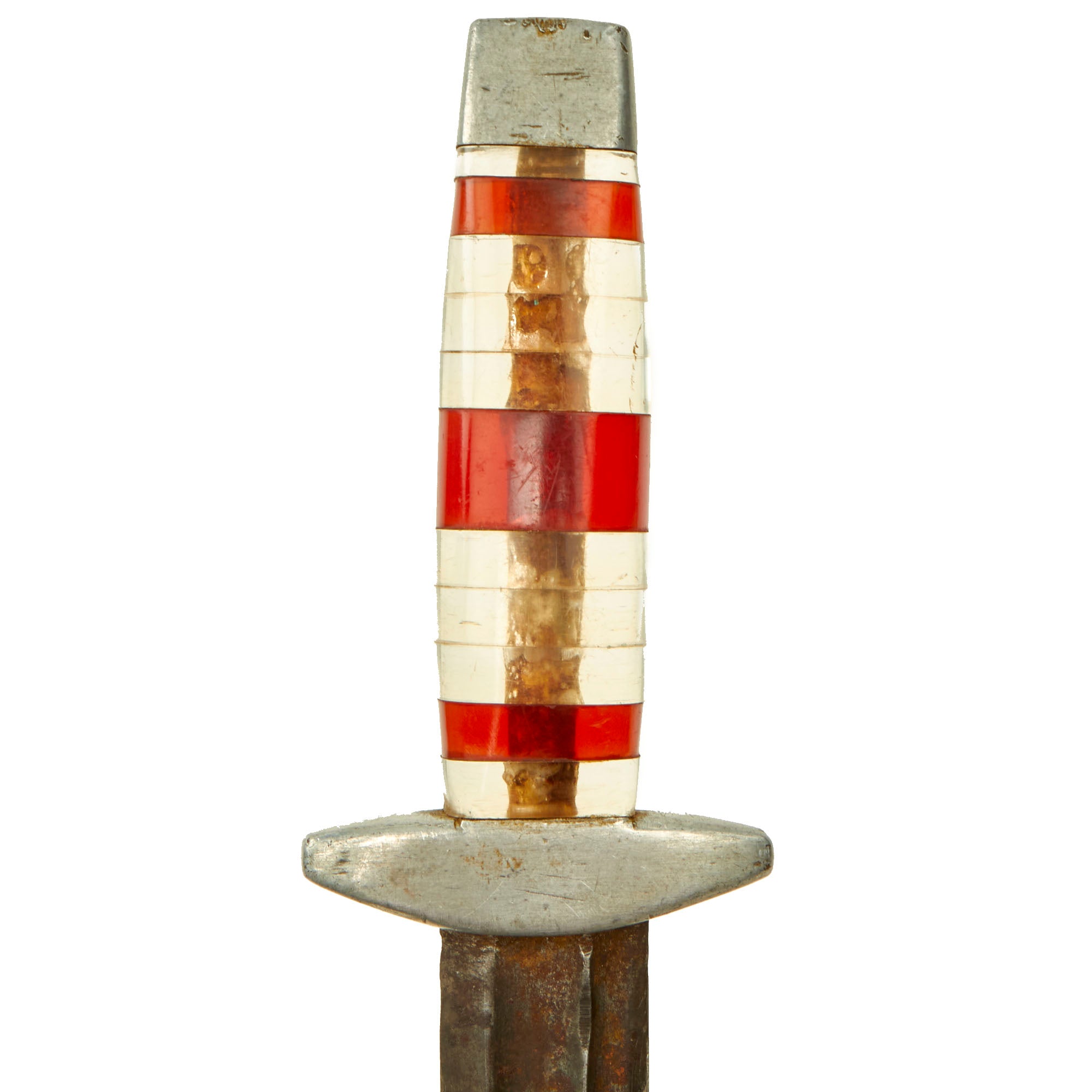The handle of this knife is made from layers of stacked plastic, mostly clear, with a few red layers as decoration as well as aluminum. Both the pommel and crossguard are made from machined aluminum pieces. Condition is quite good, though the blade definitely suffered minor corrosion at some point, which was then cleaned away, probably before it was made into a custom knife.