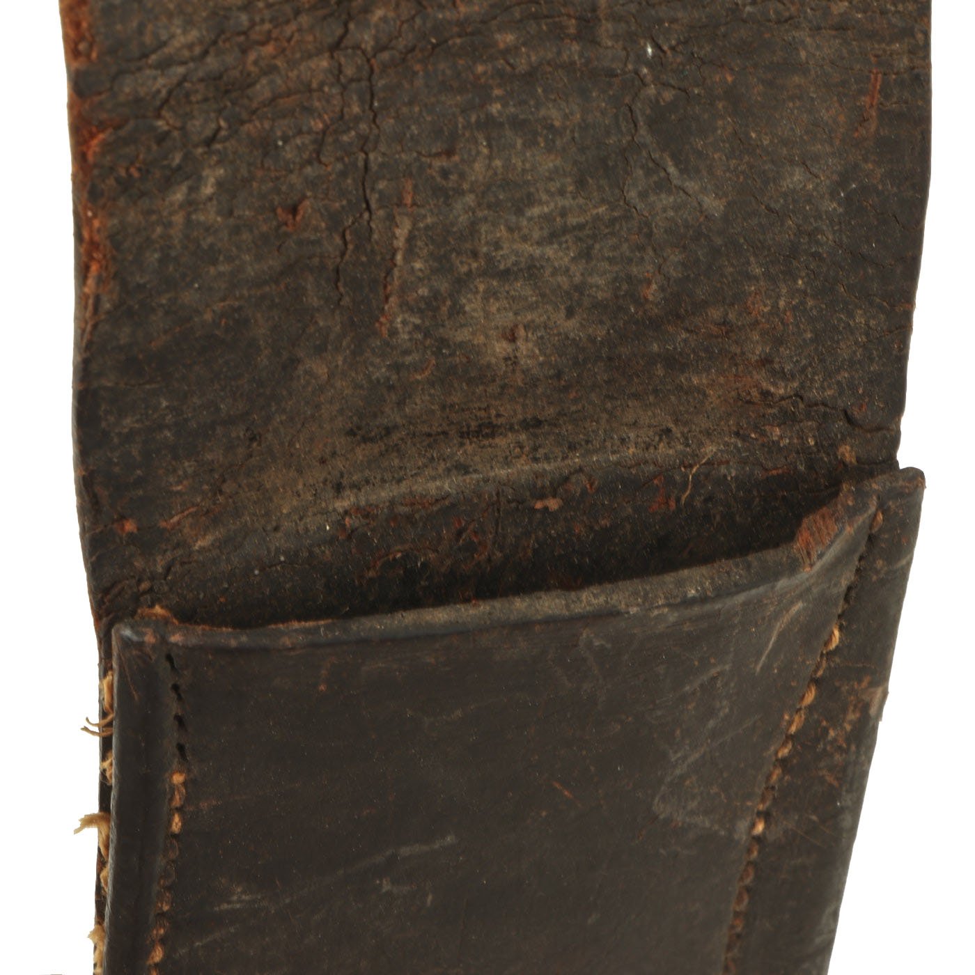 The hilt, grip and knuckle bow are cast metal, painted black, while the "Sinbad" scimitar style blade is made of steel. The blade measures 7" by 2" wide at its widest point, and the knife measures 12 5/8" inches overall. The knife comes complete with leather sheath, which has a belt loop and is definitely custom made specifically for the knife. Condition of both is very good, with a lovely service worn patina. The stitching has pulled out some from the scabbard, as shown in the pictures.