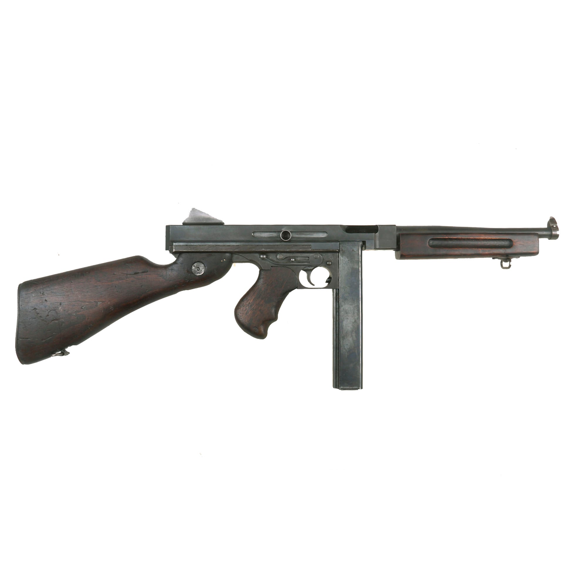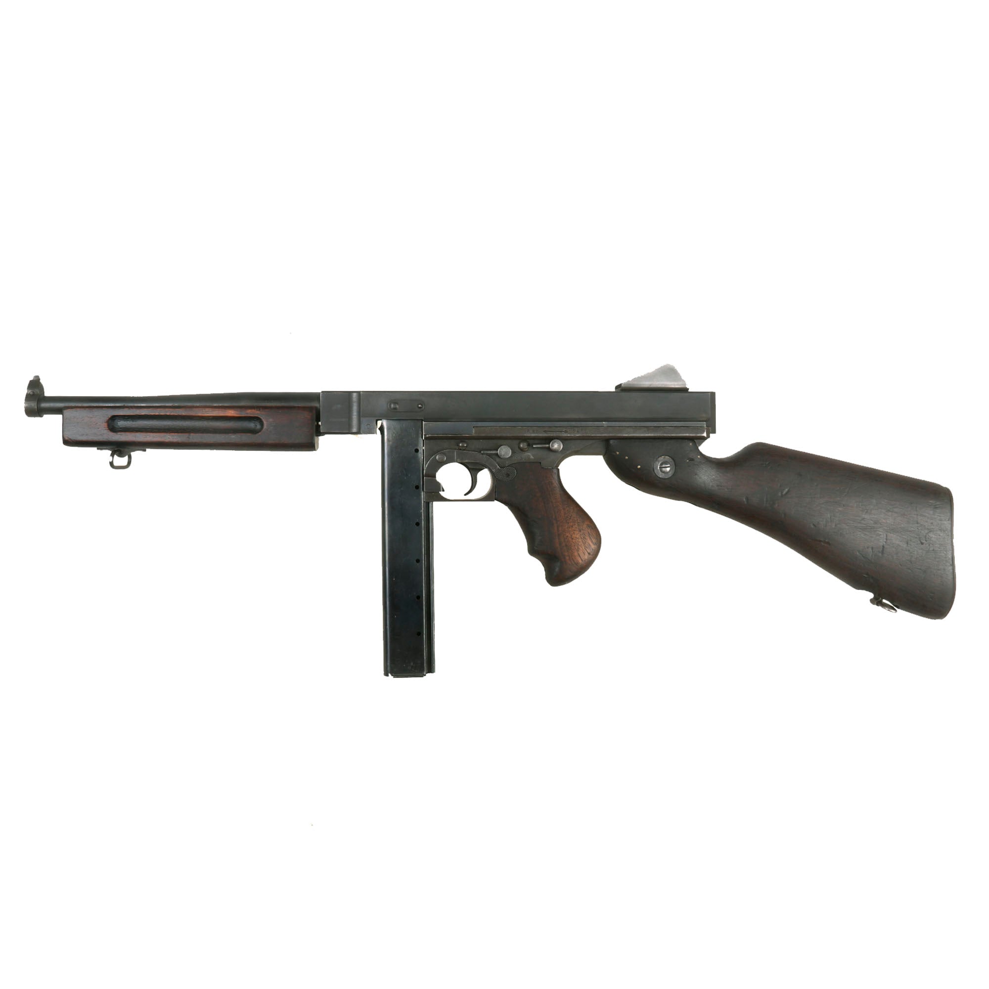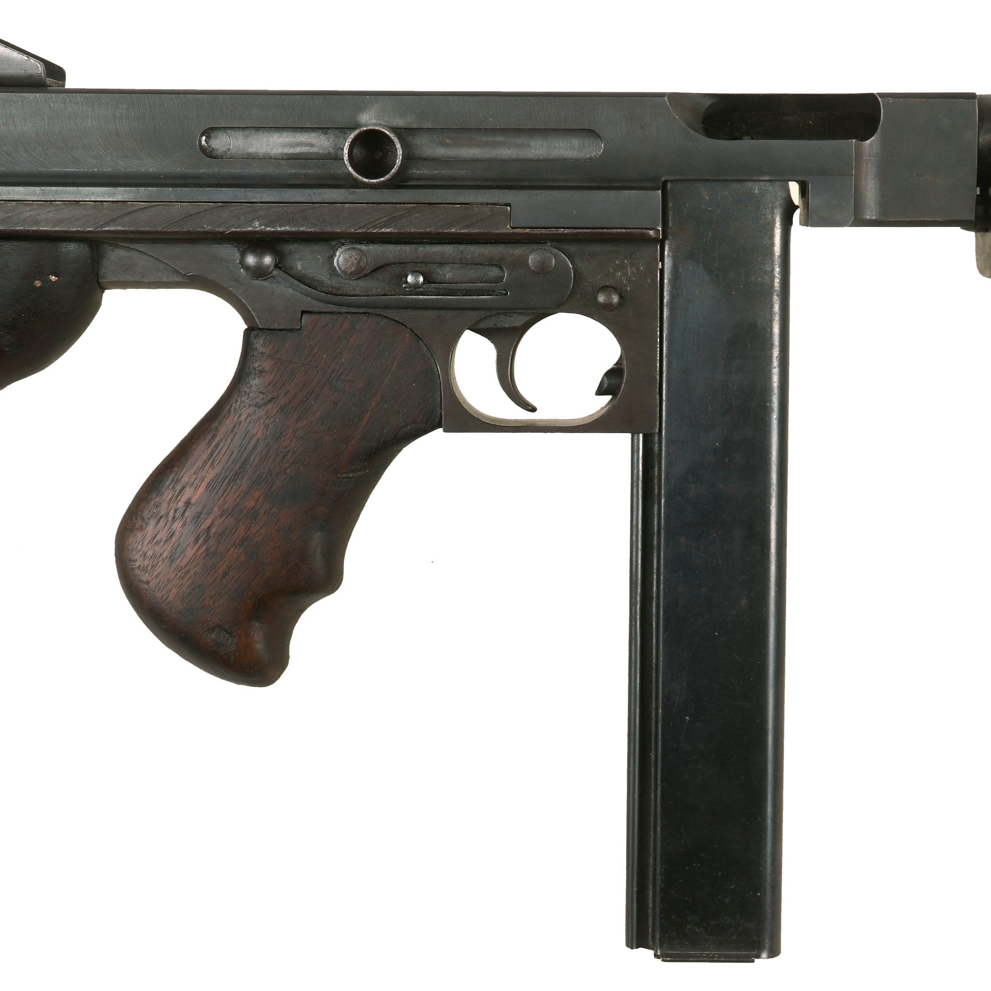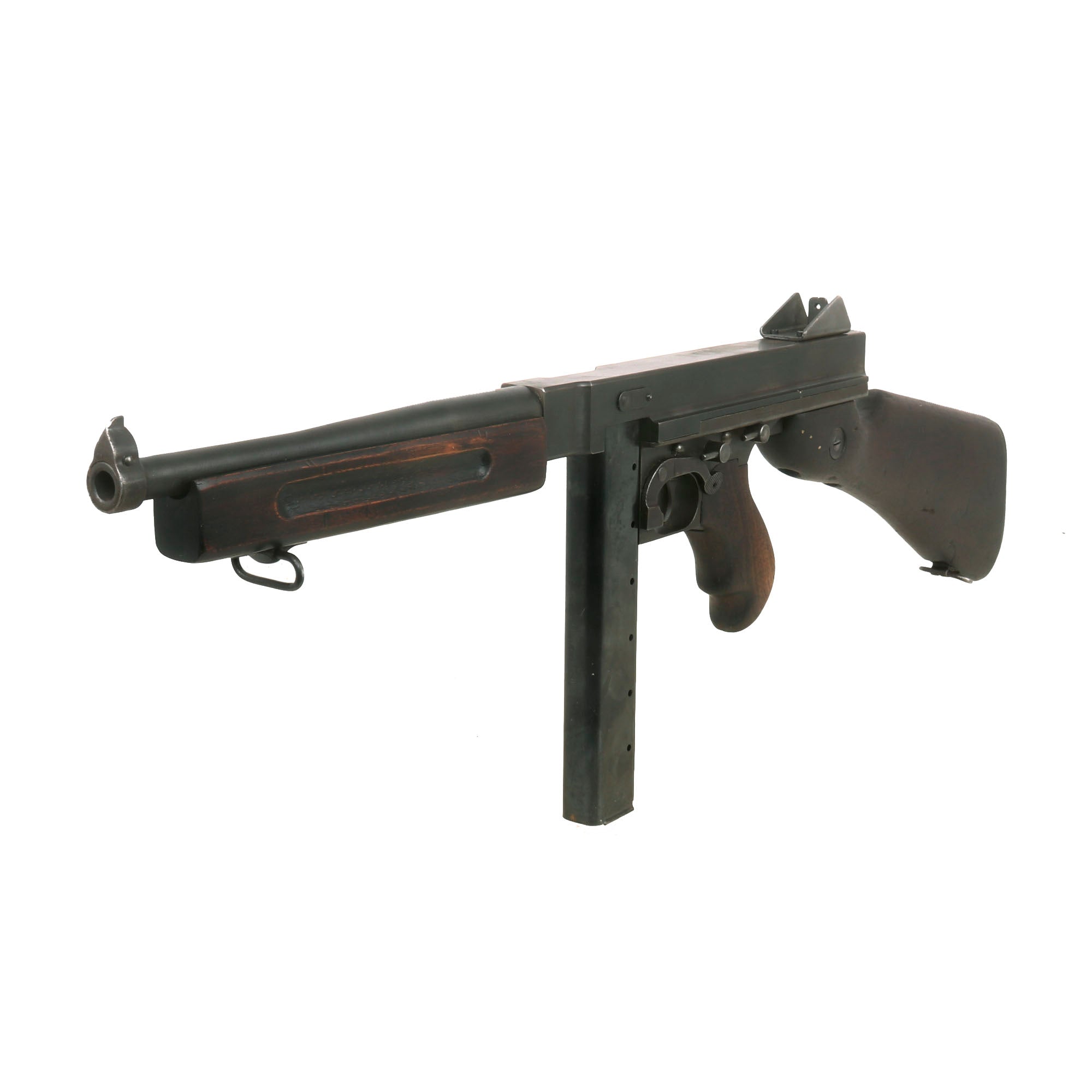 Original Item: Only One Available. This is a magnificent WWII Thompson M1 display submachine gun built from excellent genuine WWII parts and reassembled on a beautiful non-firing BATF compliant newly made Solid steel non-firing dummy receiver, which is mostly solid steel. As the receiver is completely inert, that makes this 100% legal to own without a license of any kind. Every part on this display gun is original WWII manufacture other than the receiver. The dummy receiver in this case is completely unmarked and non-firing.