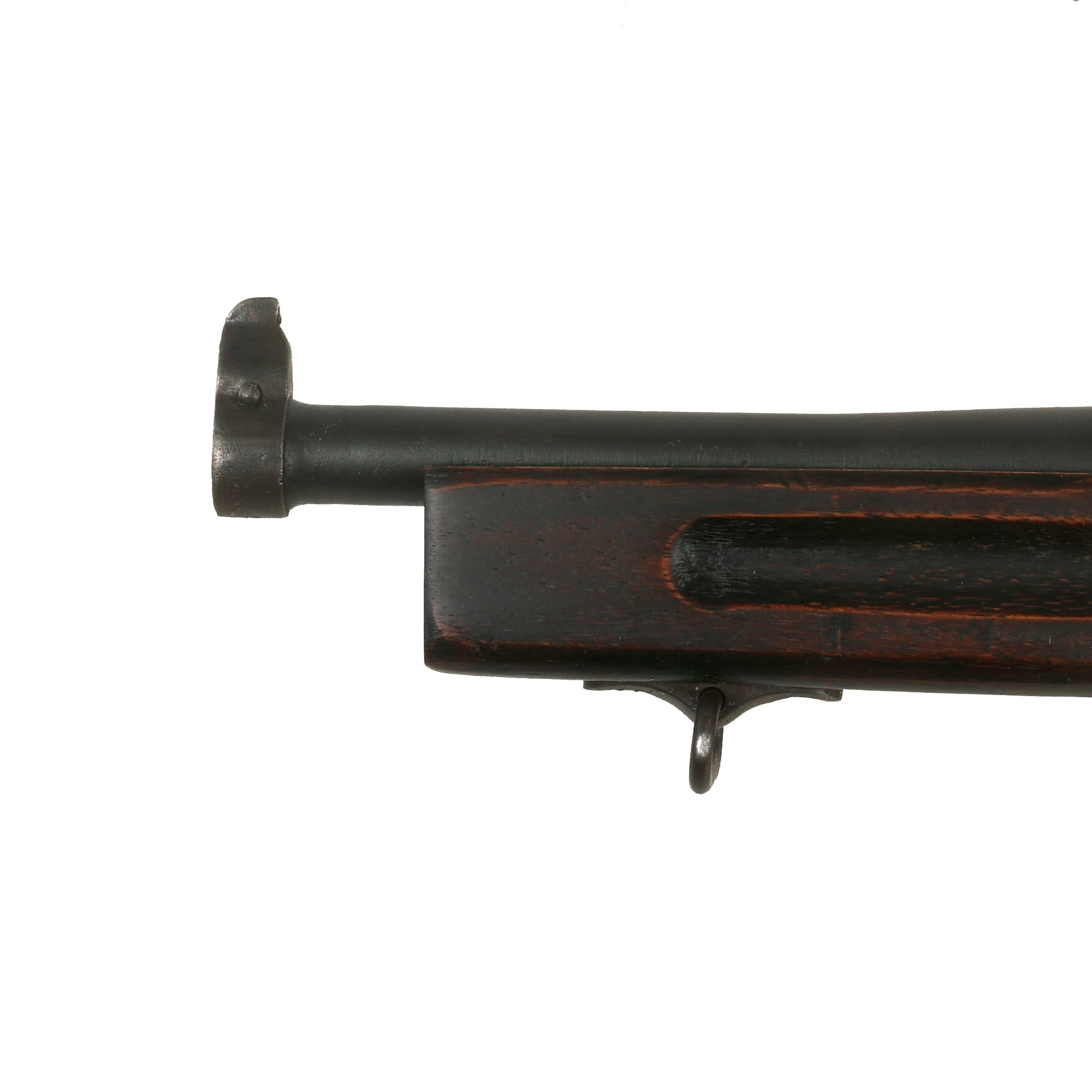 This example is is typical of later WWII production, probably made during the change over to the M1A1 type. We used to have these regularly, but sadly those days are long gone, and all Thompson parts have become scarce. This example has most parts Parkerized, typical for the M1A1, as it was seen as a more resilient finish than bluing. The stocks are in good shape, showing wear and damage form use, as well as some period repairs.