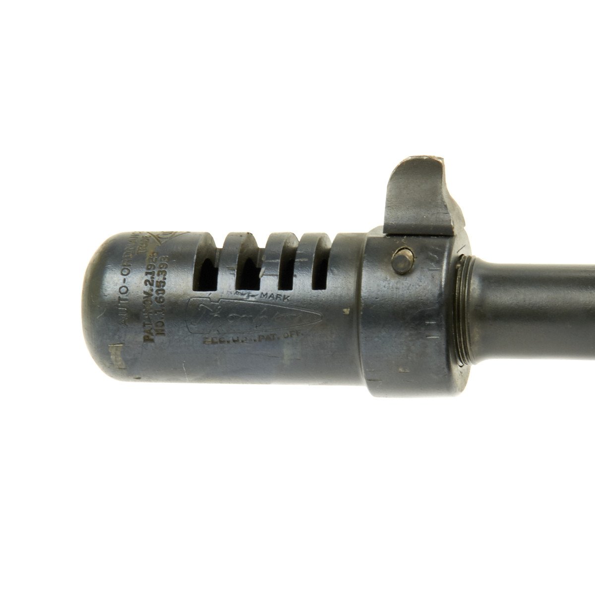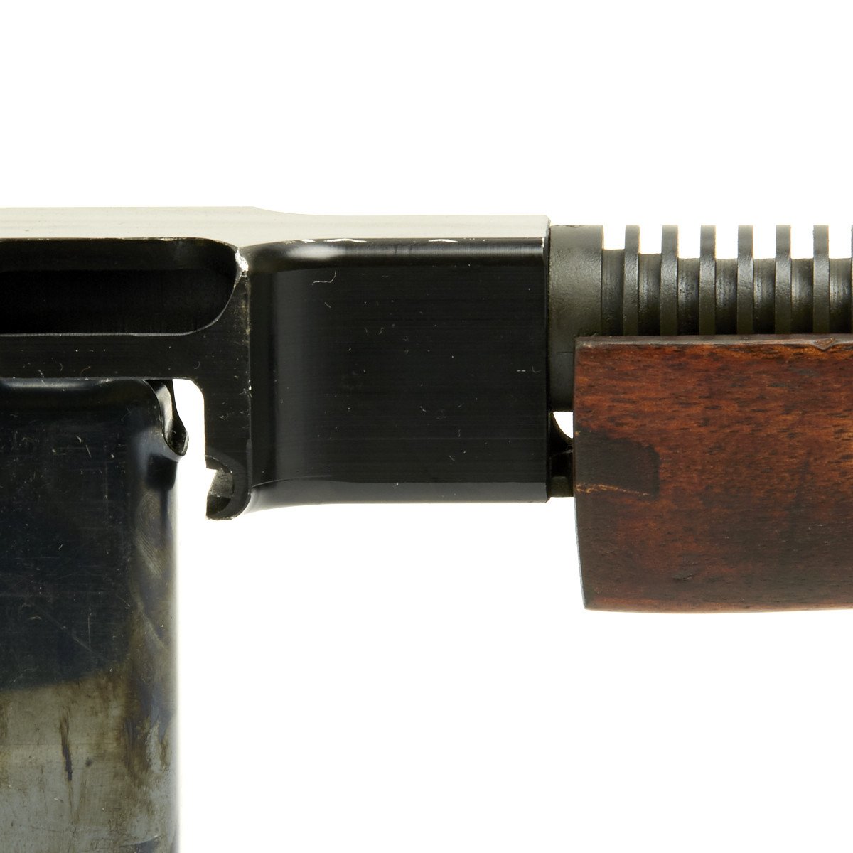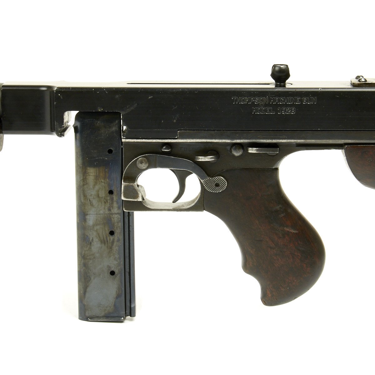 The Thompson 1928 sub machine gun is perhaps the most recognizable firearm of World War II, made famous by the Airborne Troops of the 101st and 82nd Airborne Divisions. This military model differs from the original commercial model in its 20 round magazine and its horizontal foregrip. Though heavy by today's standards, the weight helped control the .45 caliber bursts when operated on full automatic.