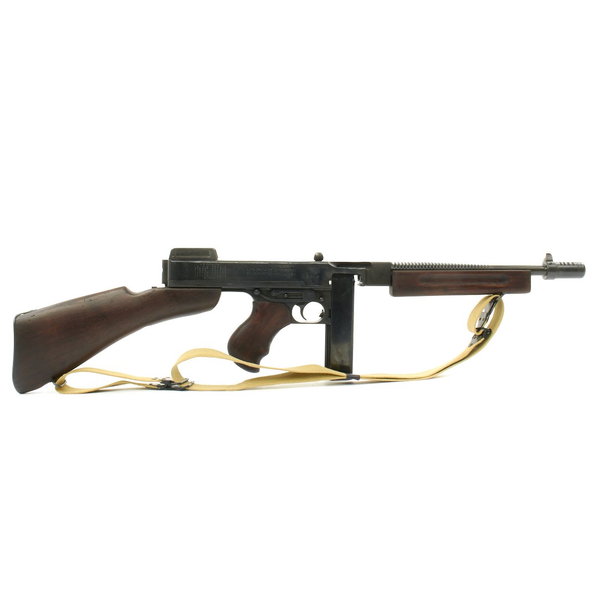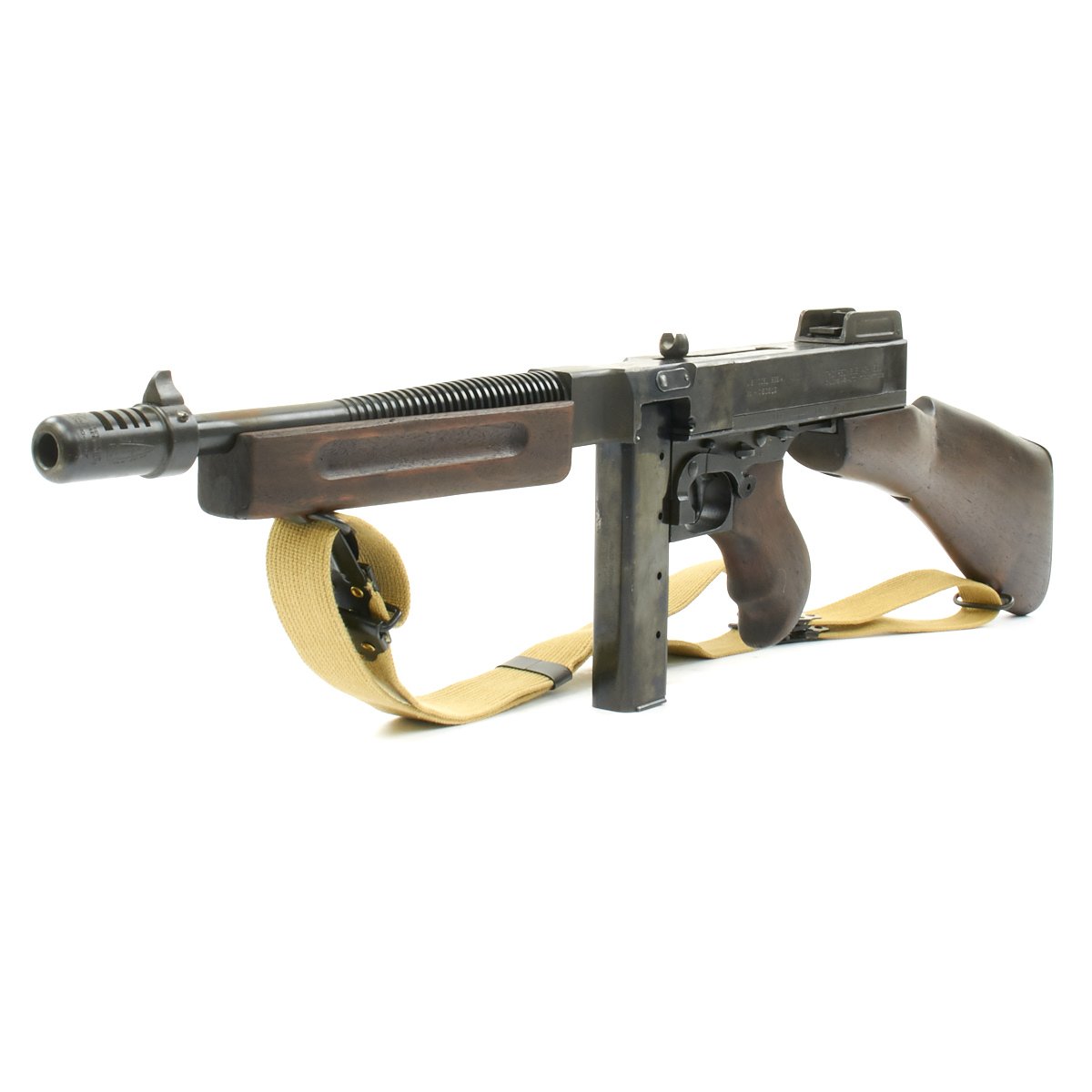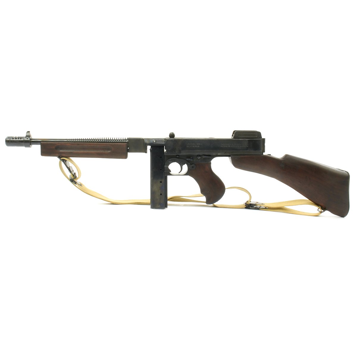 Original Item: Only One Available. This is a magnificent display gun built from excellent genuine WWII Thompson M-1928 parts and reassembled with a beautiful non-firing BATF approved original reassembled WWII issue Thompson receiver. Every part on this display gun is original WW2 manufacture other than 2 inches of the receiver (as required by BATF). This example has also comes with one of our reproduction Thompson Kerr adjustable slings.