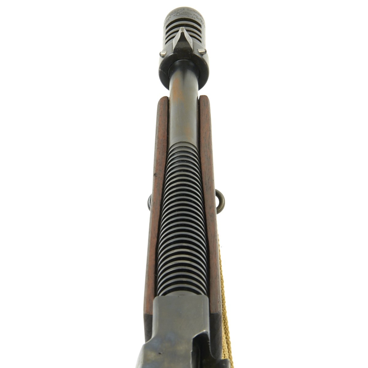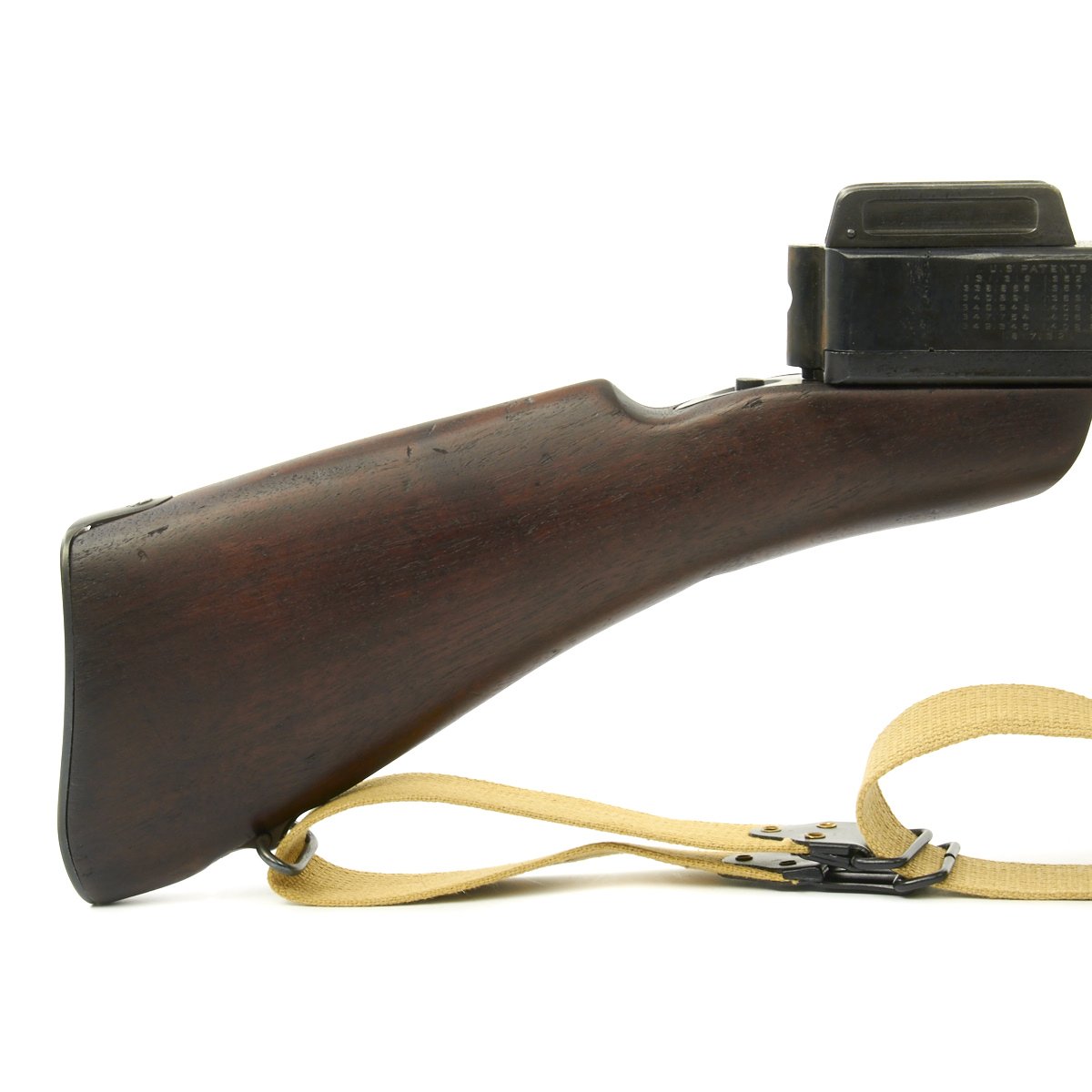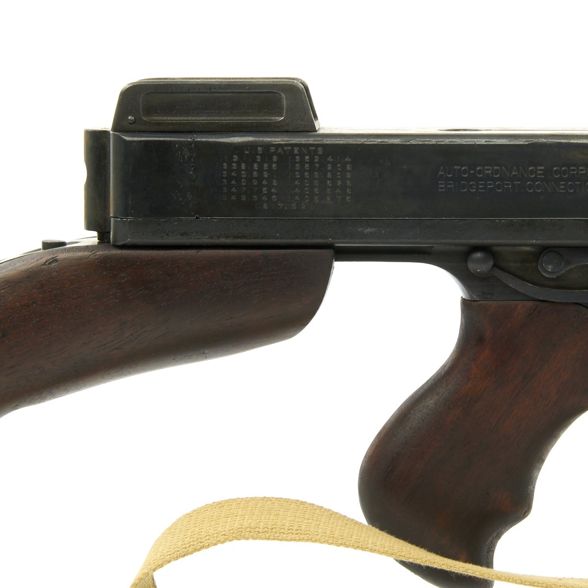 Original Item: Only One Available. This is a magnificent display gun built from excellent genuine WWII Thompson M-1928 parts and reassembled with a beautiful non-firing BATF approved original reassembled WWII issue Thompson receiver. Every part on this display gun is original WW2 manufacture other than 2 inches of the receiver (as required by BATF). This example has also comes with one of our reproduction Thompson Kerr adjustable slings.