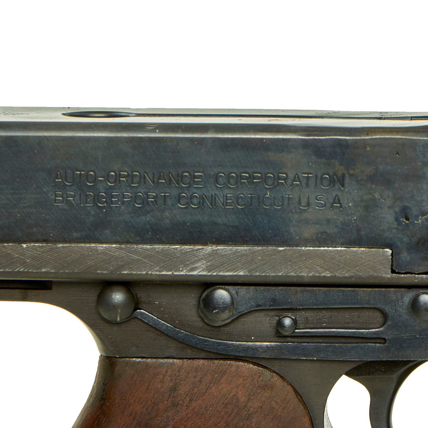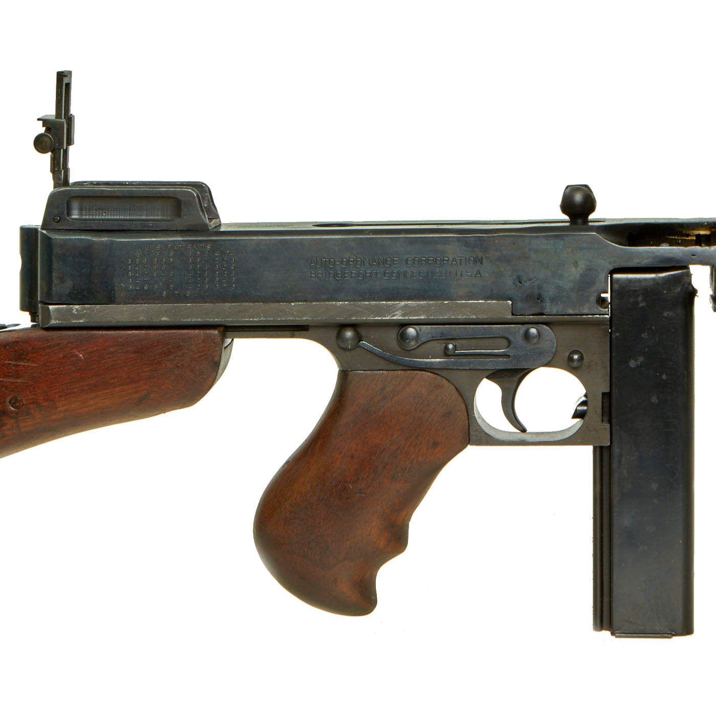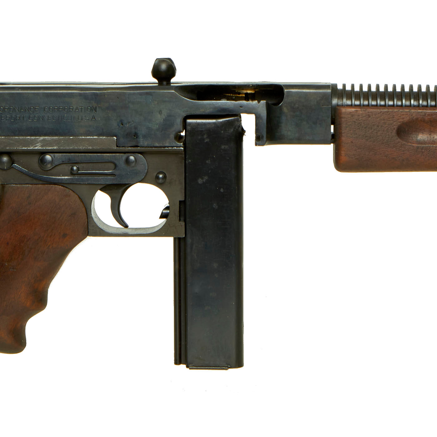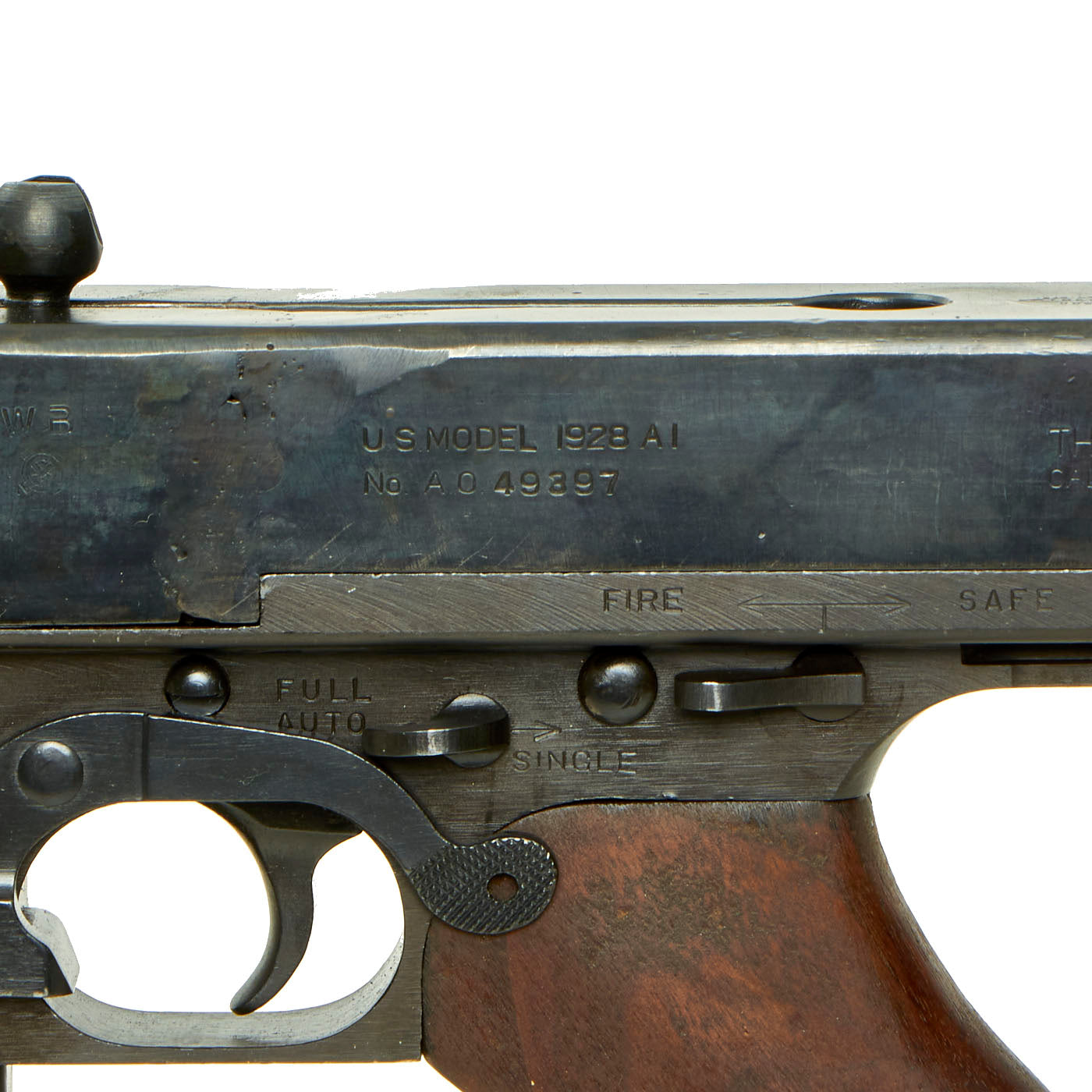 - 80% original reassembled ATF approved non-firing receiver (complete with original arsenal markings!) - Serial No. A.O. 49397, indicating production by Auto-Ordnance, the designer of the Thompson Submachine Gun.