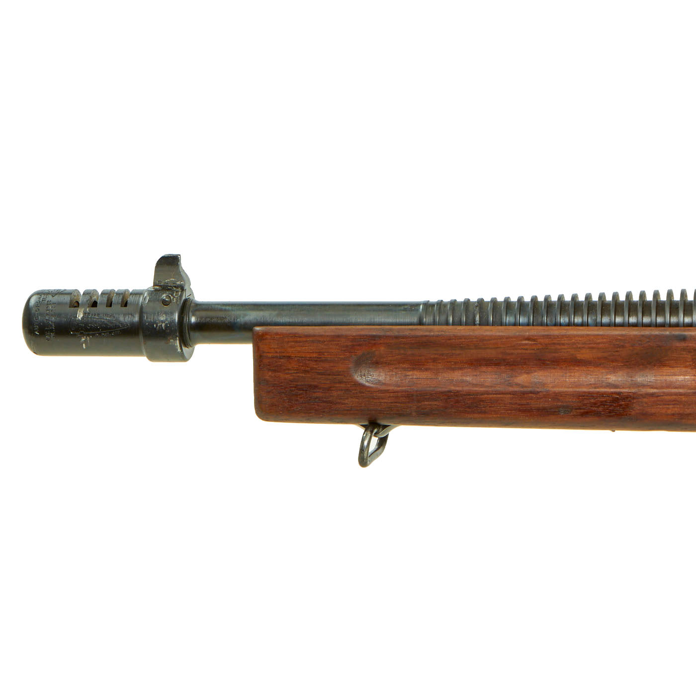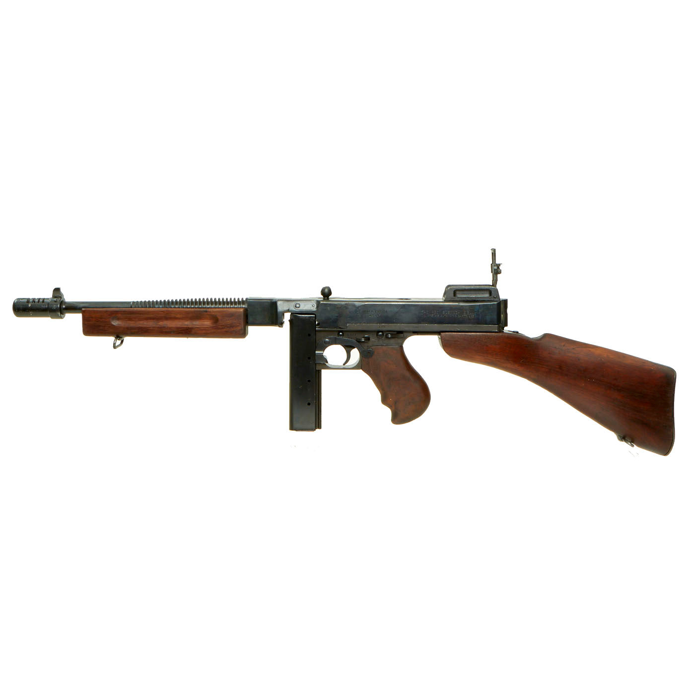 This example is typical of the early ear issue Thompson M1928A1, with the more delicate adjustable Lyman Sight, and 20 round magazine. It also has the early style buttstock, without the reinforcement bolt, and correct machined sling swivel mounts. It has beautifully finished walnut furniture that has that red brown color only achieved after years of age.
